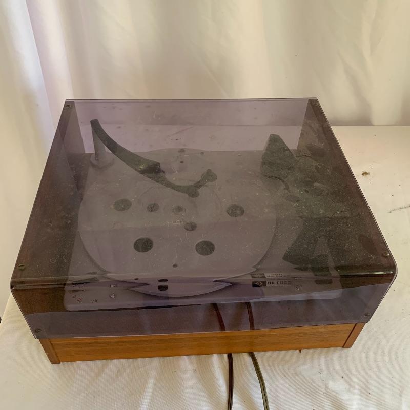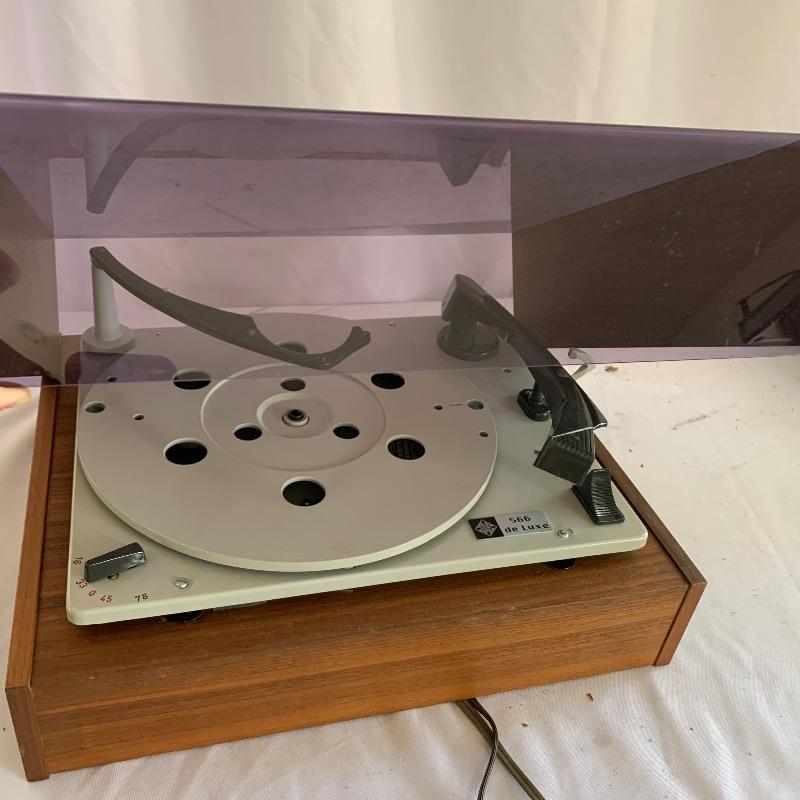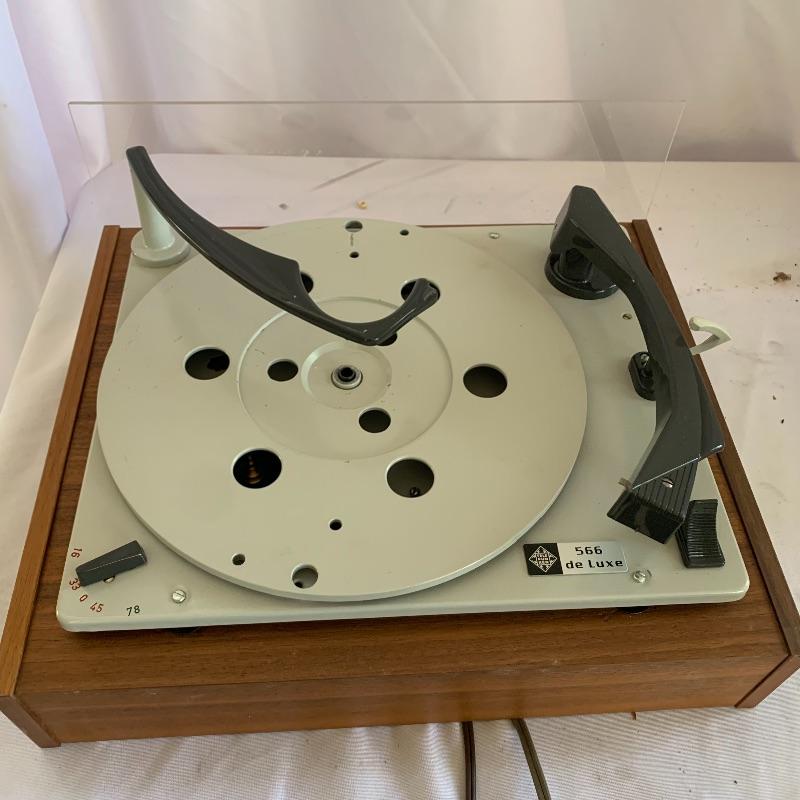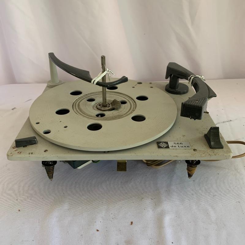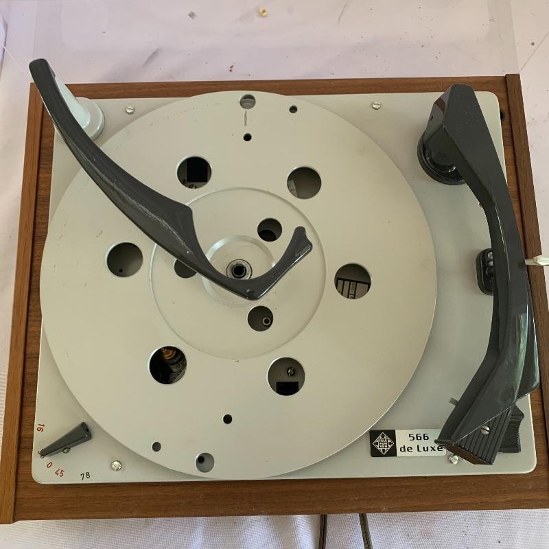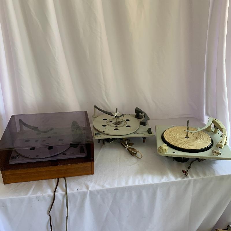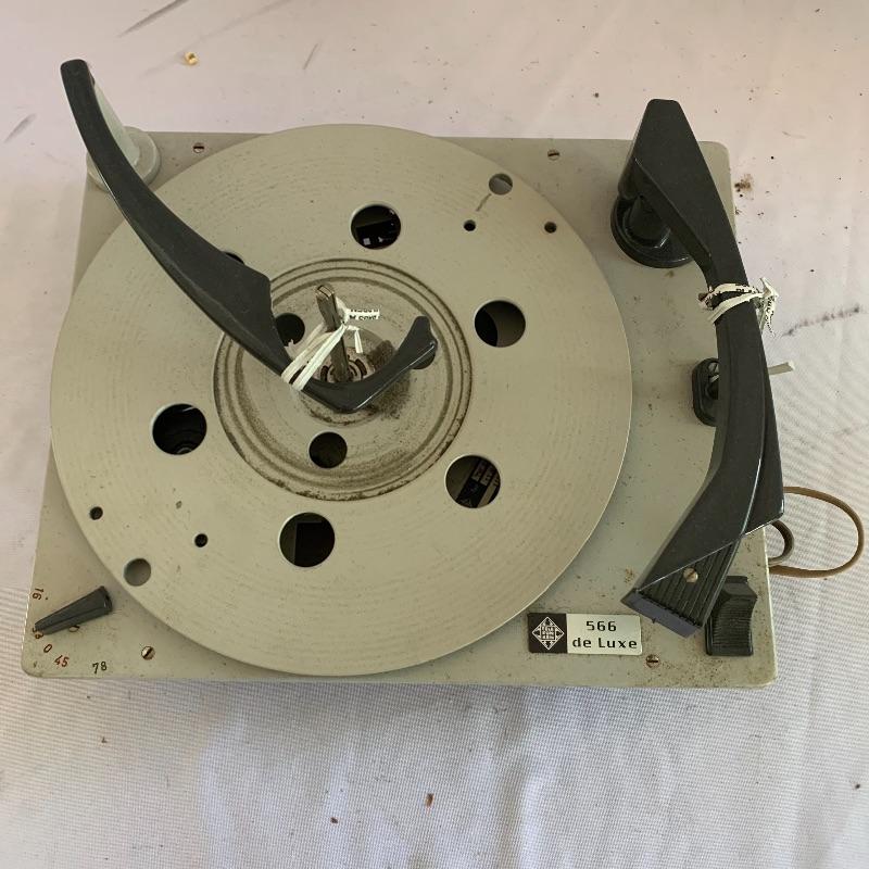 This lot includes one Telefunken 566 De Luxe turntable with a box and lid, one Telefunken 566 De Luxe turntable without the box and lid, and one Stromberg-Carlson turntable without the box and lid. The Telefunken 566 De Luxe with the lid and box had a broken stylus (see photos). The lid detaches from the box and the turntable is not fully mounted in the box and can be removed. It measures about 14in x 15in x 7in. The Telefunken 566 De Luxe turntable without the box and lid has a cable that is severed. The tonearm is broken (see picture). It measures about 11in x 13in. The Stromberg-Carlson measures about 14in x 12in. Cannot confirm any of the turntables work.