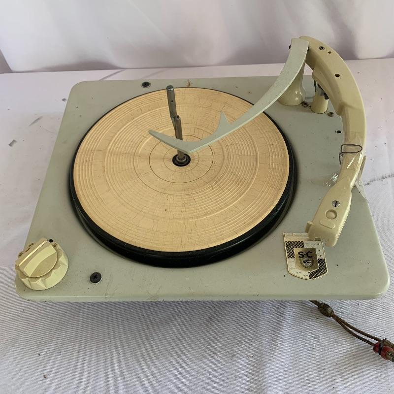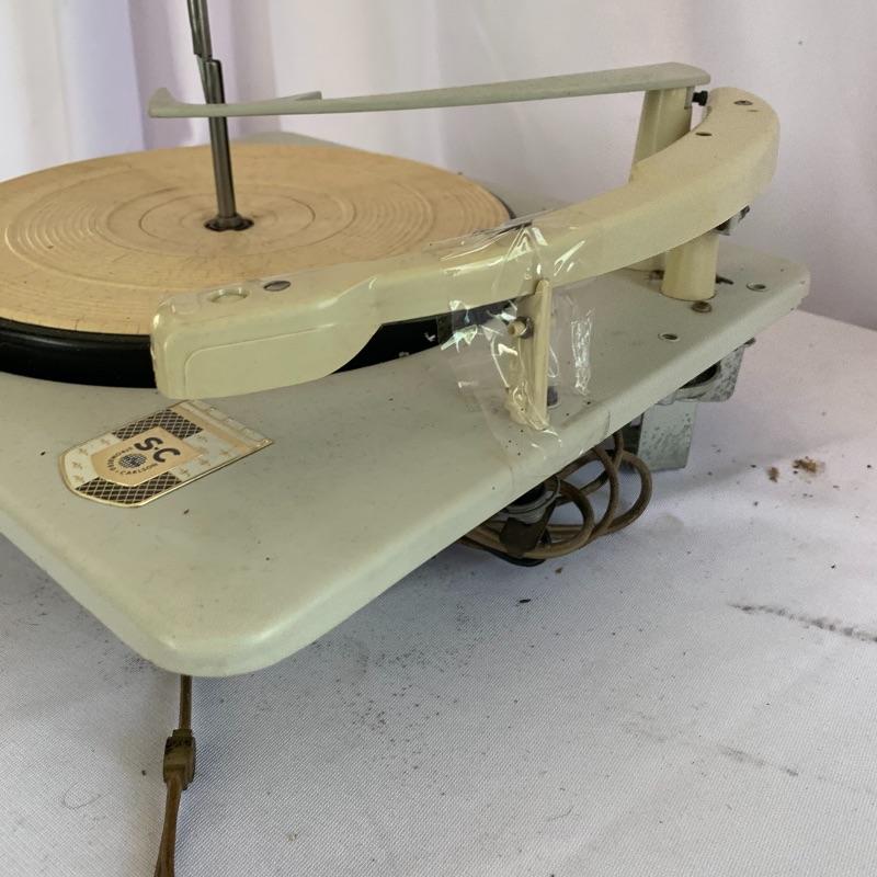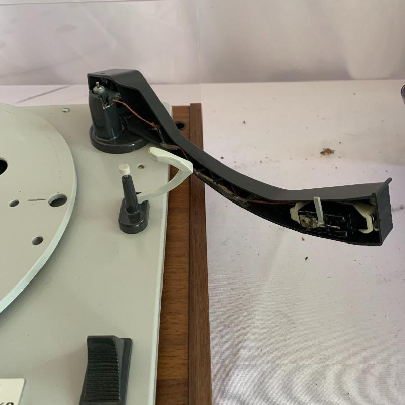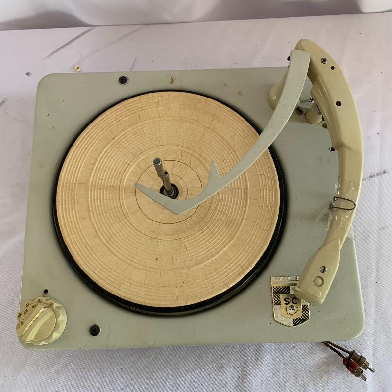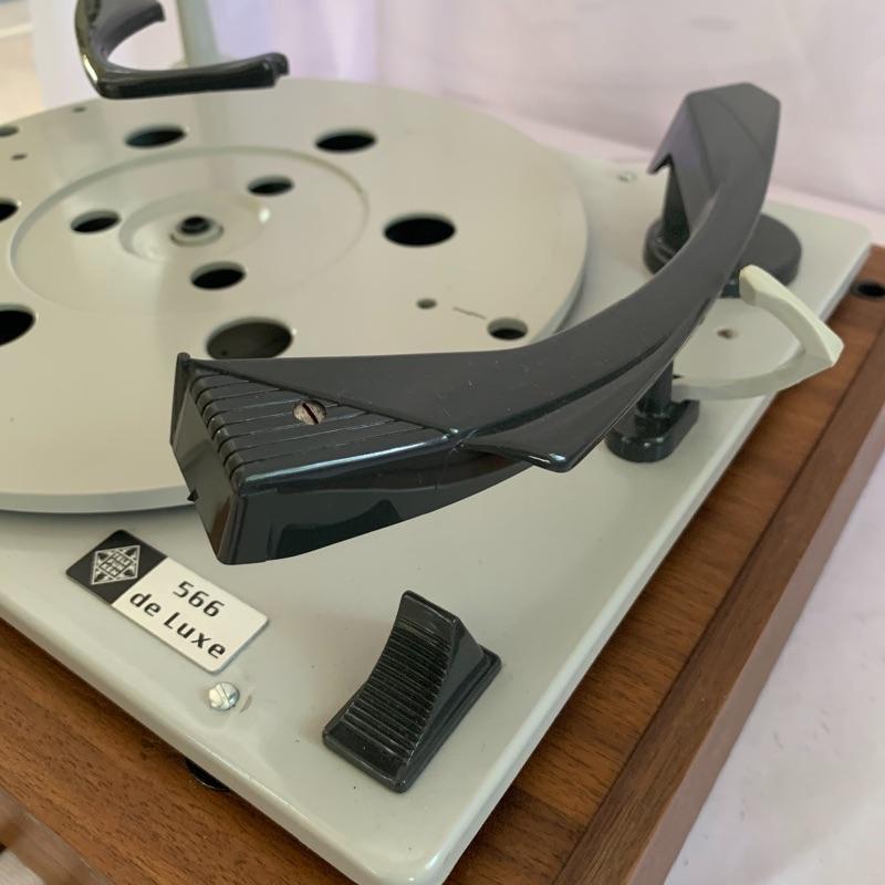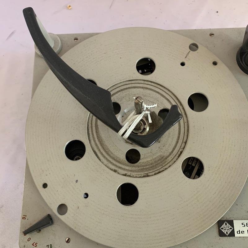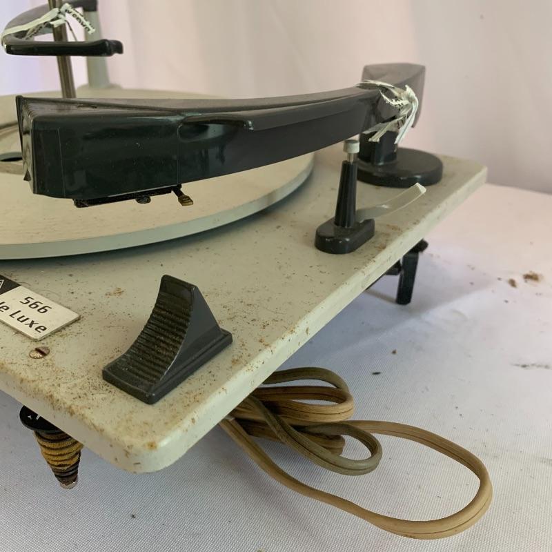 This lot includes one Telefunken 566 De Luxe turntable with a box and lid, one Telefunken 566 De Luxe turntable without the box and lid, and one Stromberg-Carlson turntable without the box and lid. The Telefunken 566 De Luxe with the lid and box had a broken stylus (see photos). The lid detaches from the box and the turntable is not fully mounted in the box and can be removed. It measures about 14in x 15in x 7in. The Telefunken 566 De Luxe turntable without the box and lid has a cable that is severed. The tonearm is broken (see picture). It measures about 11in x 13in. The Stromberg-Carlson measures about 14in x 12in. Cannot confirm any of the turntables work.