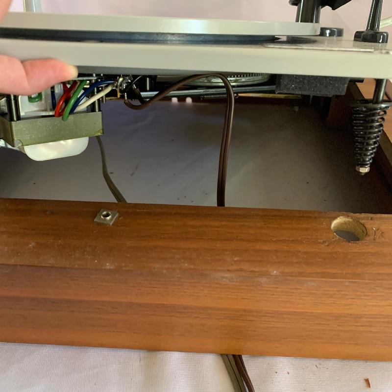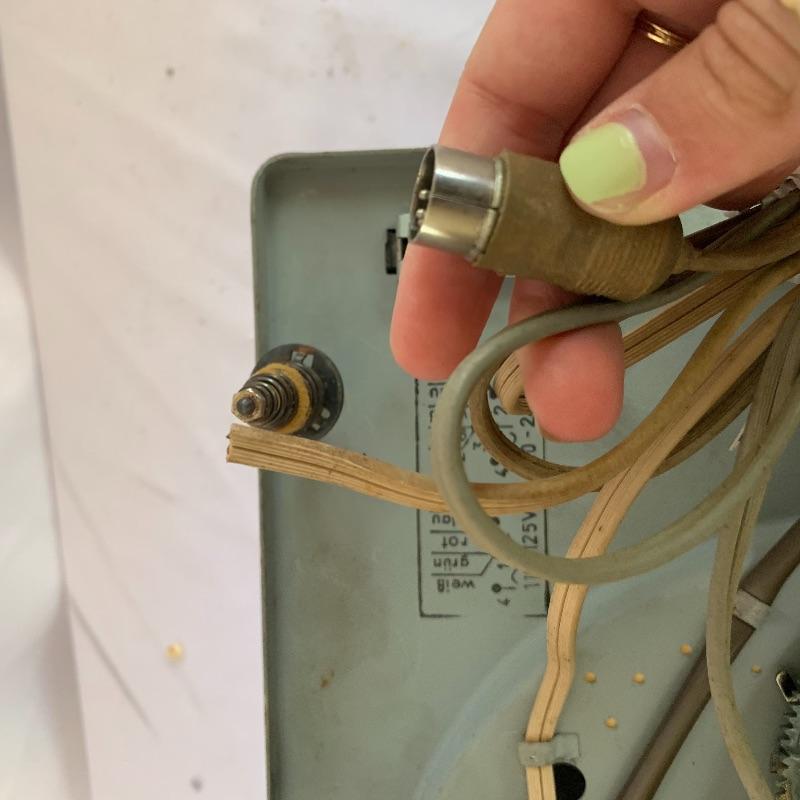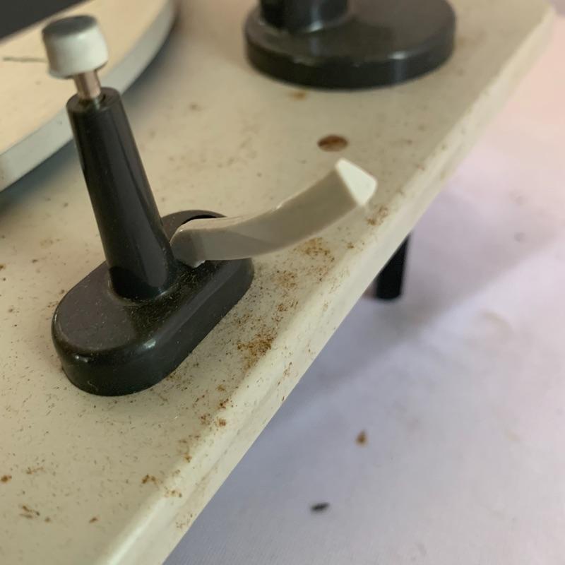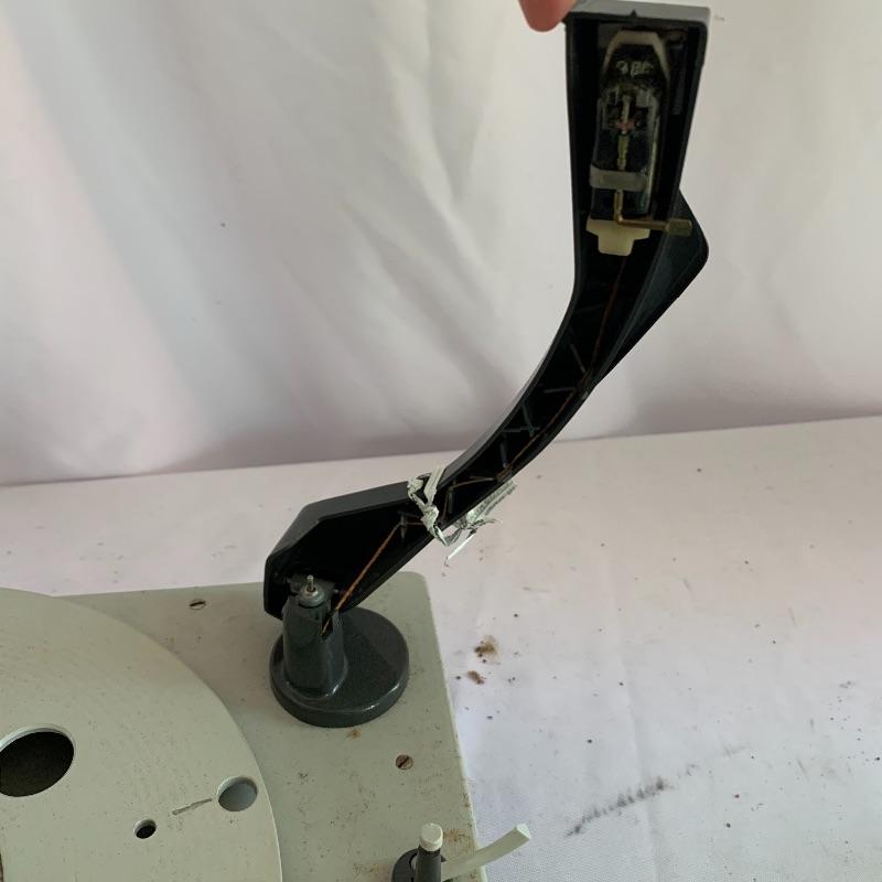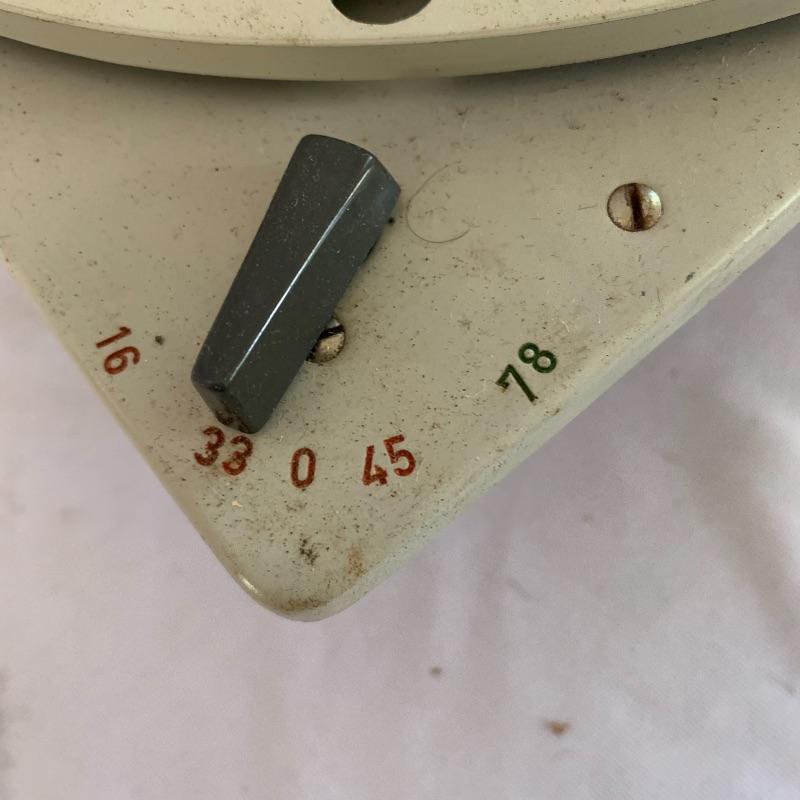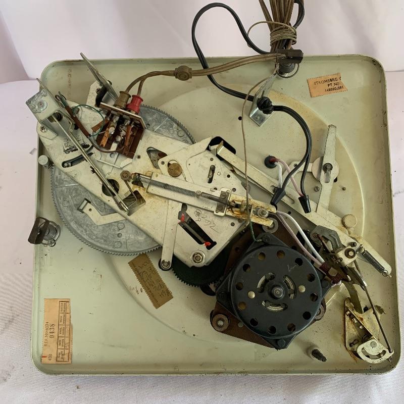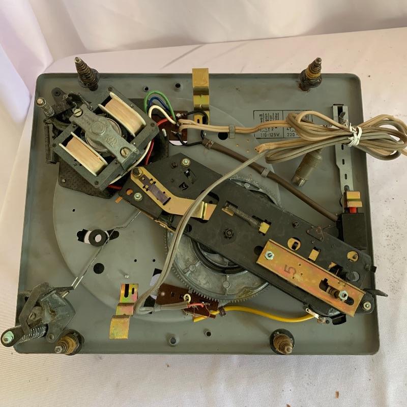 This lot includes one Telefunken 566 De Luxe turntable with a box and lid, one Telefunken 566 De Luxe turntable without the box and lid, and one Stromberg-Carlson turntable without the box and lid. The Telefunken 566 De Luxe with the lid and box had a broken stylus (see photos). The lid detaches from the box and the turntable is not fully mounted in the box and can be removed. It measures about 14in x 15in x 7in. The Telefunken 566 De Luxe turntable without the box and lid has a cable that is severed. The tonearm is broken (see picture). It measures about 11in x 13in. The Stromberg-Carlson measures about 14in x 12in. Cannot confirm any of the turntables work.