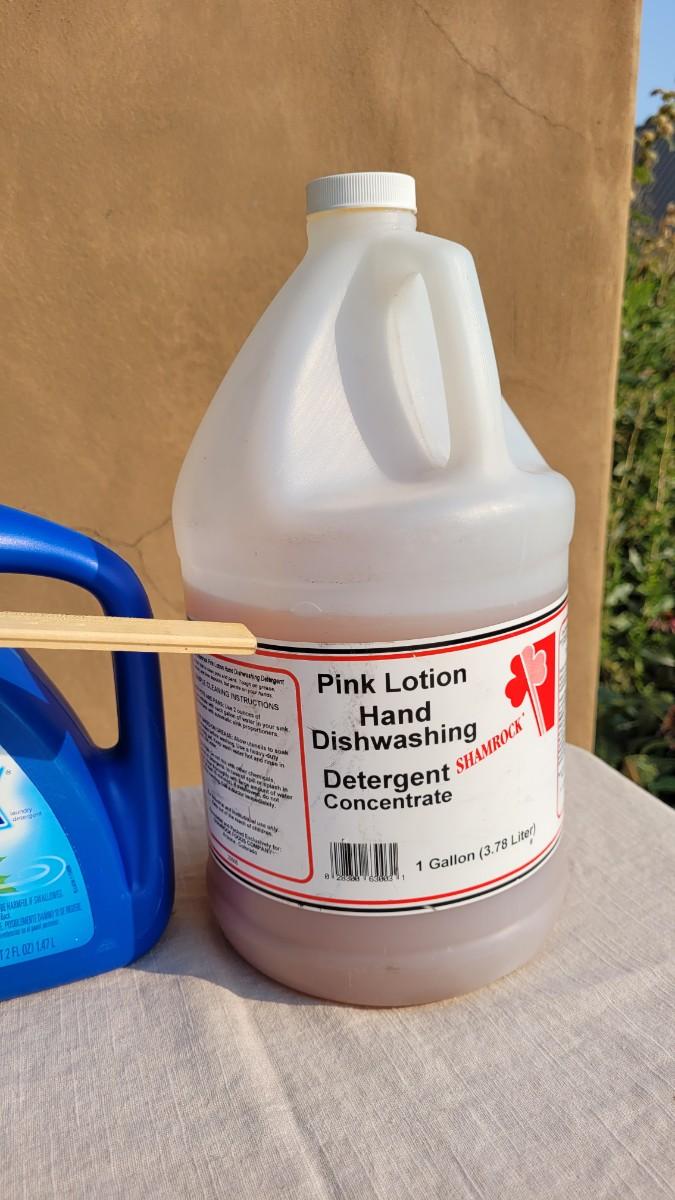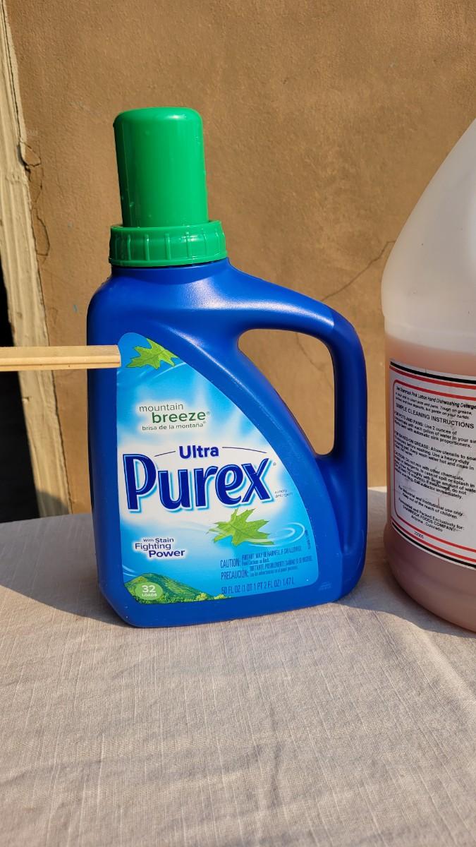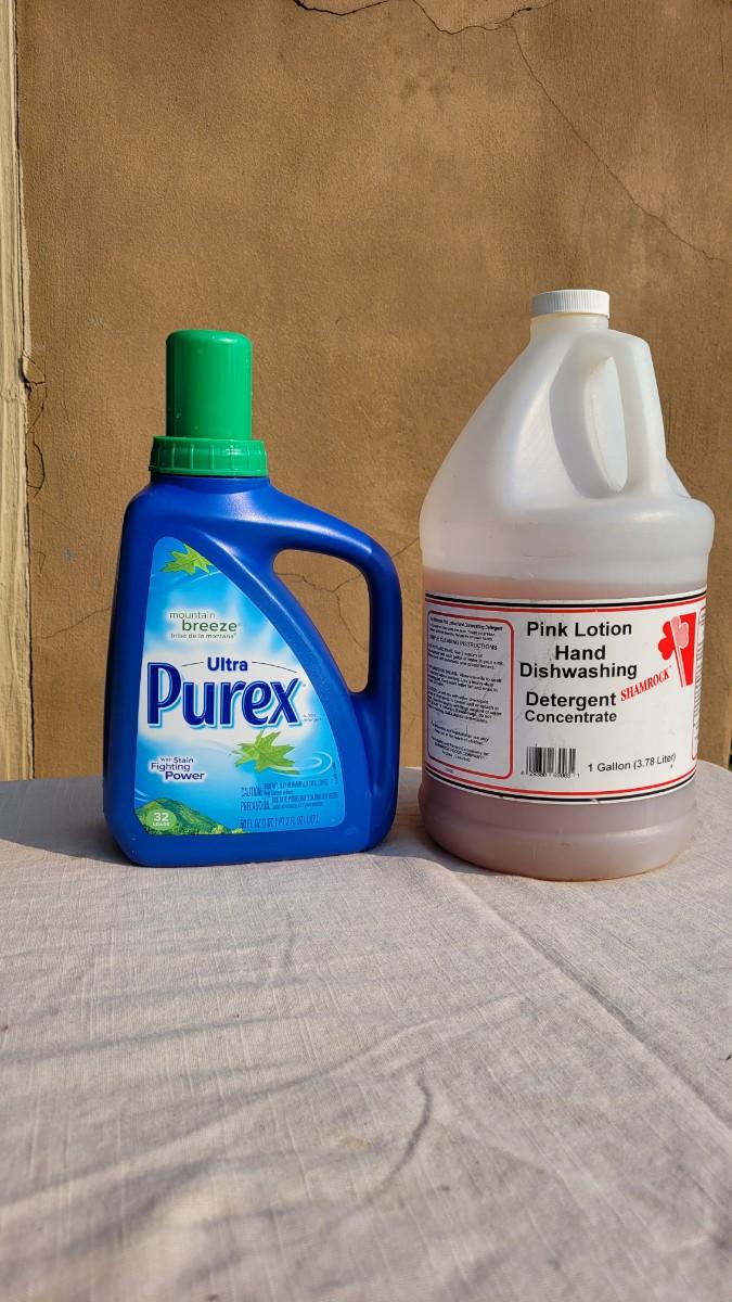 Lot 169: PUREX Laundry Detergent and PINK Hand Soap Concentrate (See Ruler Spot for Level)