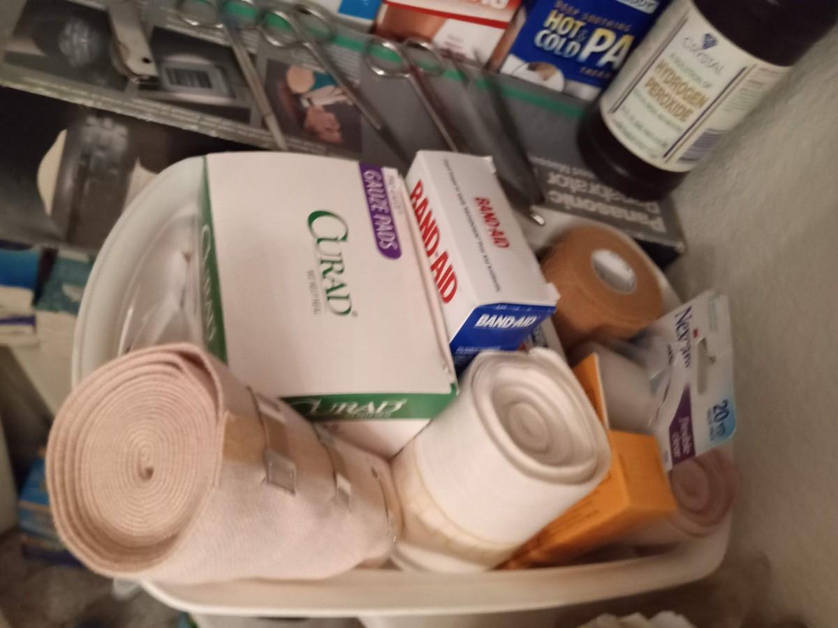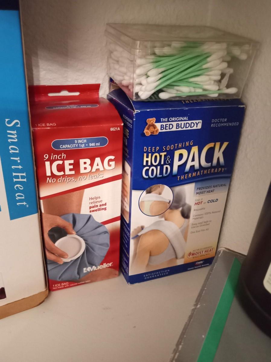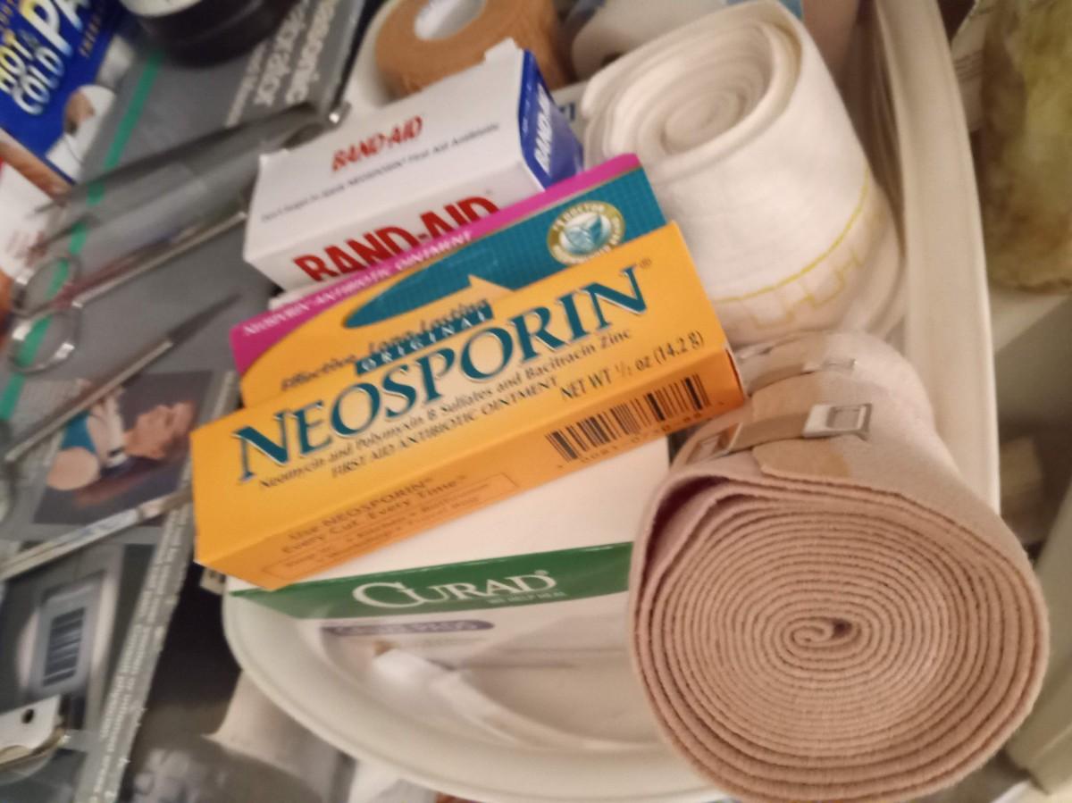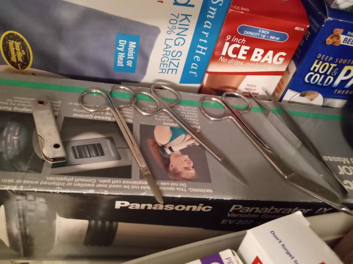 MASSAGING WAND, HEATING PAD, ICE BAG, HOT COLD PACK AND A VARIETY OF BANDAGES AND OINTMENTS