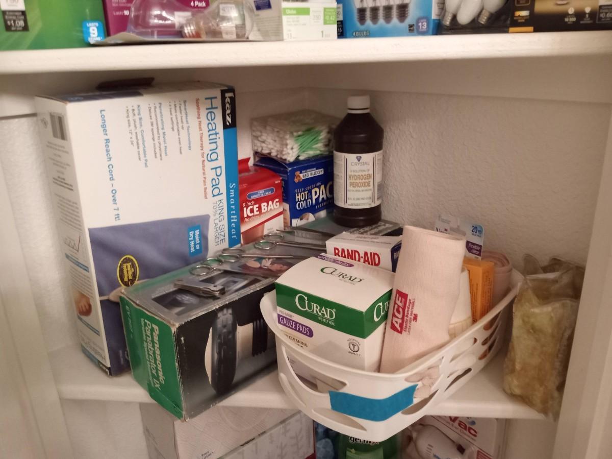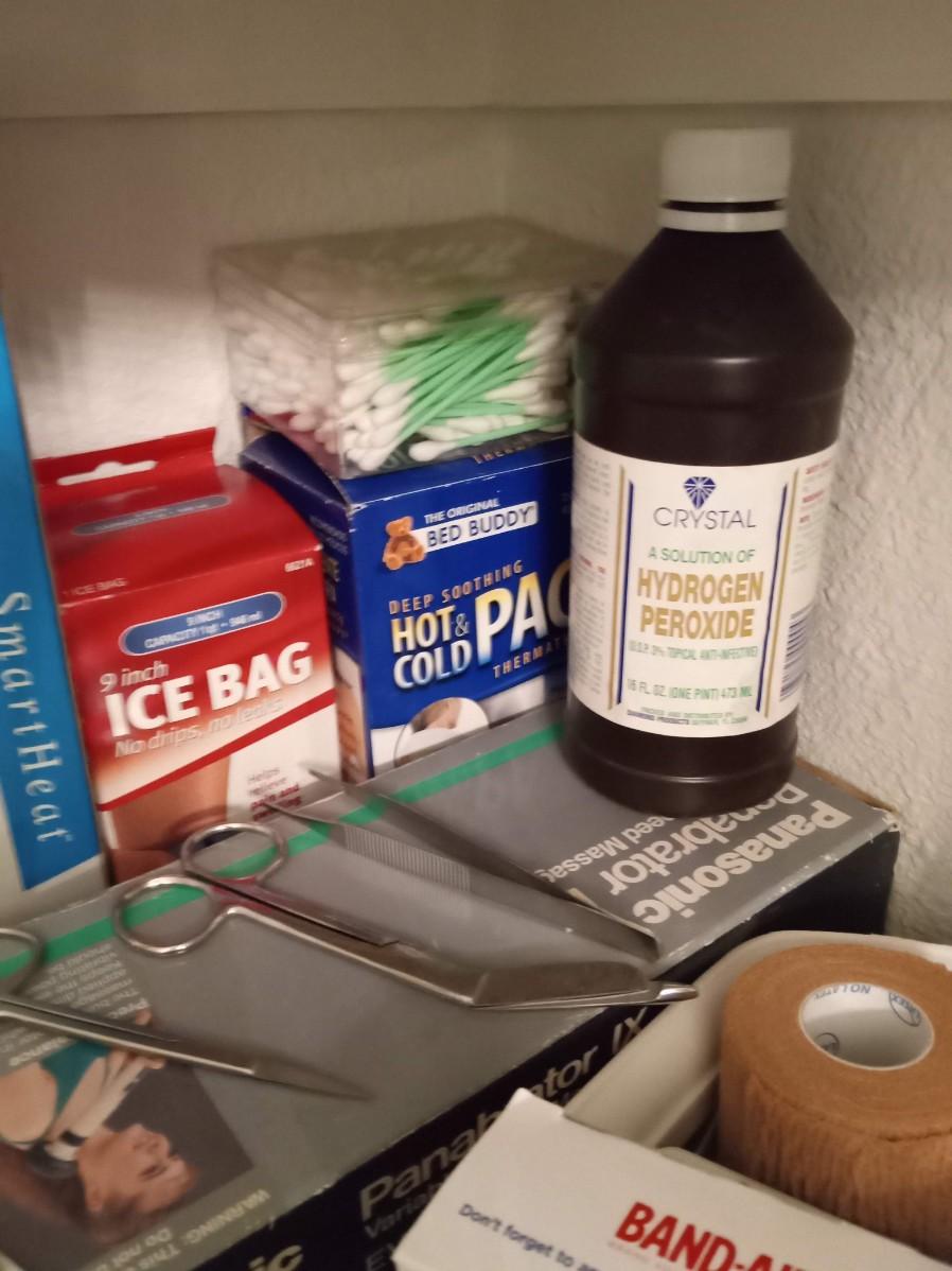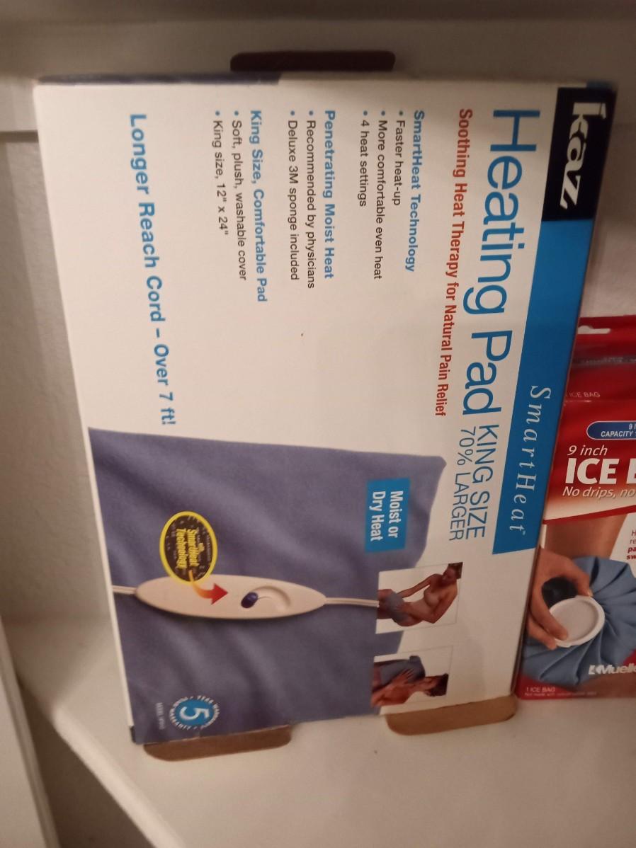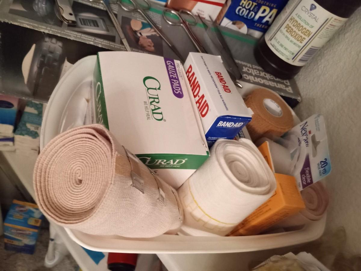 MASSAGING WAND, HEATING PAD, ICE BAG, HOT COLD PACK AND A VARIETY OF BANDAGES AND OINTMENTS