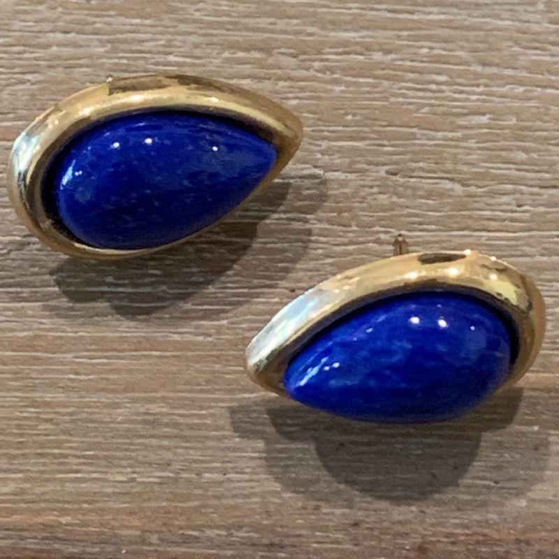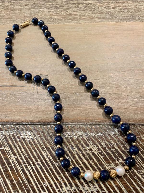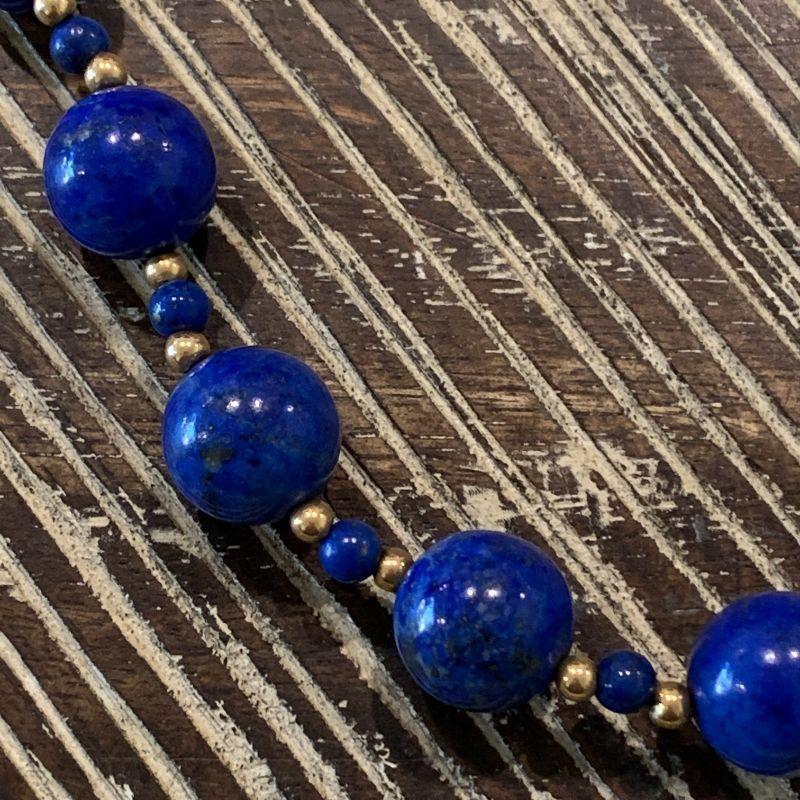 Blue beads with smaller 14K gold & blue spacers. 14K gold clasp. Tear drop pierced earrings with gold bezel & posts. 23" laid out - earrings 3/4"