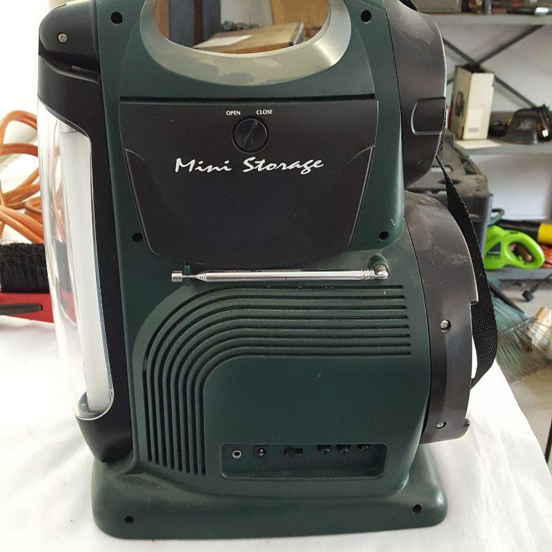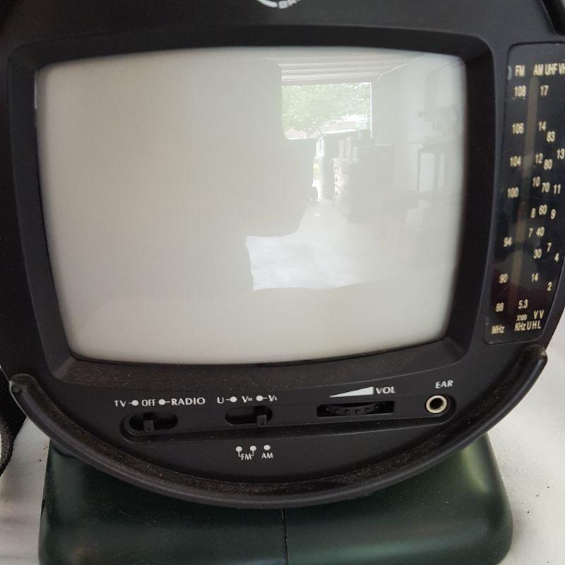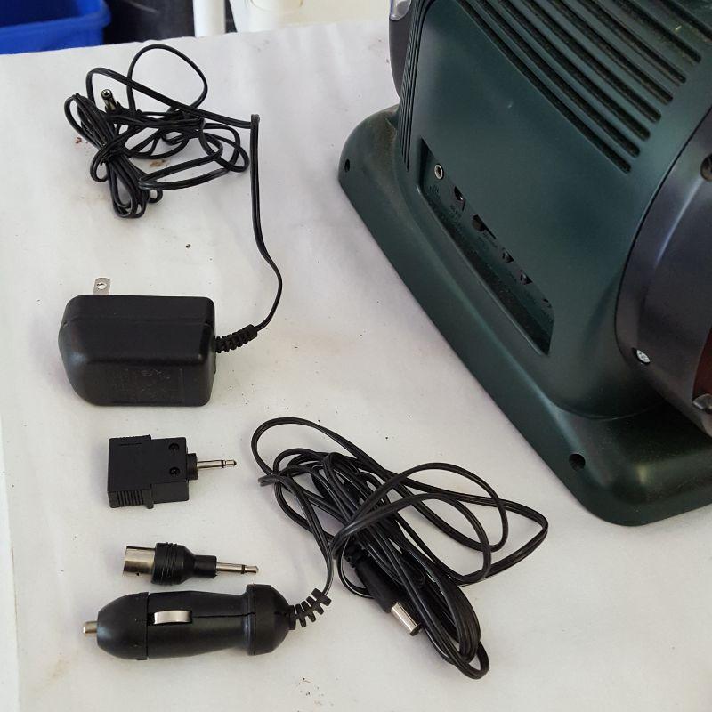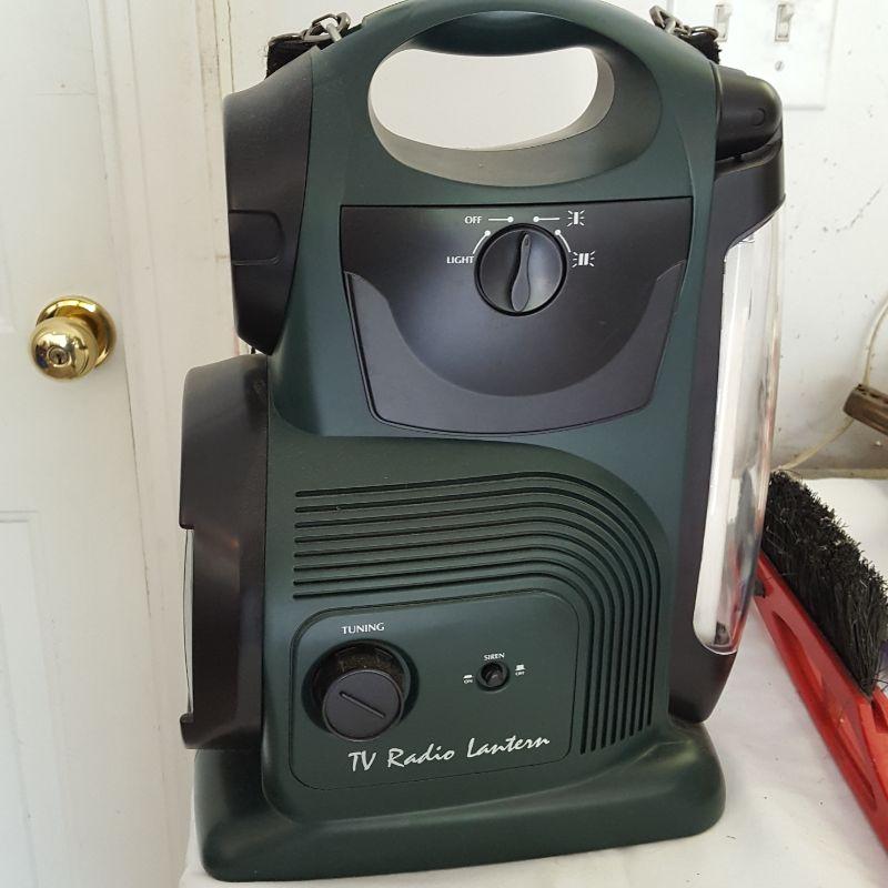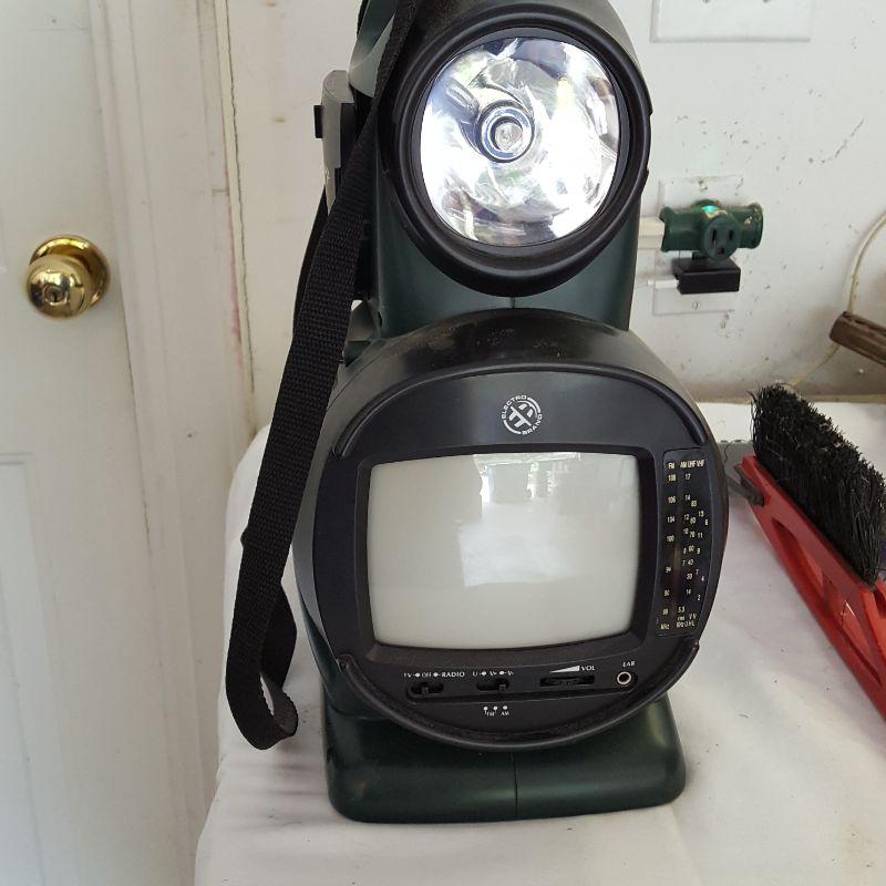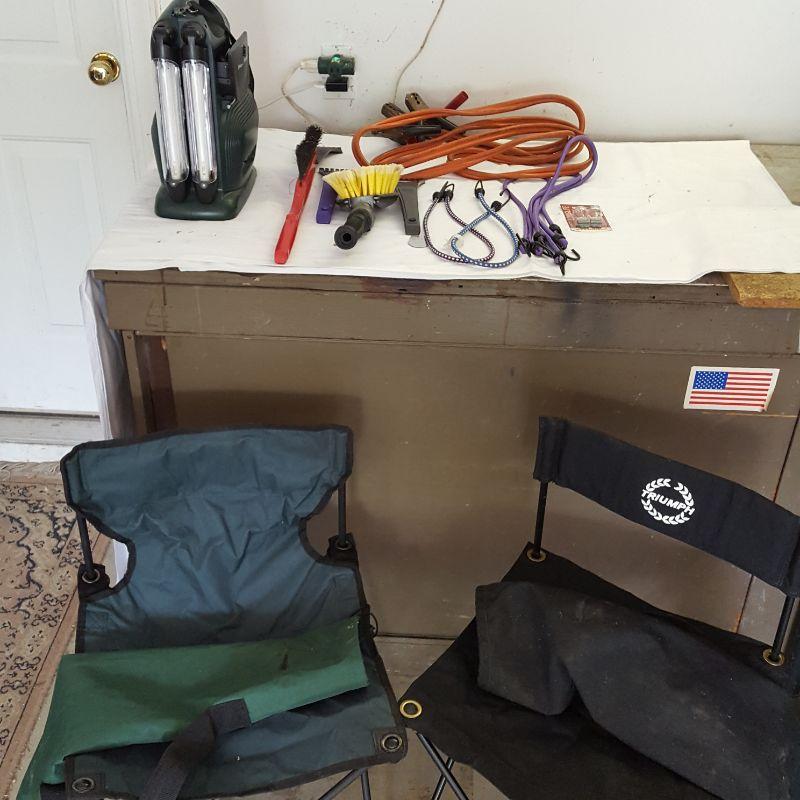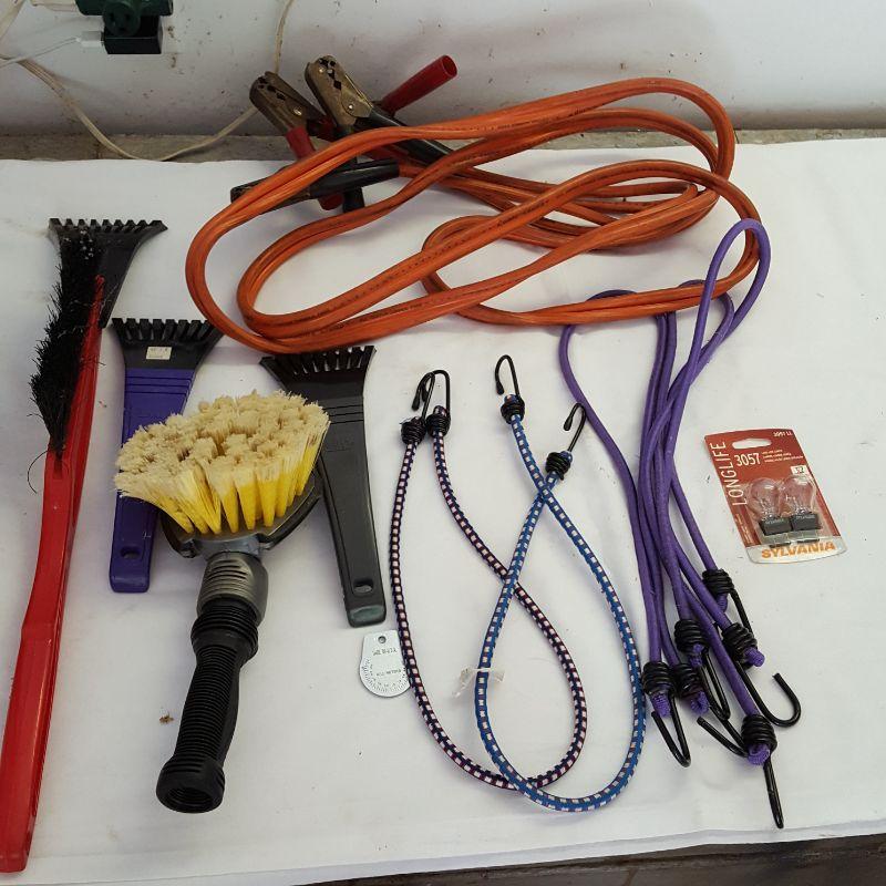 This lot features some things you should always keep in your care. We've got a set of battery cables, 3 snow scrapper, 5 bungie cords, a scrubber that attaches to your house to clean your car or other surfaces, two camping chairs and here's the bonus...an Electro Brand portable TV, light and radio player!!! This thing can run on batteries, car plug or electric outlet!