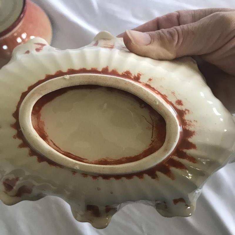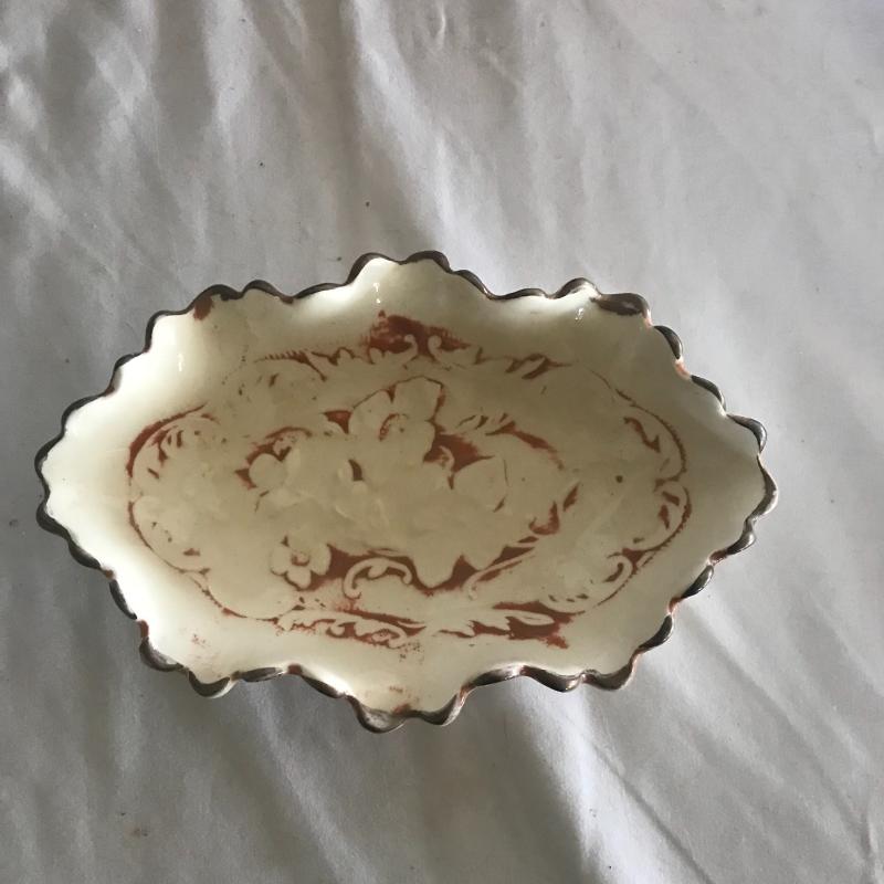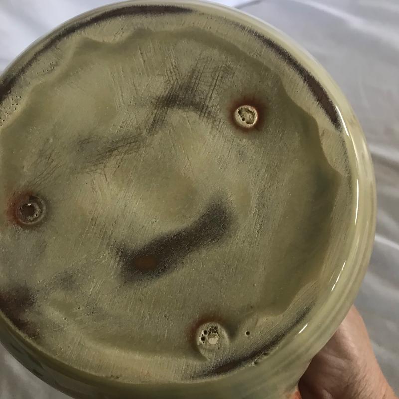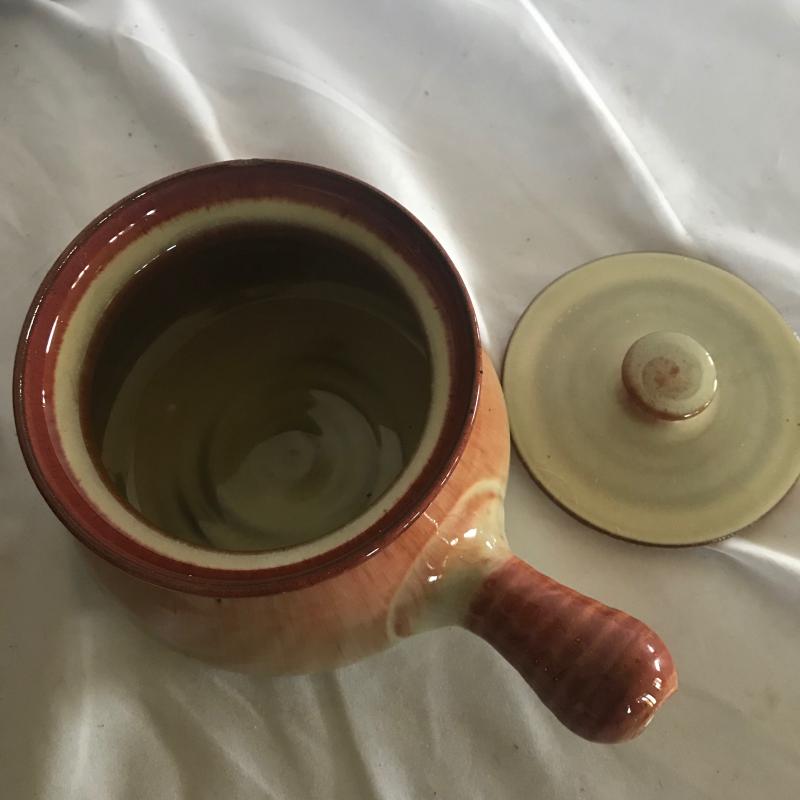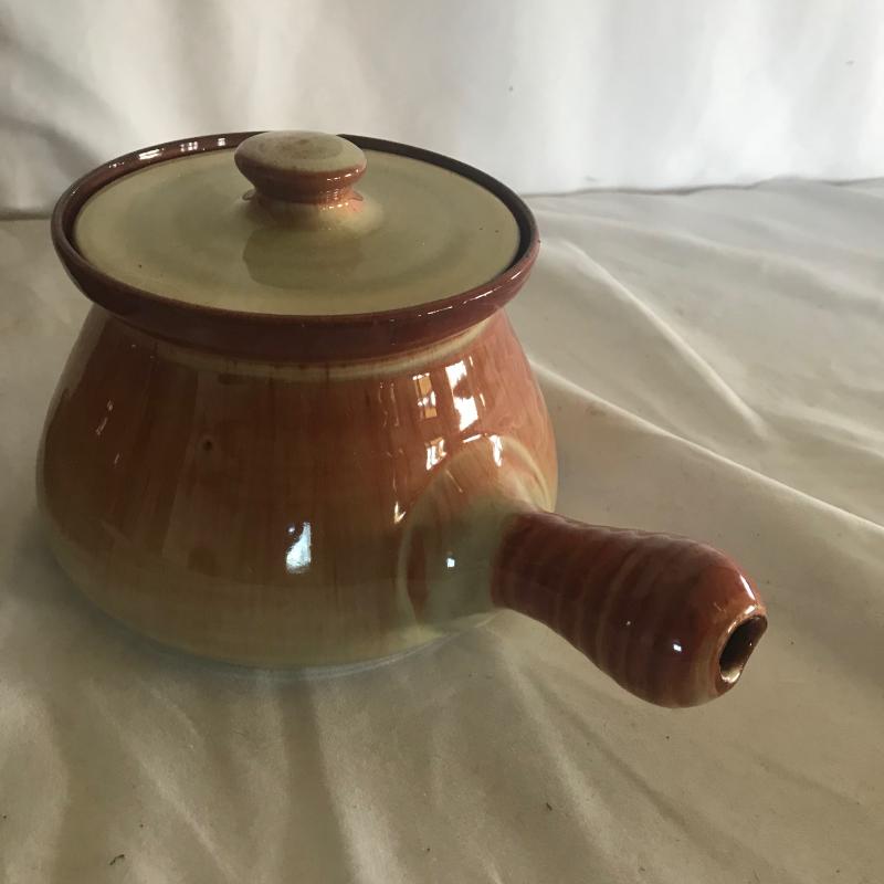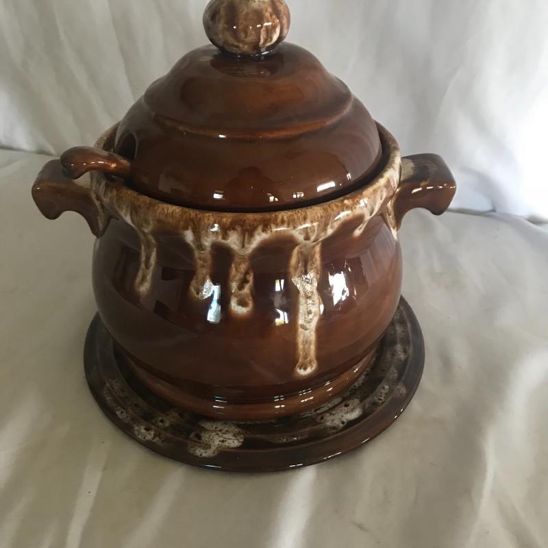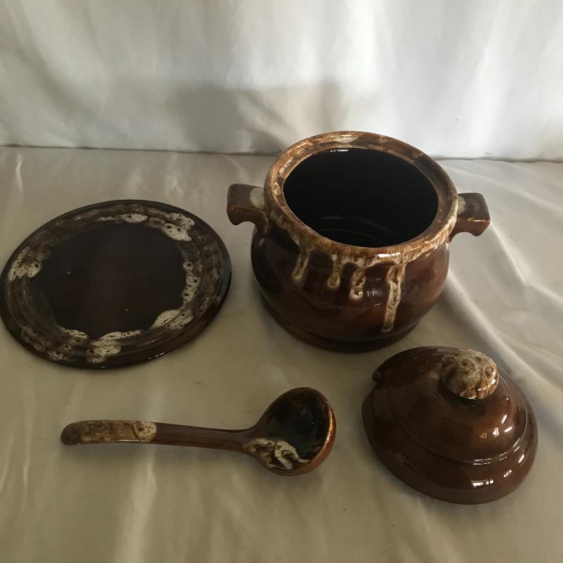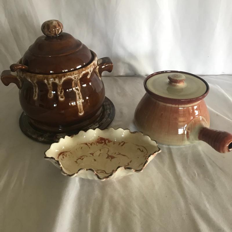 Three lovely pieces that compliment each other but are not matching.. large brown urn with stand and ceramic spoon stands 9” tall. Shipping available.