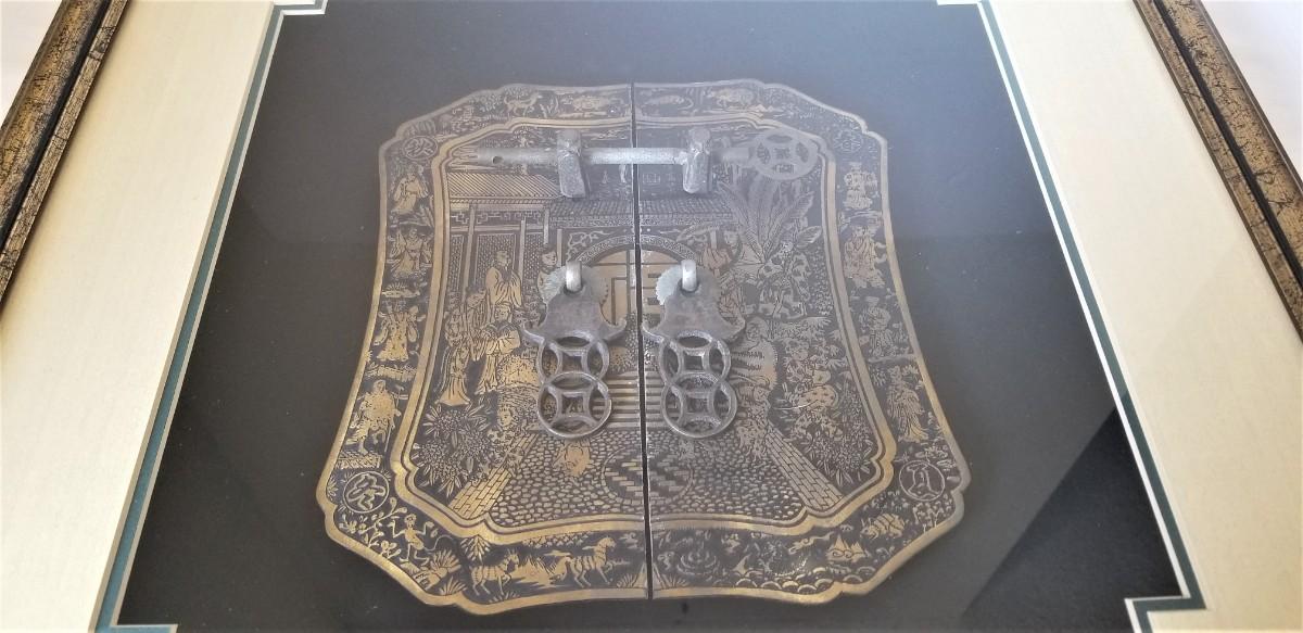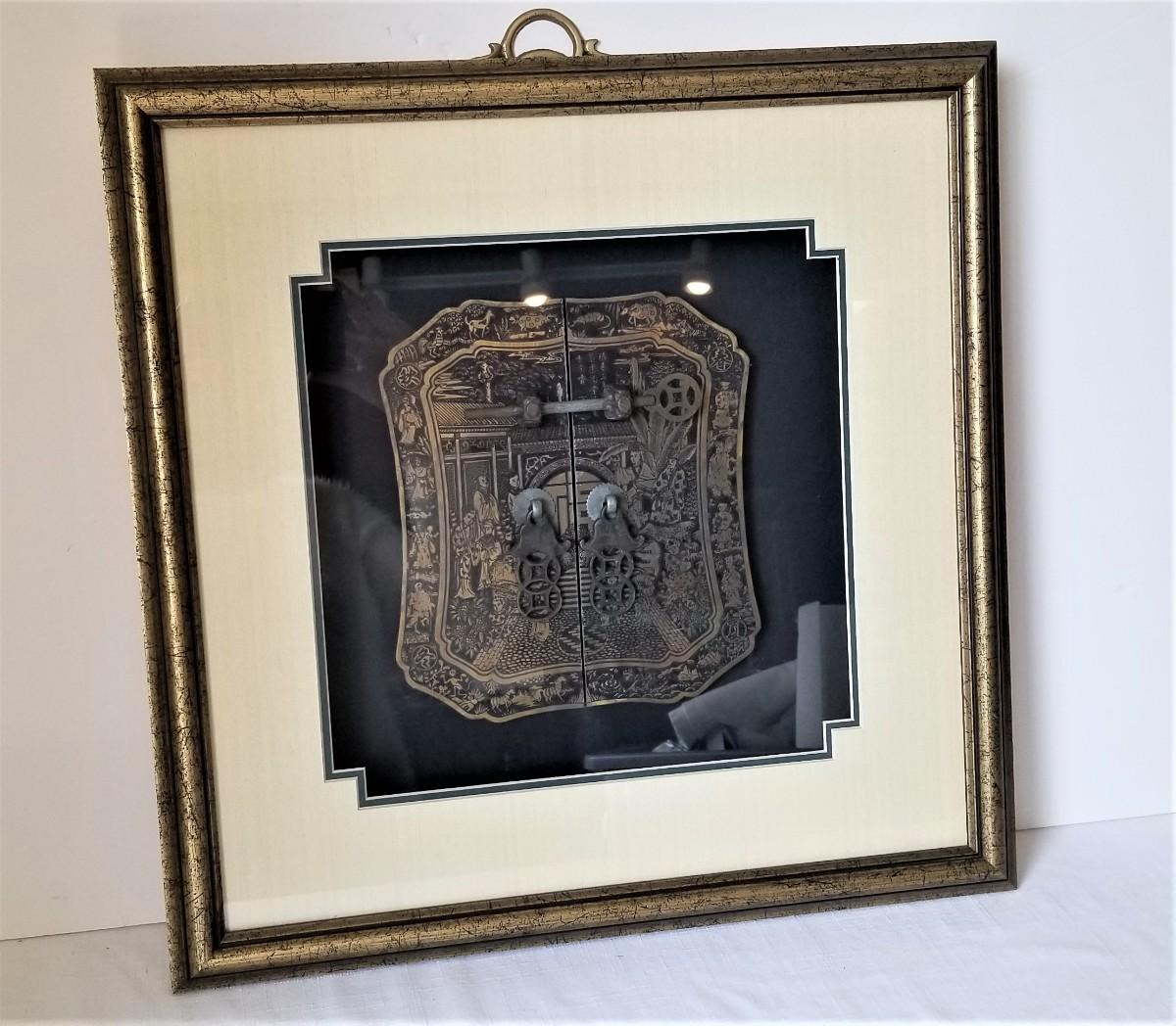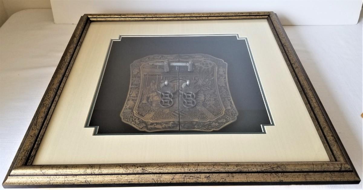 Nice decorative shadowbox (double mat) featuring a large Asian style metal lock or closure decorated with Court figures. 17.5" across, 18" tall. Good condition.