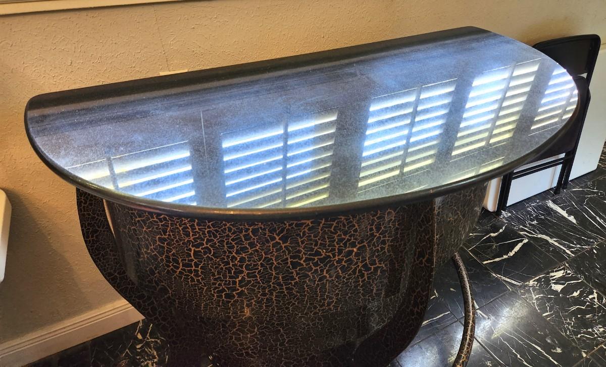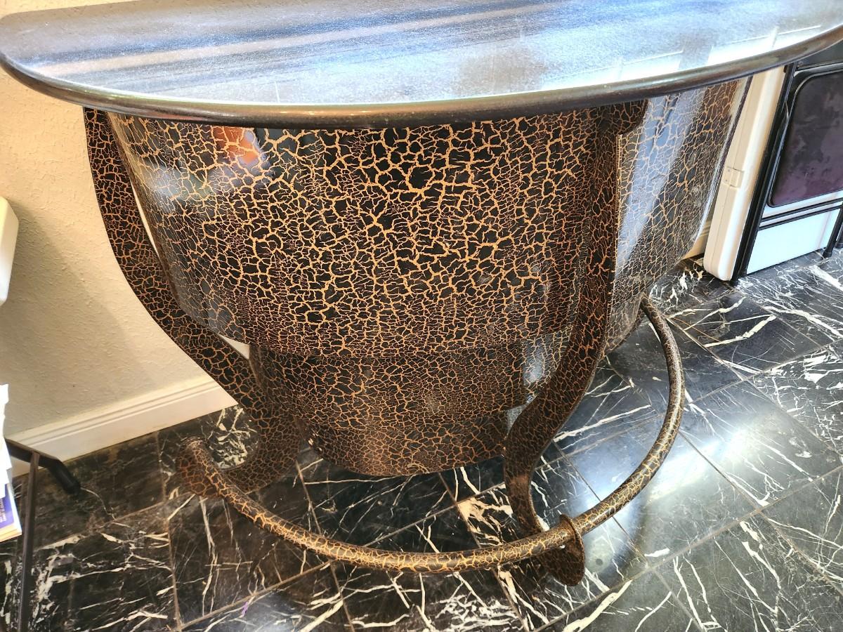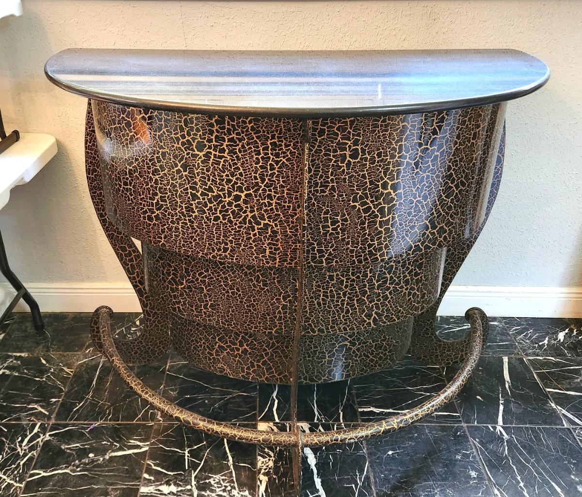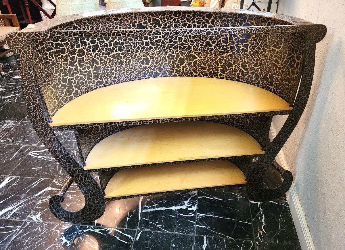 From the Eiffel Company - Groovy Metal home bar with foot rail, 3 shelves, great condition. 52" across, 24" deep, 41" tall. Super heavy - will take 2 strong men to move/carry/load. Whoever purchases this will have to move and load it themselves - we cannot assist.