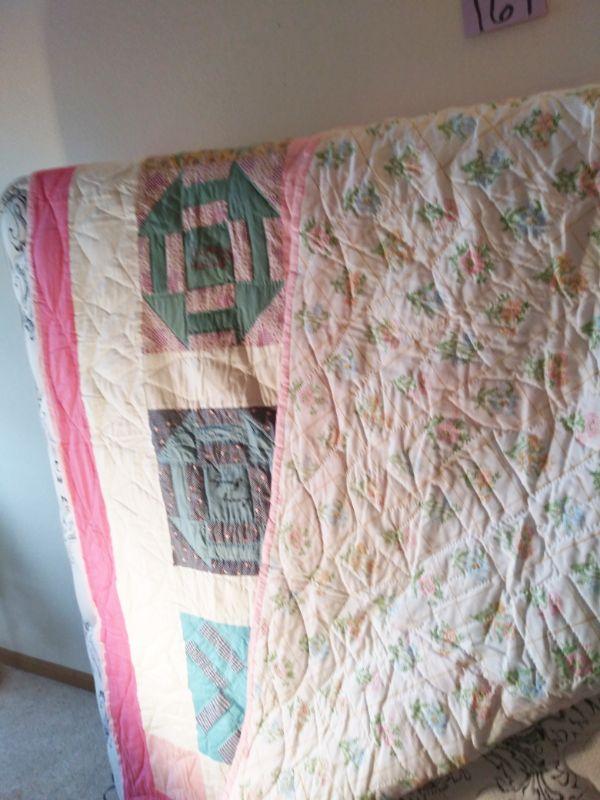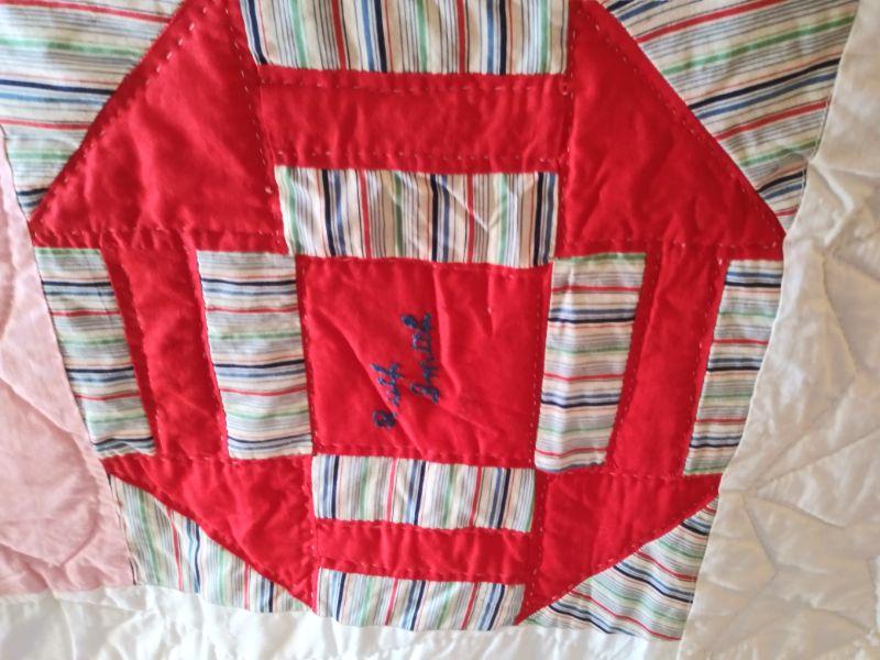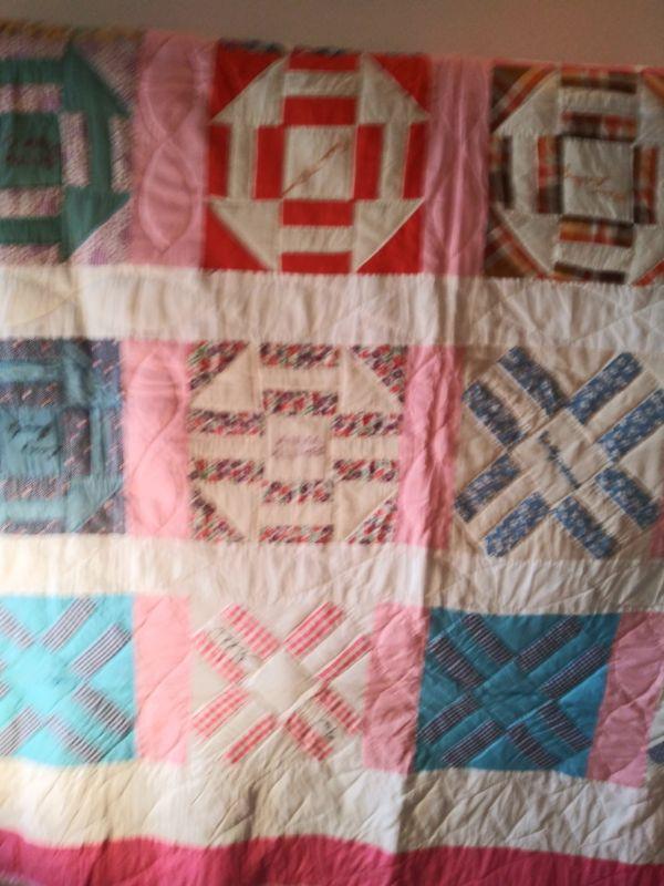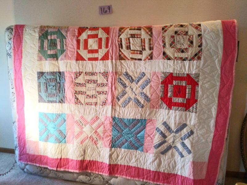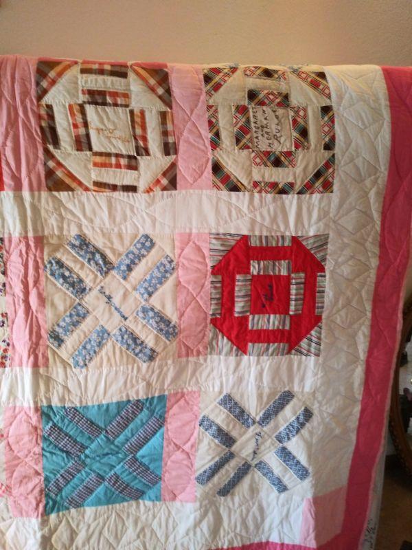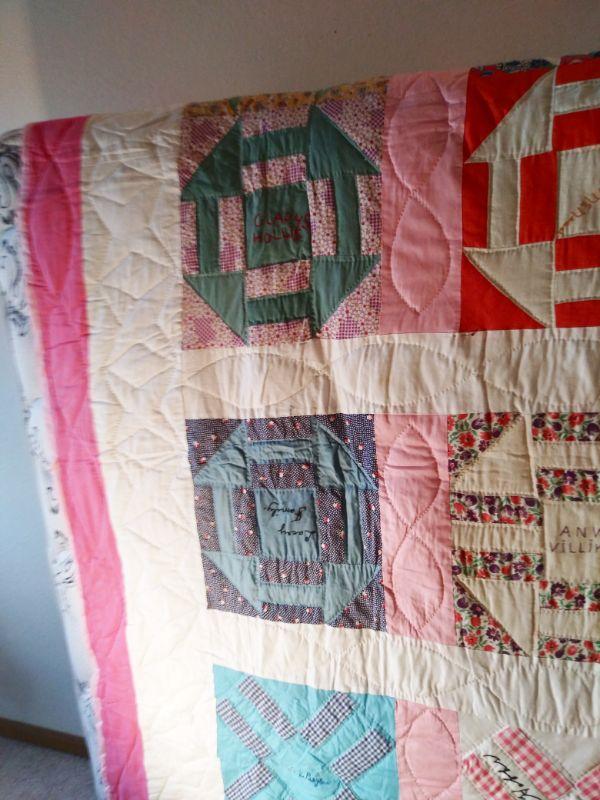 THIS HAND STITCHED QUILT HAS LADIES NAMES IN EACH SQUARE. NOT SURE IF IT WAS A QUILTING CIRCLE OR NAMES OF FRIENDS?