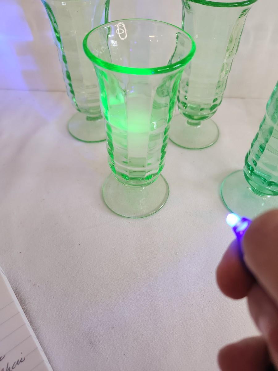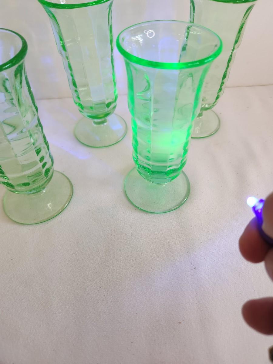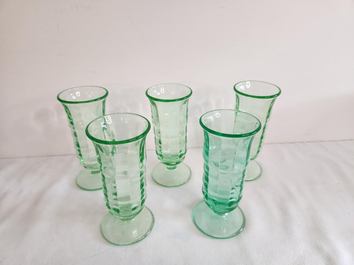 Nice lot of 5 vintage Vaseline Glass Footed Sherbets - each 6" all - all in good condition - GLOWS. Unusual shape.