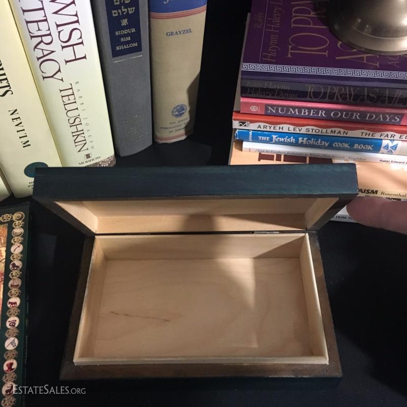 Menorahs, Kippahs and Books on Judaism. Includes silver necklace with Jewish star and decorative box.