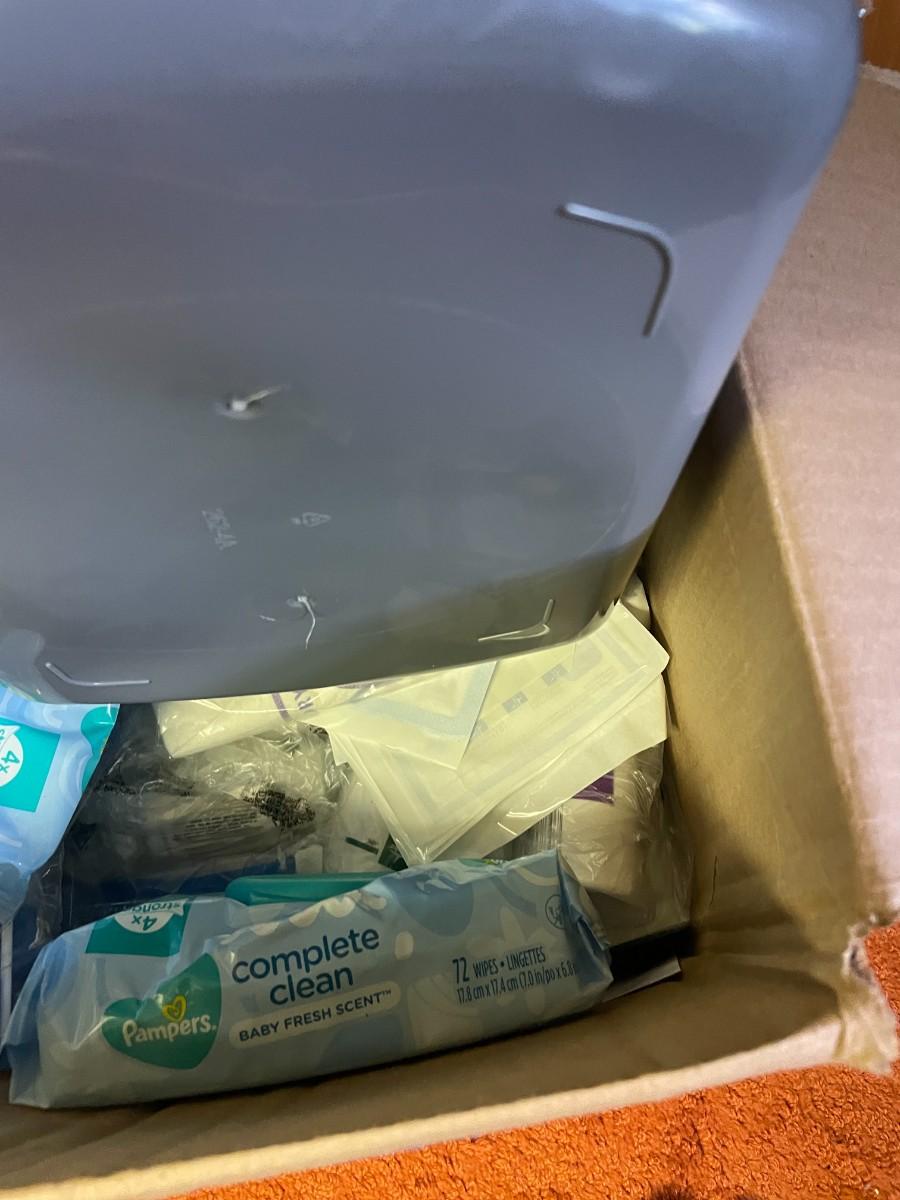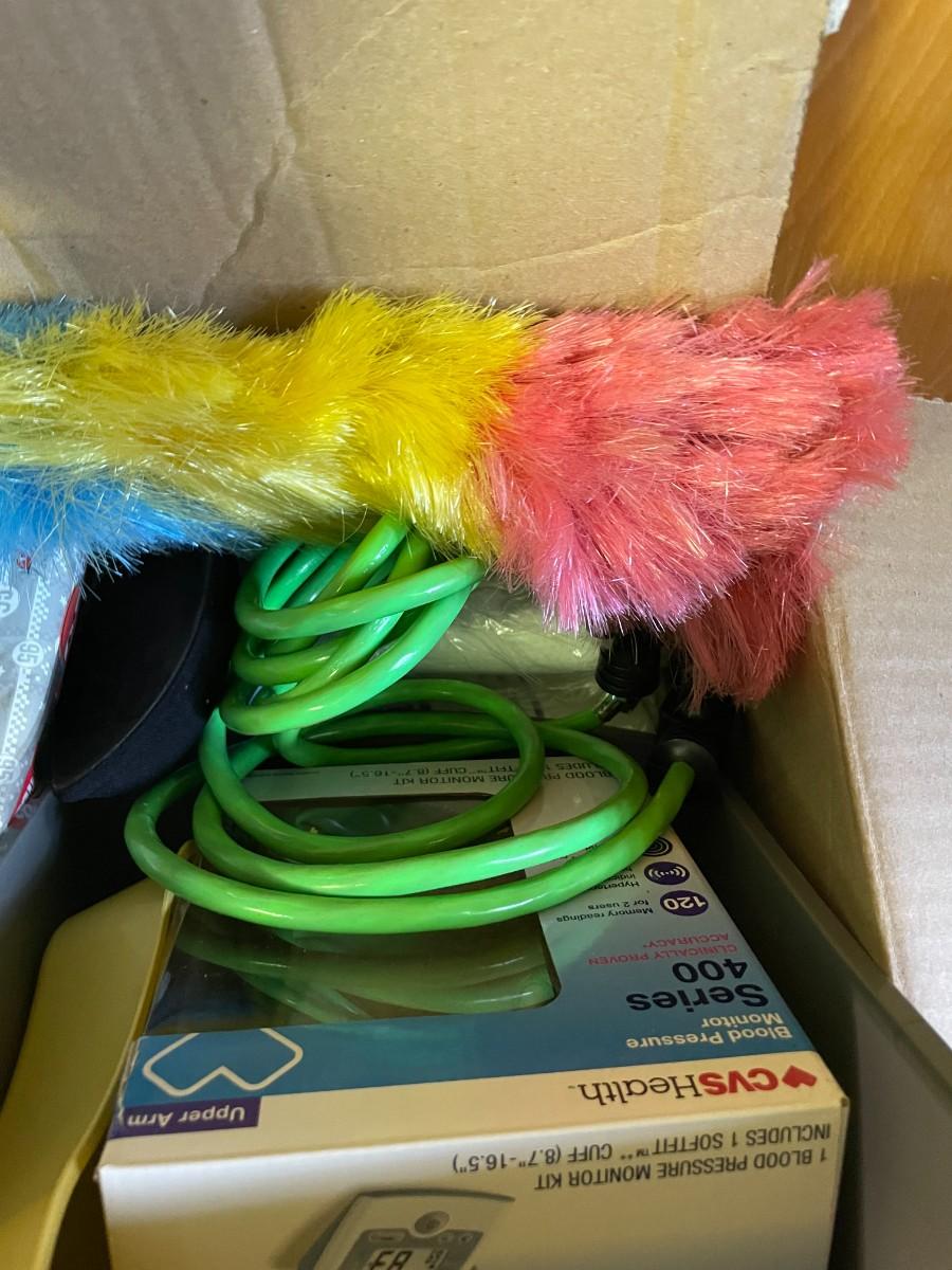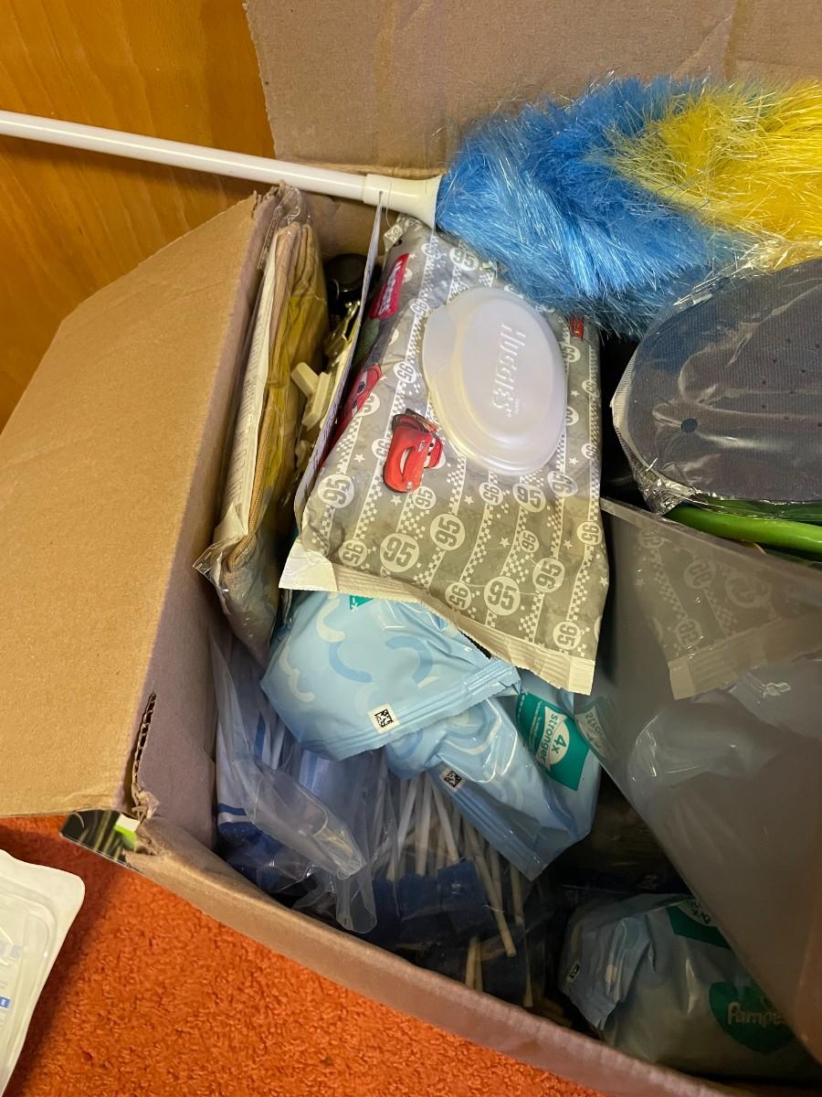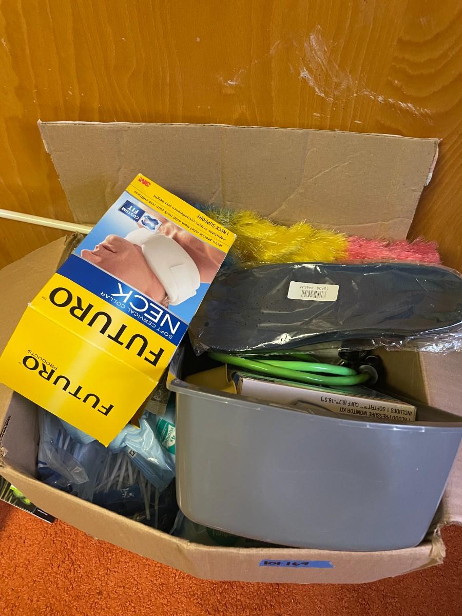 Misc. box of cleaning supplies, hygiene products, health products, office supplies.