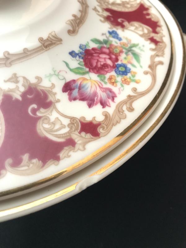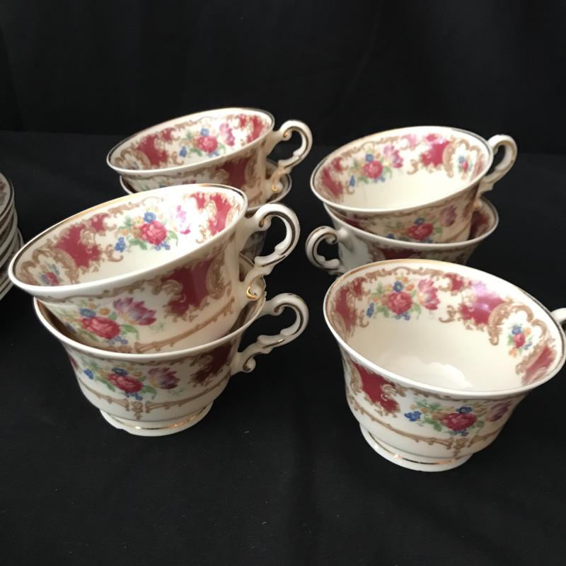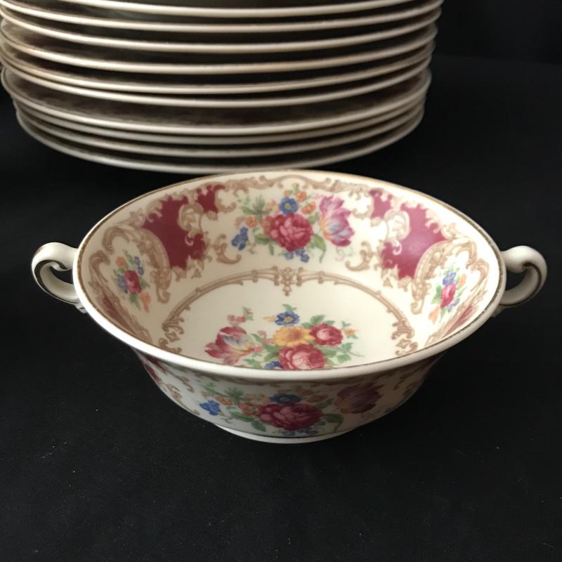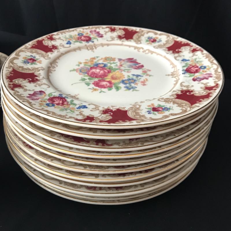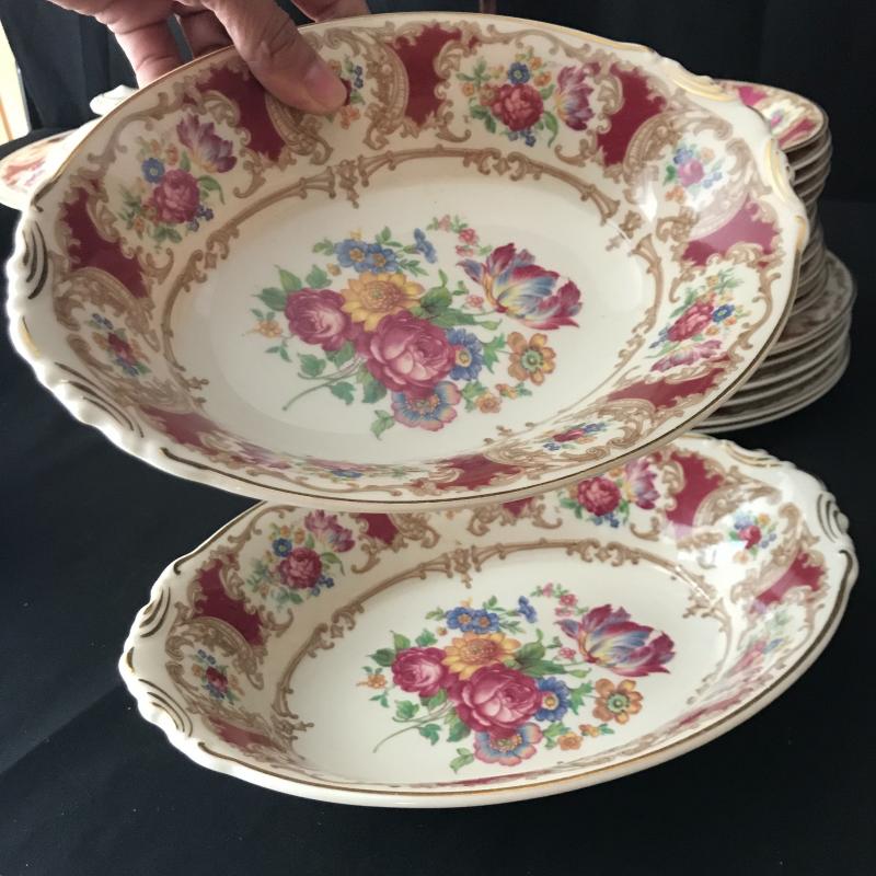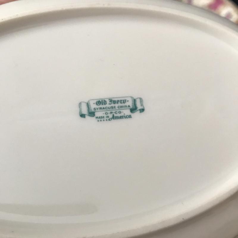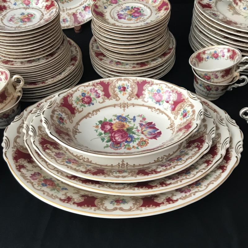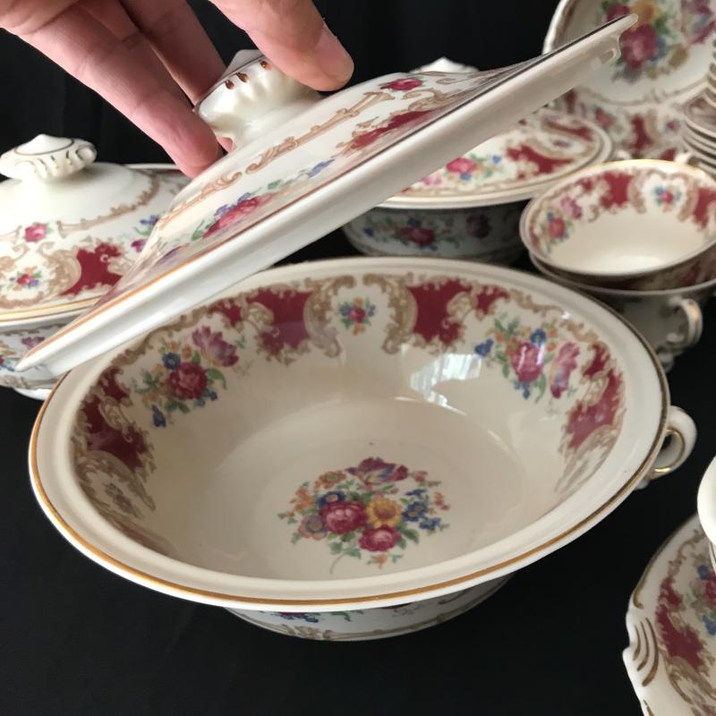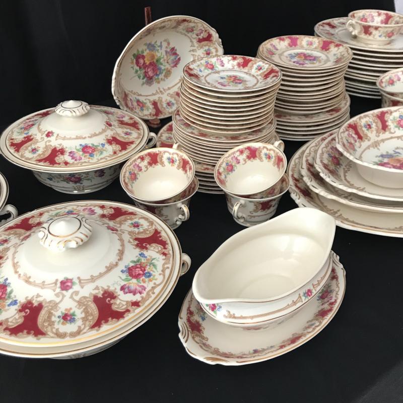 Large set of china that is made in America. This set is Old Ivory Syracuse China and has flowers with dark red accents. Includes plates and serving pieces. See photos for details. A couple pieces have small chips including two of the covered dishes. Largest platter is 16” x 12” No Shipping