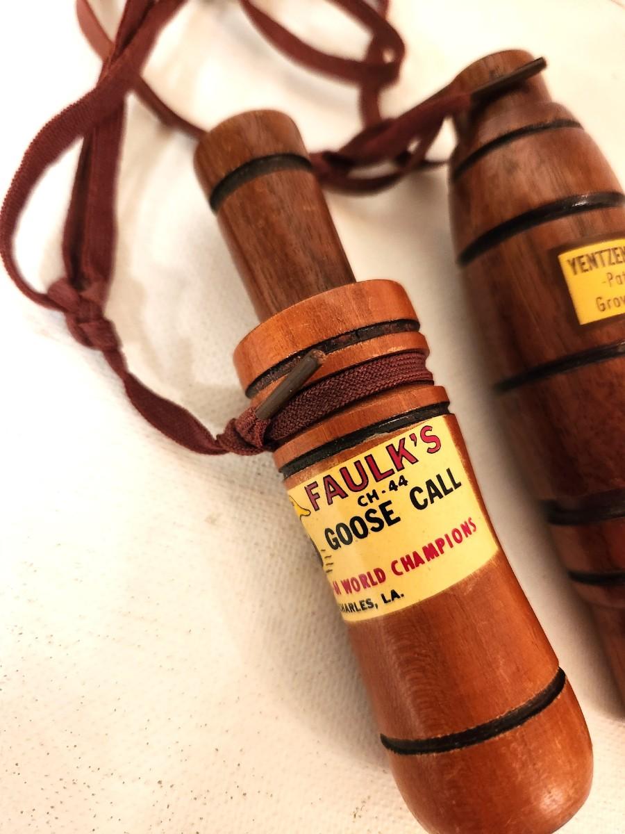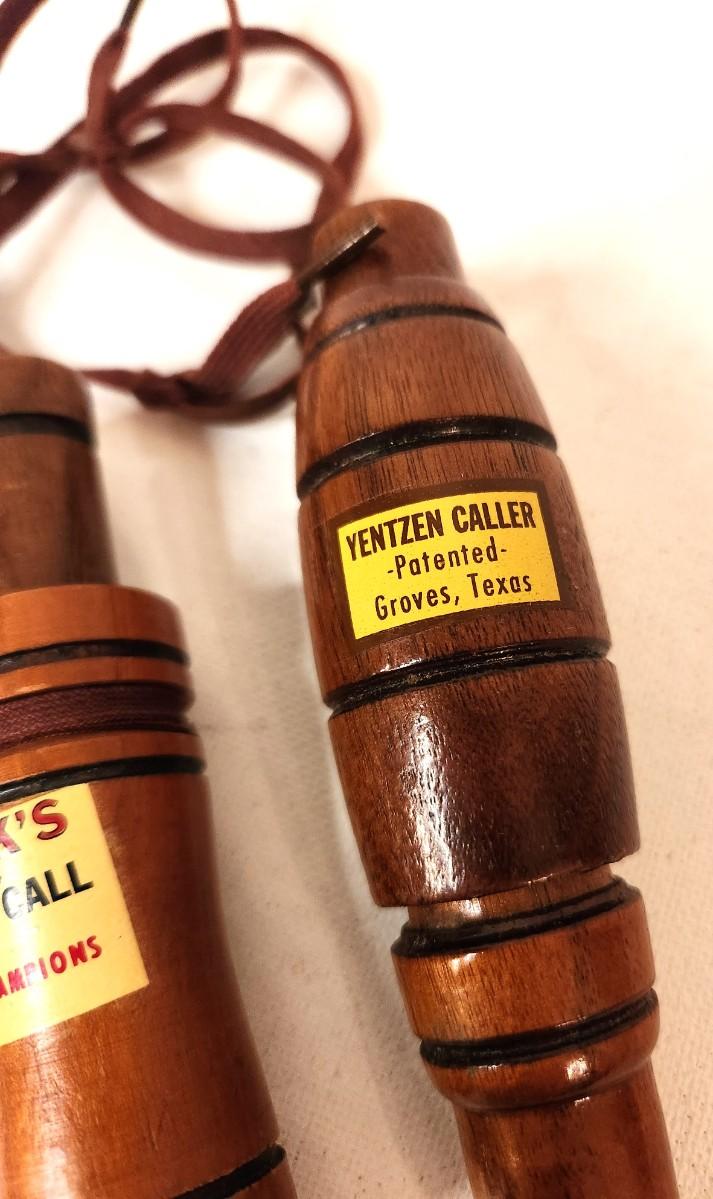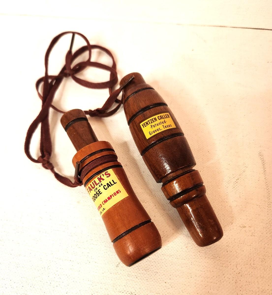Nice pair of vintage Goose Calls - Faulk's (Louisiana) and Yentzen Caller (Texas) - larger one is 5" long - yes - they WORK.