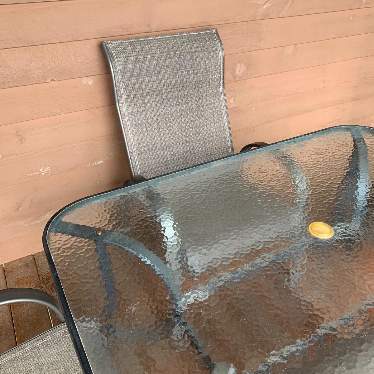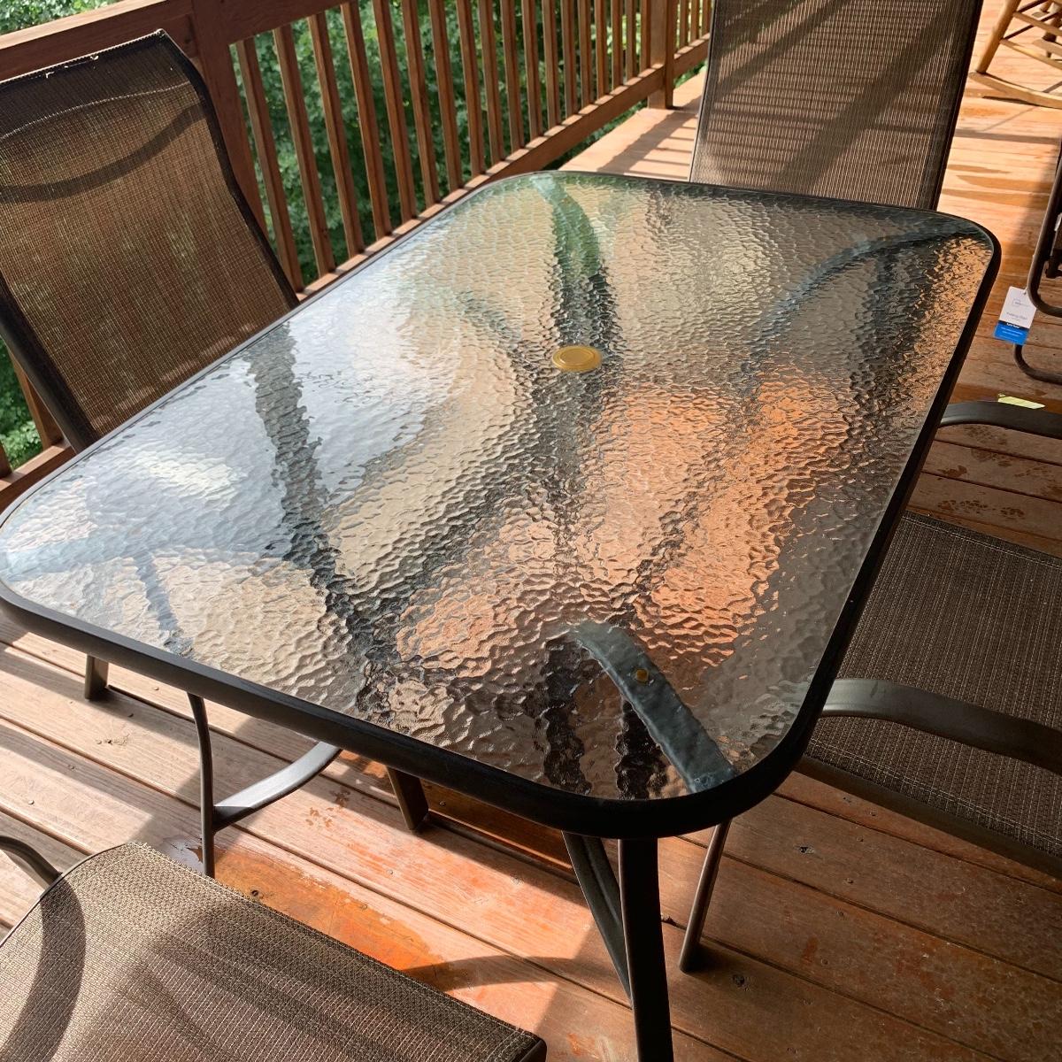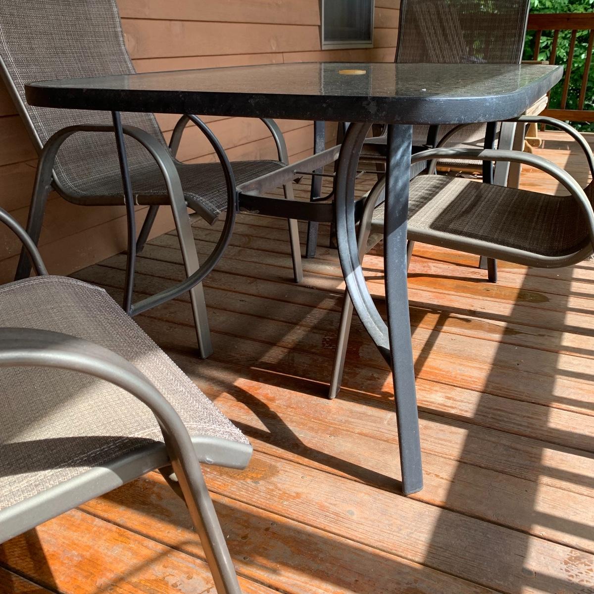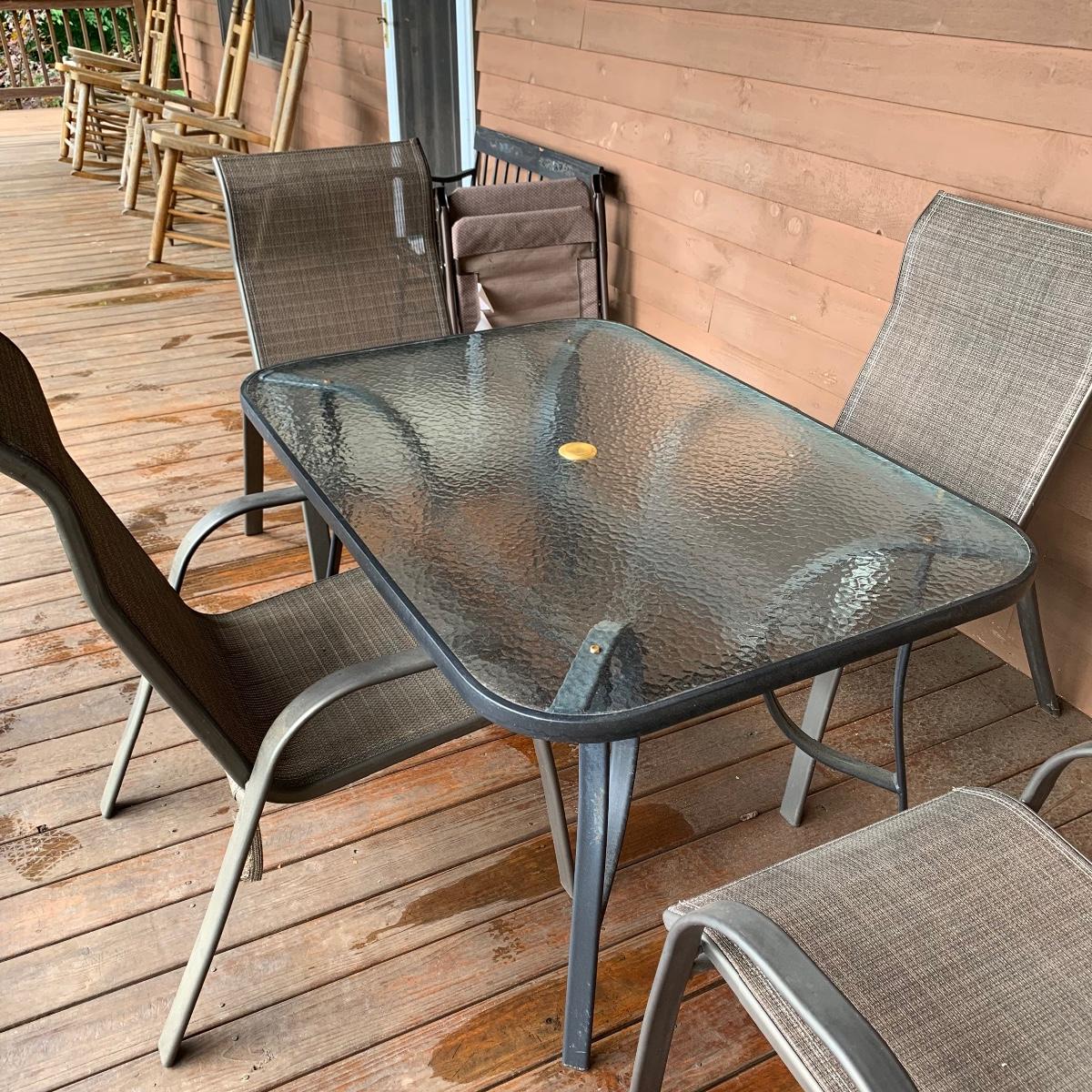 Time to replace that worn out patio furniture. The lucky winner of this lot will revive a metal table with a beautiful glass top that has an umbrella hole already drilled in the middle. This table measures 36” X 53”. The metal chairs included in this set are super comfy, and feature durable outdoor material. Four chairs are included in this set. This set also includes an extra folding chair that still has a tag on it. Local pickup only.