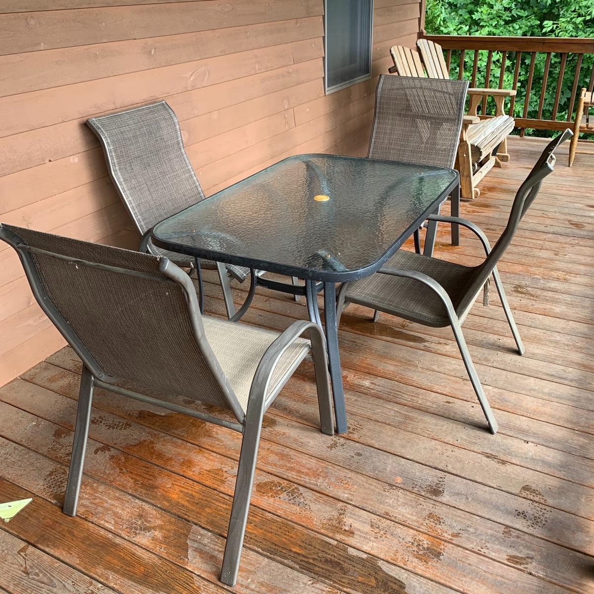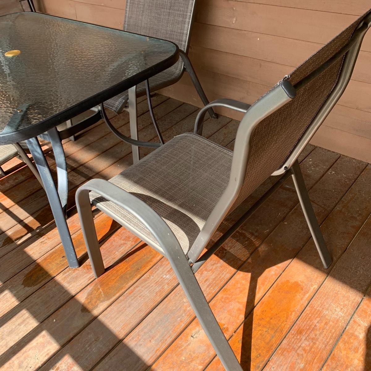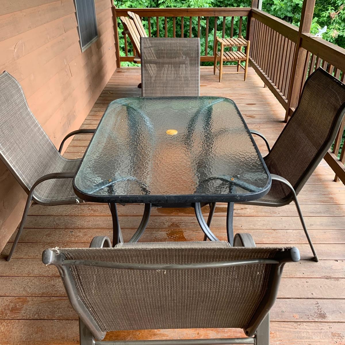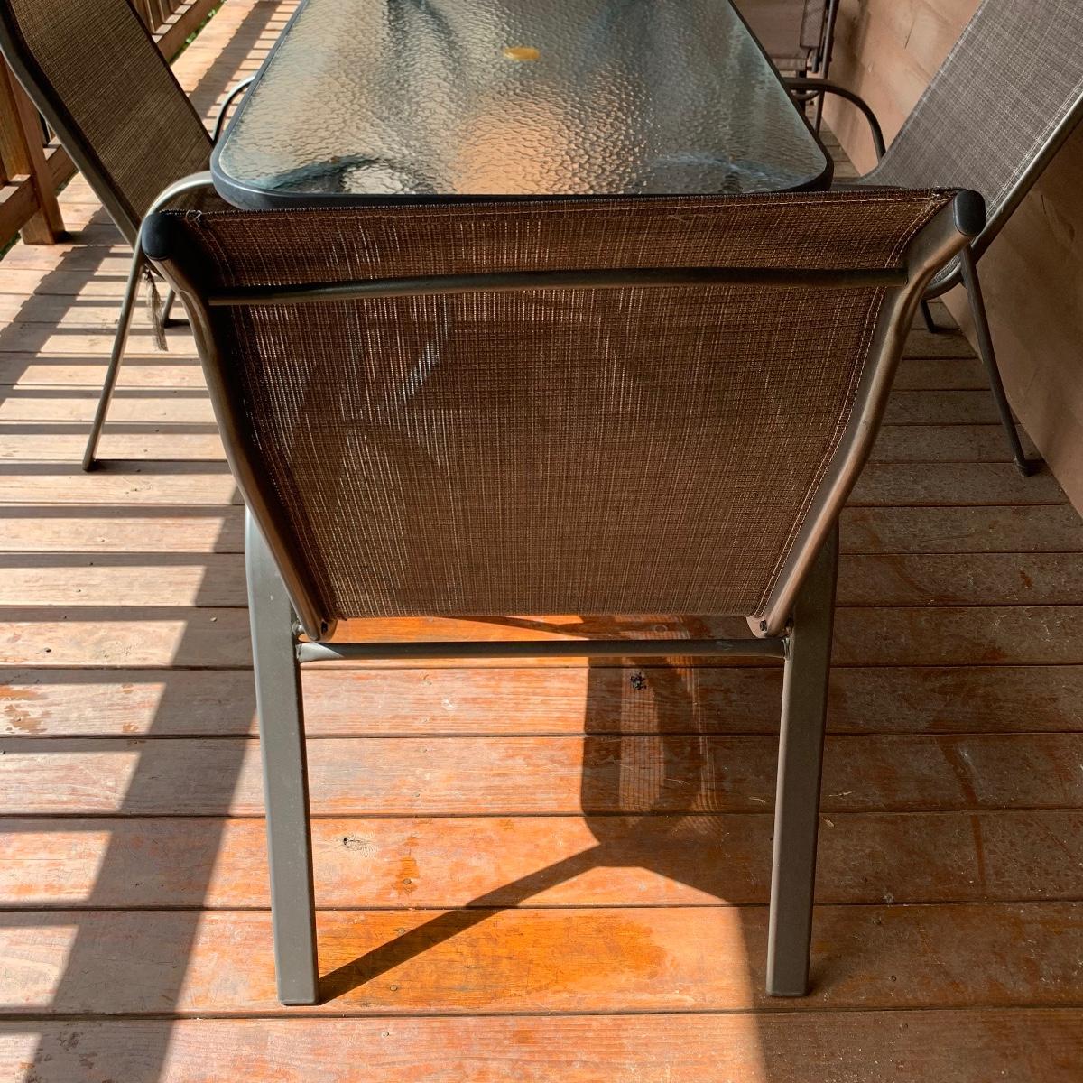 Time to replace that worn out patio furniture. The lucky winner of this lot will revive a metal table with a beautiful glass top that has an umbrella hole already drilled in the middle. This table measures 36” X 53”. The metal chairs included in this set are super comfy, and feature durable outdoor material. Four chairs are included in this set. This set also includes an extra folding chair that still has a tag on it. Local pickup only.