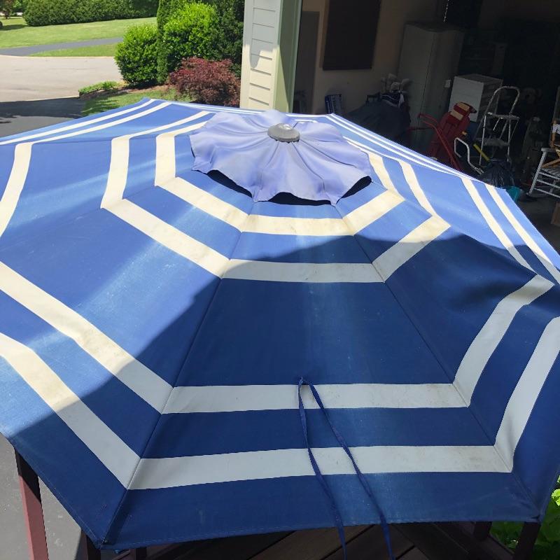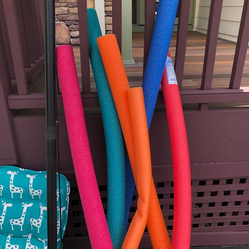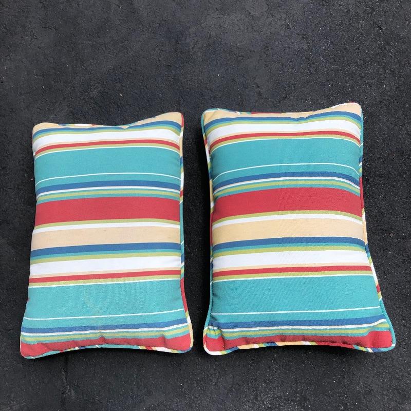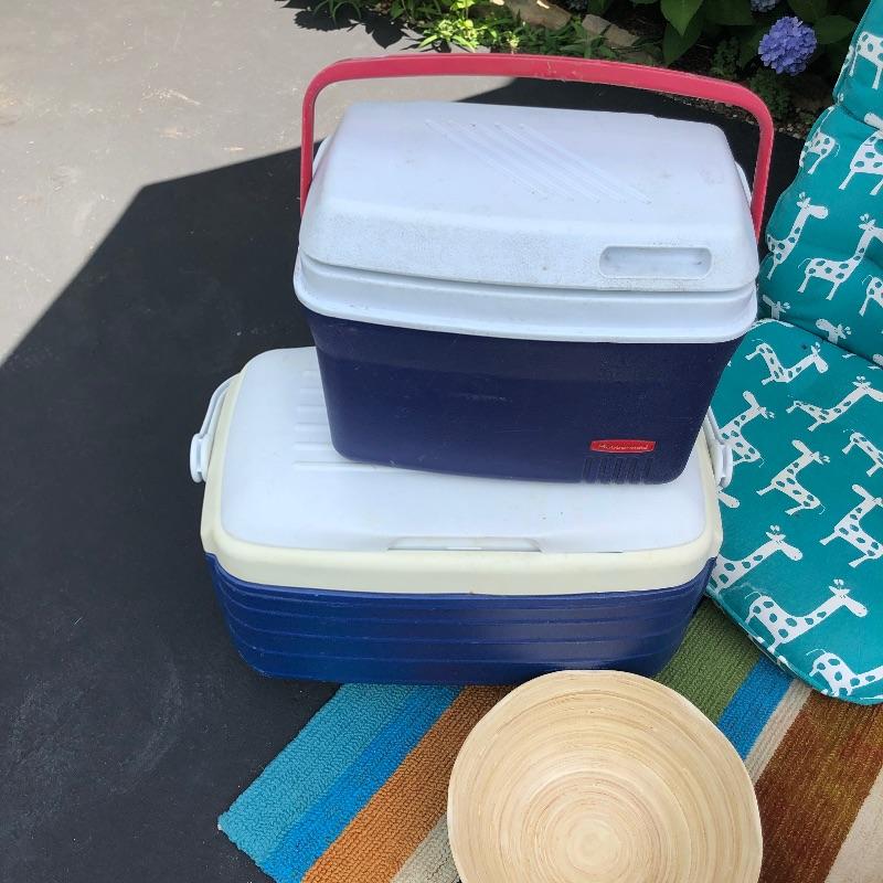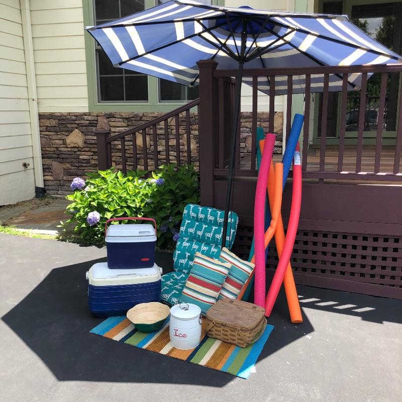 Enjoy your summer all the more with this outdoor assortment. The umbrella is for a patio table and could do with a good clean but certainly casts a great amount of shade. Also included here are coolers, ice bucket, pool noodles, picnic basket and more. The large bowl appears to be plastic. Largest cushion measures 20”W x 29”H.