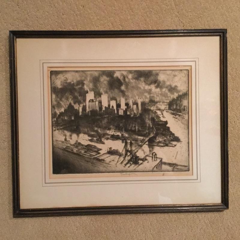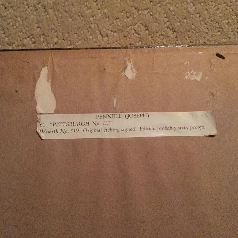 Two Professionally Framed and Signed by Artist Black and White Etchings. One Etching is original and Signed by Joseph Pennell with probably only Sixty Proofs of this Edition of “ Pittsburgh No. 111” exist.
