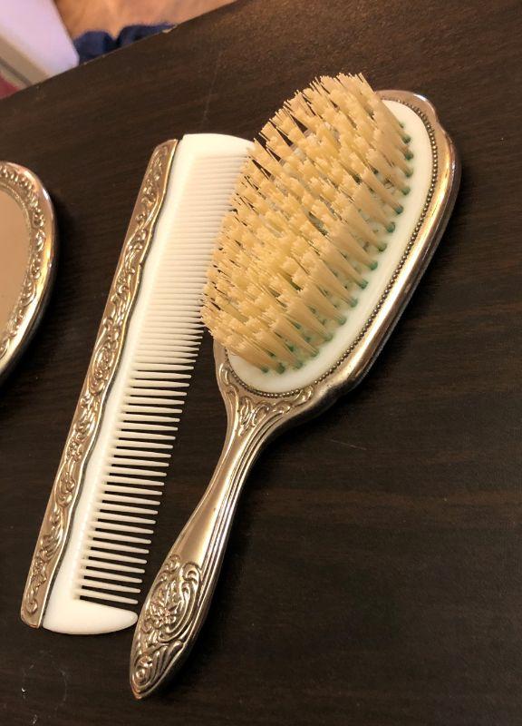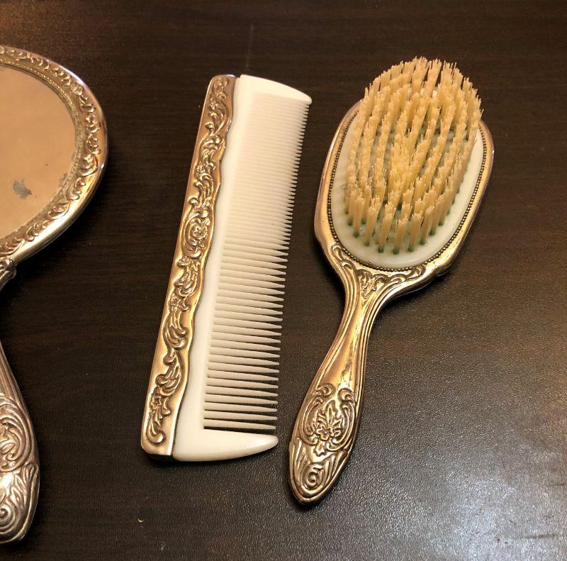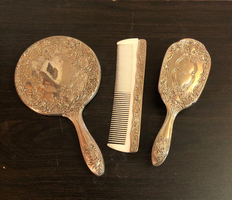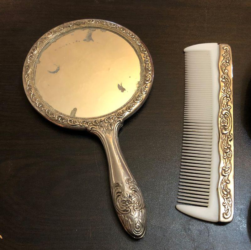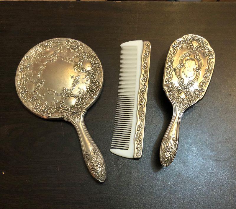 Mirror mirror in my hand, who is the best looking in the land? Aw - you're too kind! Super pretty, older vanity set that needs a little polishing up, but is a good set. This set is very heavy! There are four spots on the mirror where the silver backing is missing, but you can still gaze upon your gorgeous self without an issue. The hand mirror is 9.5" long.