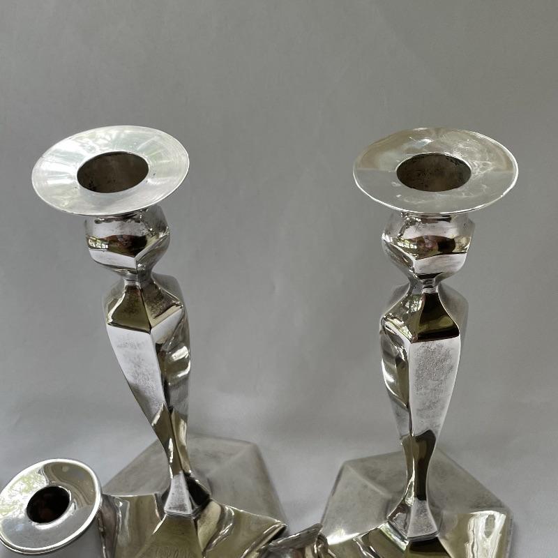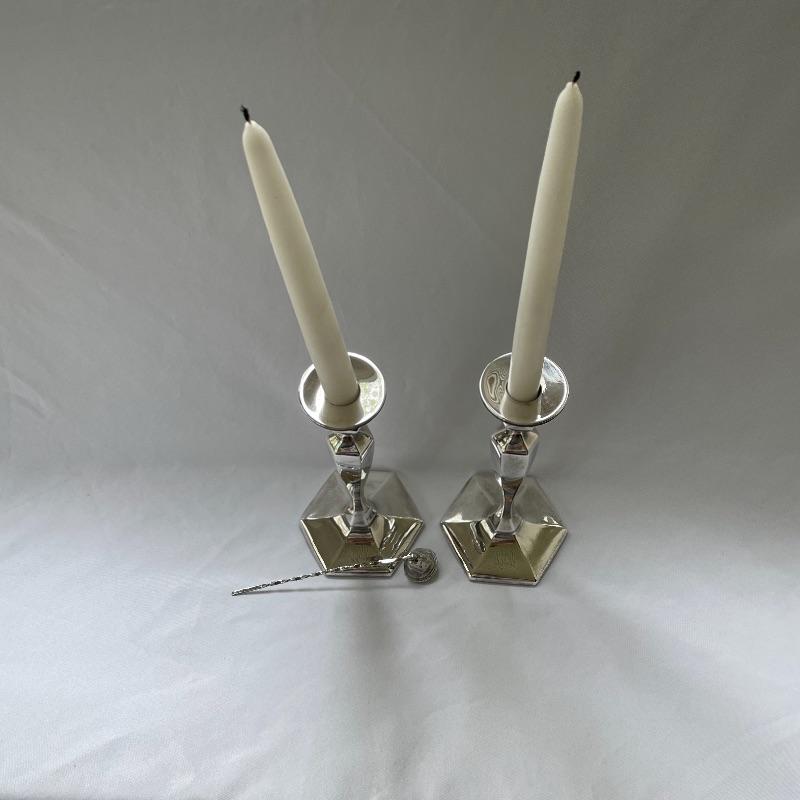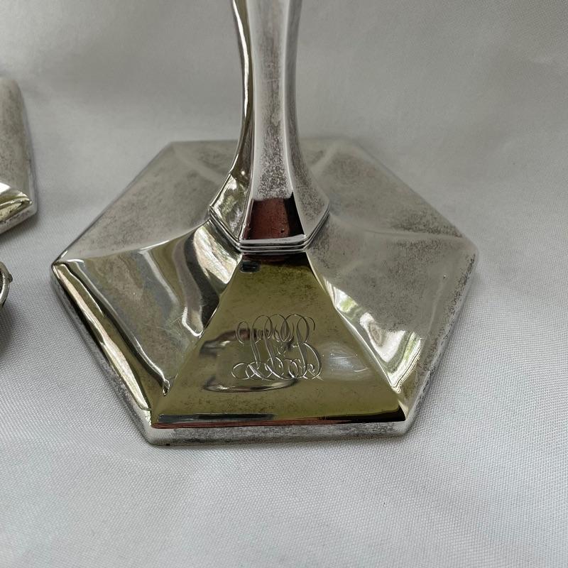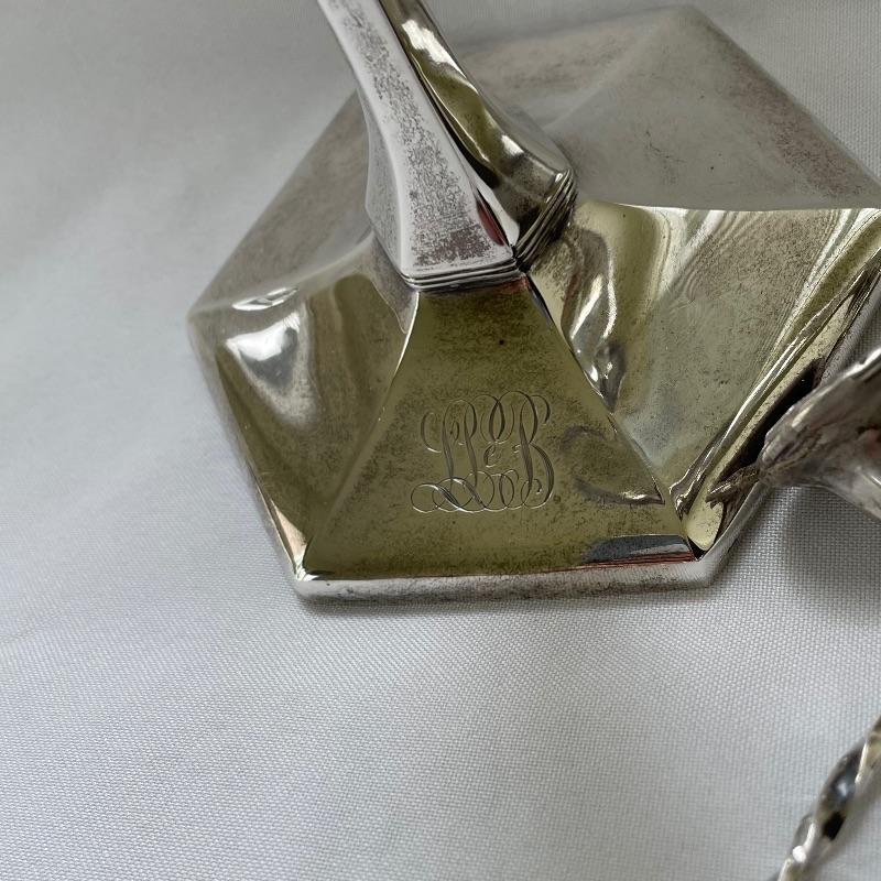 Two elegant Sterling silver candle holders with monogrammed well and detachable nozzles. These are heavy, yet they do not appear to be weighted. These are perfectly paired with Sterling snuffer and two white taper candles. Starting bid is at or near melt value. Shipping available.