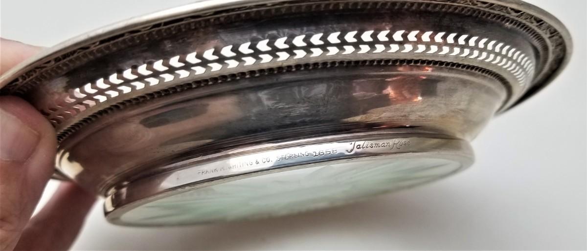 Frank Whiting Sterling Silver/Glass Wine Coaster in the "Talisman Rose" pattern. Good condition, 6.5" across, reticulated border.