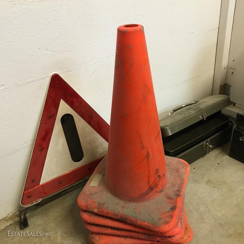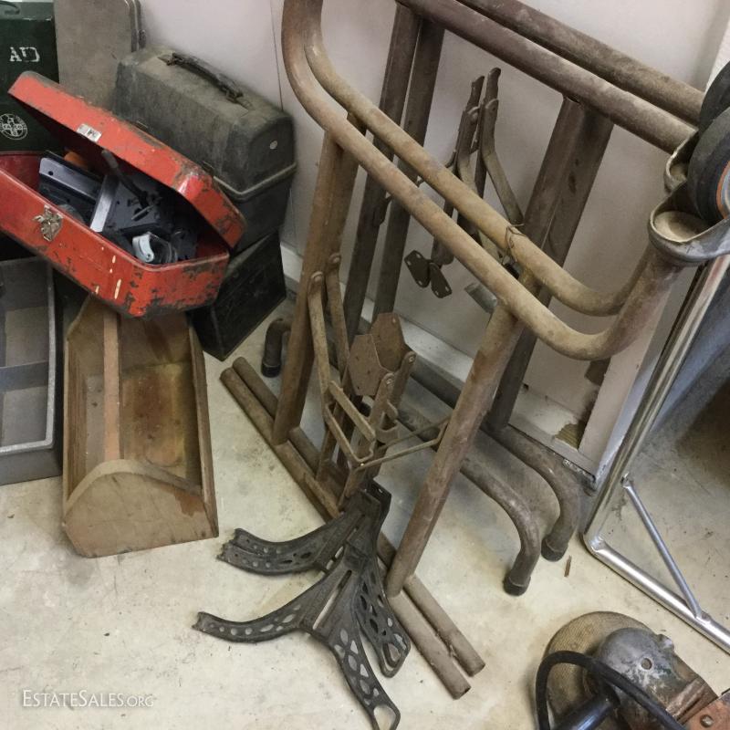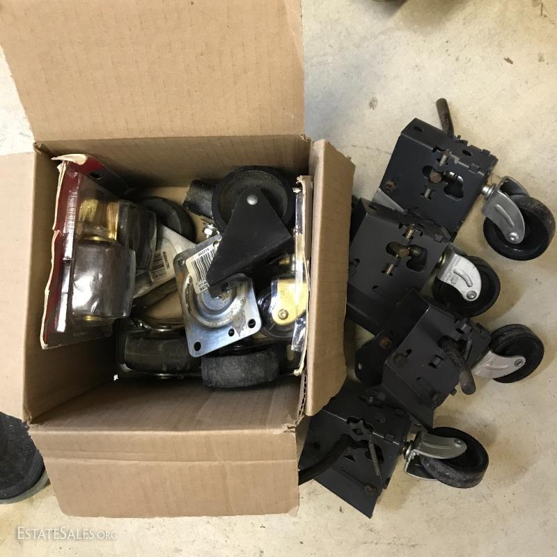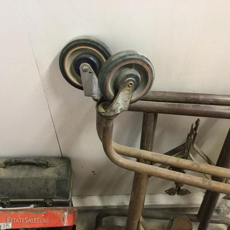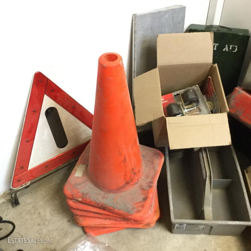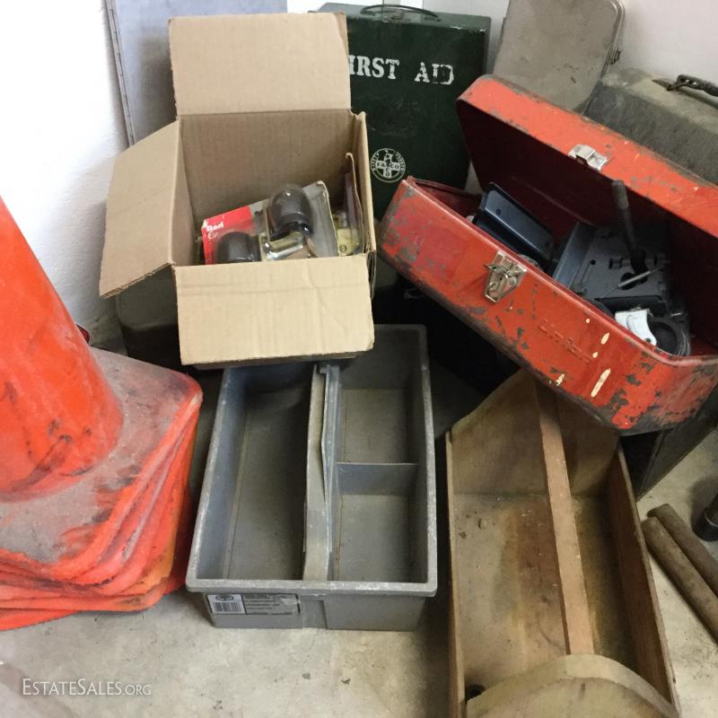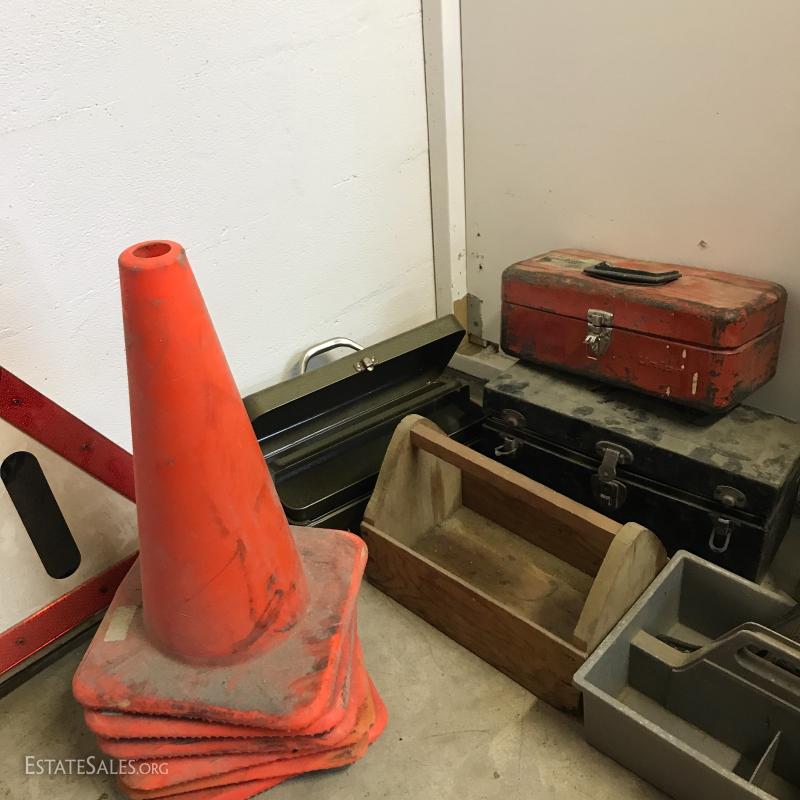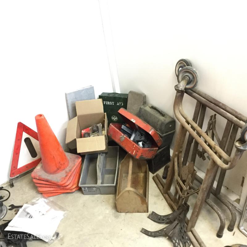 Various empty metal tool boxes. One wooden tool box with handle. Box of large casters of various sizes. Two metal frames on wheels. Three iron pieces that say "American F&M Co." Six orange cones. One caution sign.