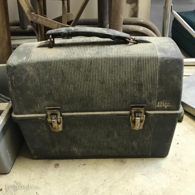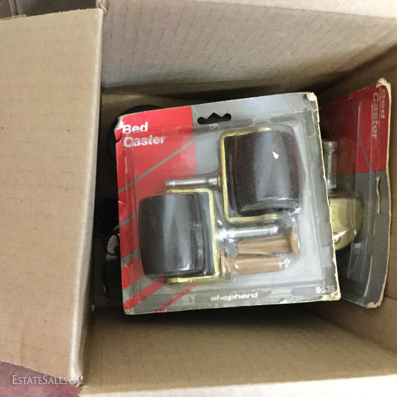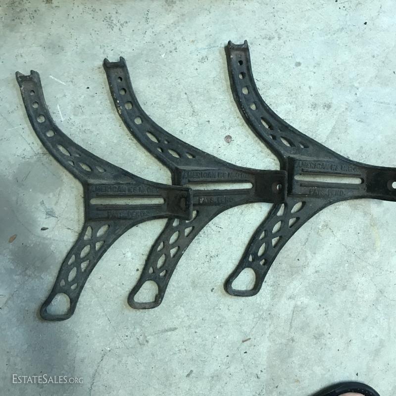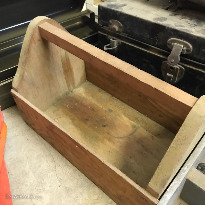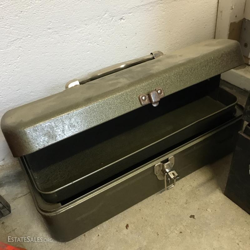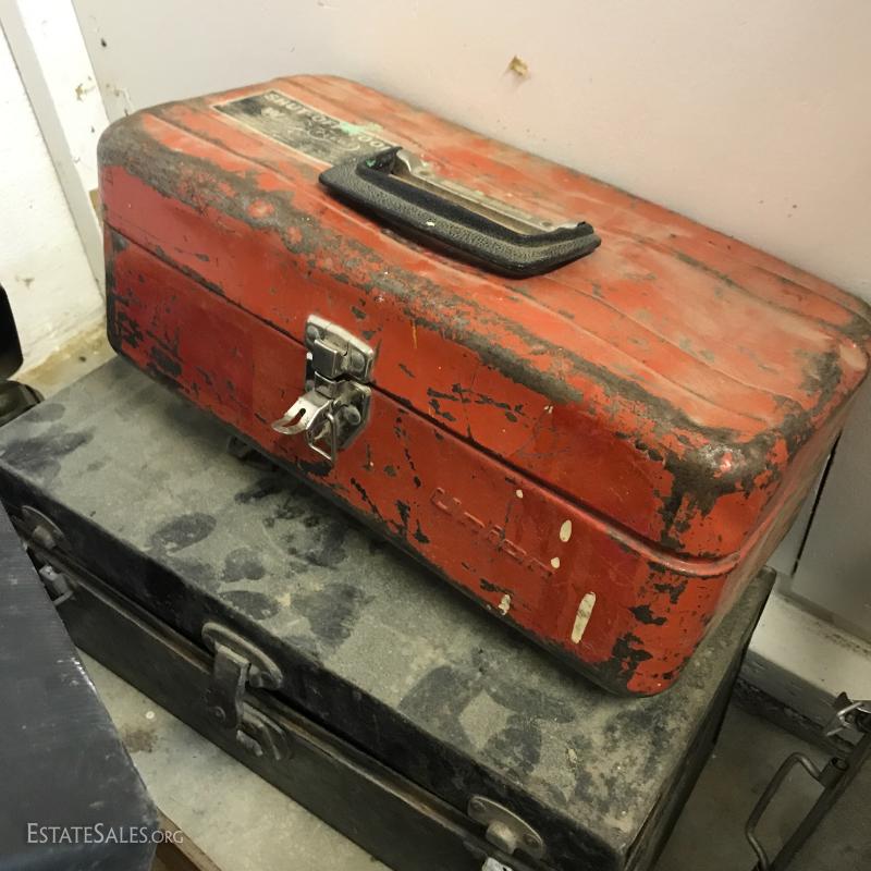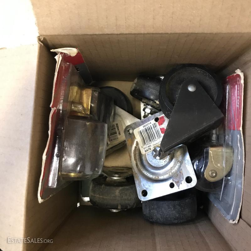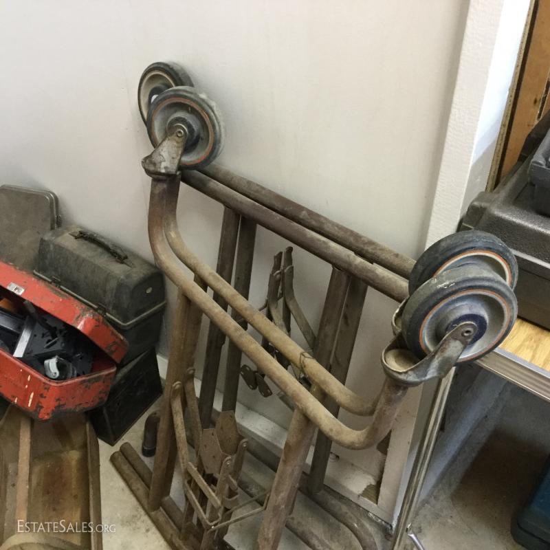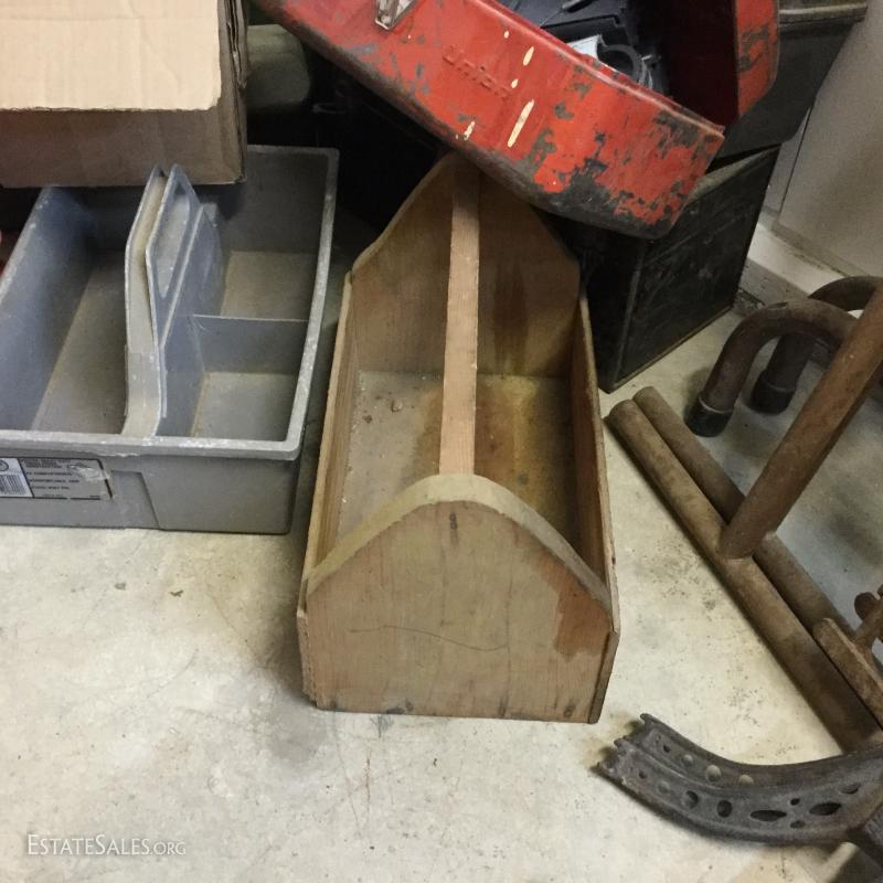 Various empty metal tool boxes. One wooden tool box with handle. Box of large casters of various sizes. Two metal frames on wheels. Three iron pieces that say "American F&M Co." Six orange cones. One caution sign.