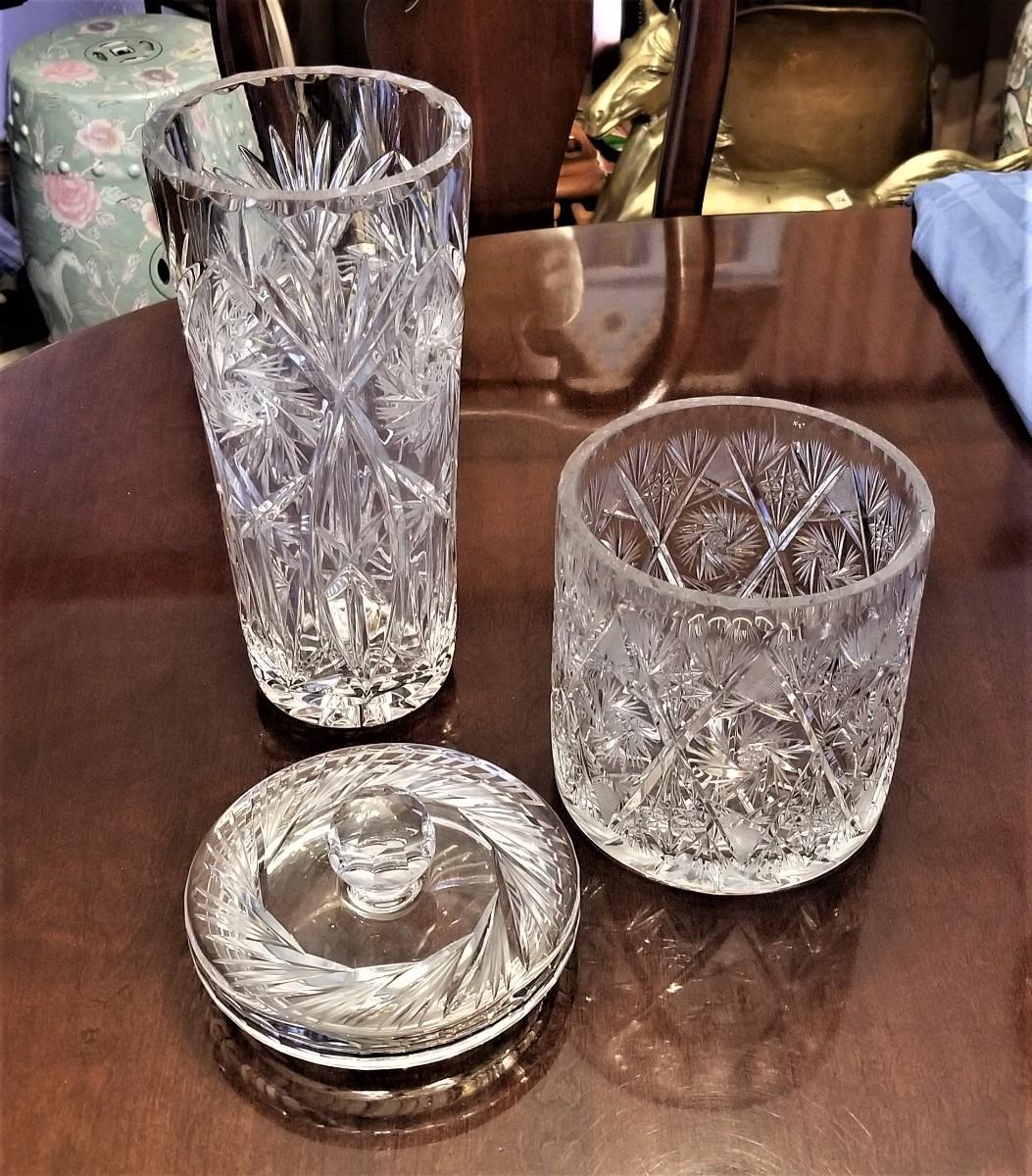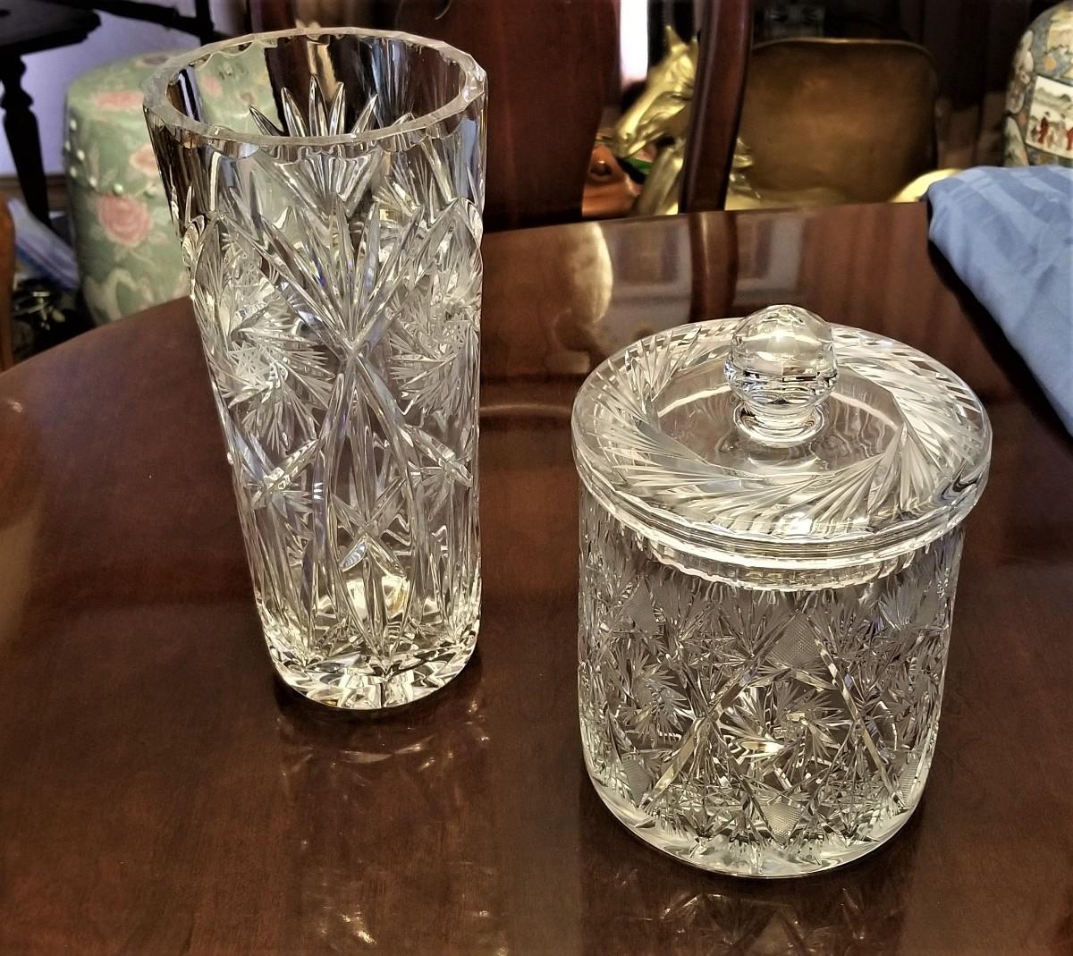 Unsigned, but two nice pieces of lead crystal here - Large Vase (11.25" tall, 5" across) and a Biscuit Barrel - 6" across, 9.5" tall. Good condition.