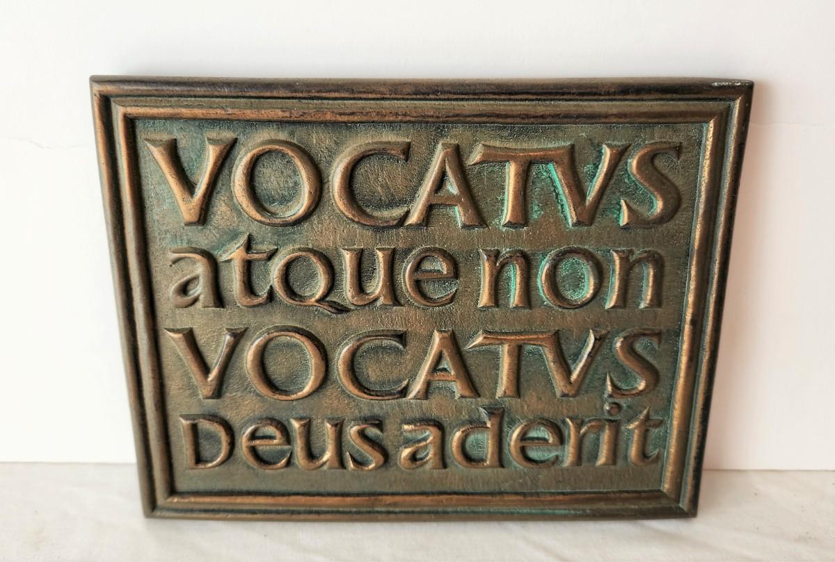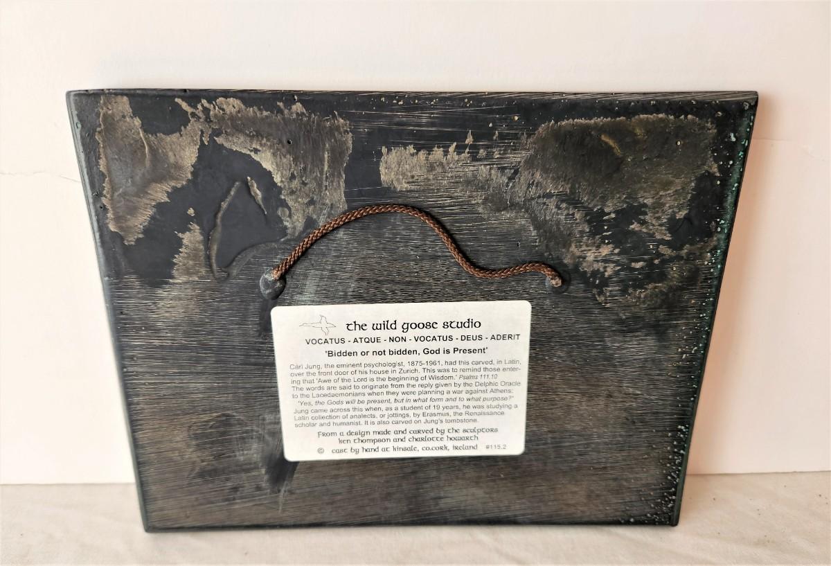 This great looking piece is perfect for the entryway to your home - Translated from the Latin is means "Bidden or Unbidden, God is Present." Good condition, 9" x 7". The famed psychiatrist Carl Jung had this carved over the entry way to his home in Zurich.