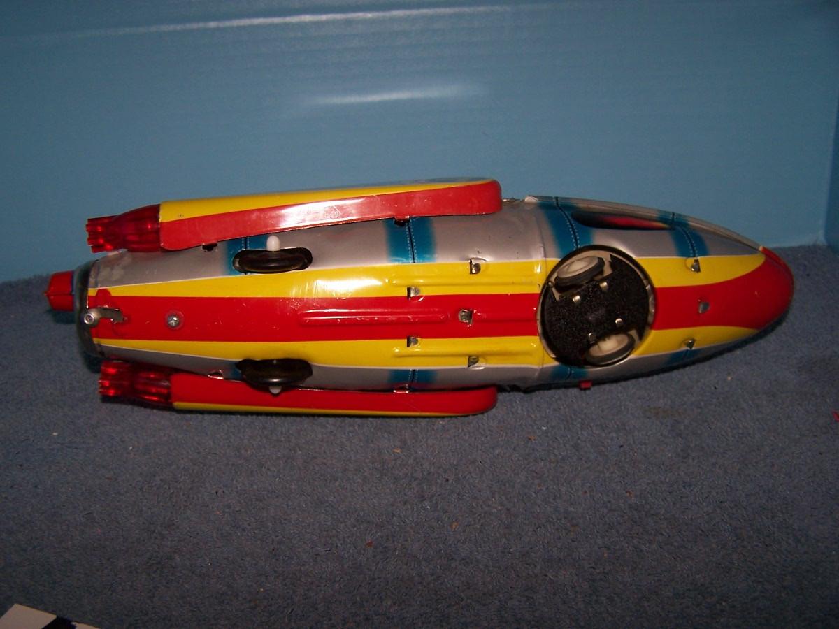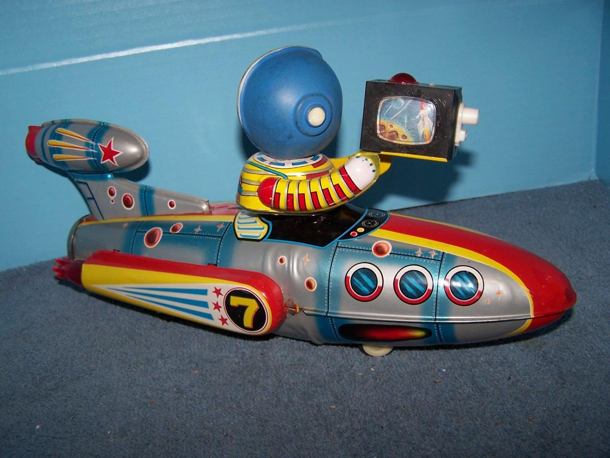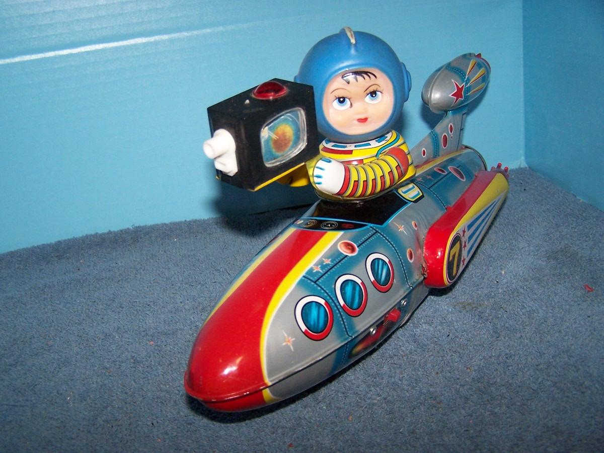 THIS IS A WONDERFUL COLLECTABLE TIN LITHO TELEVIBOAT SPACE ROCKET TOY!!! IT IS MARKED... 14'' LONG.. IT WORKS!!!! D CELL BATTERIES... LIGHT WEAR...