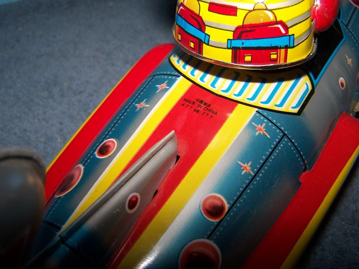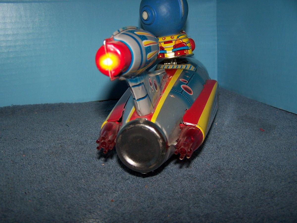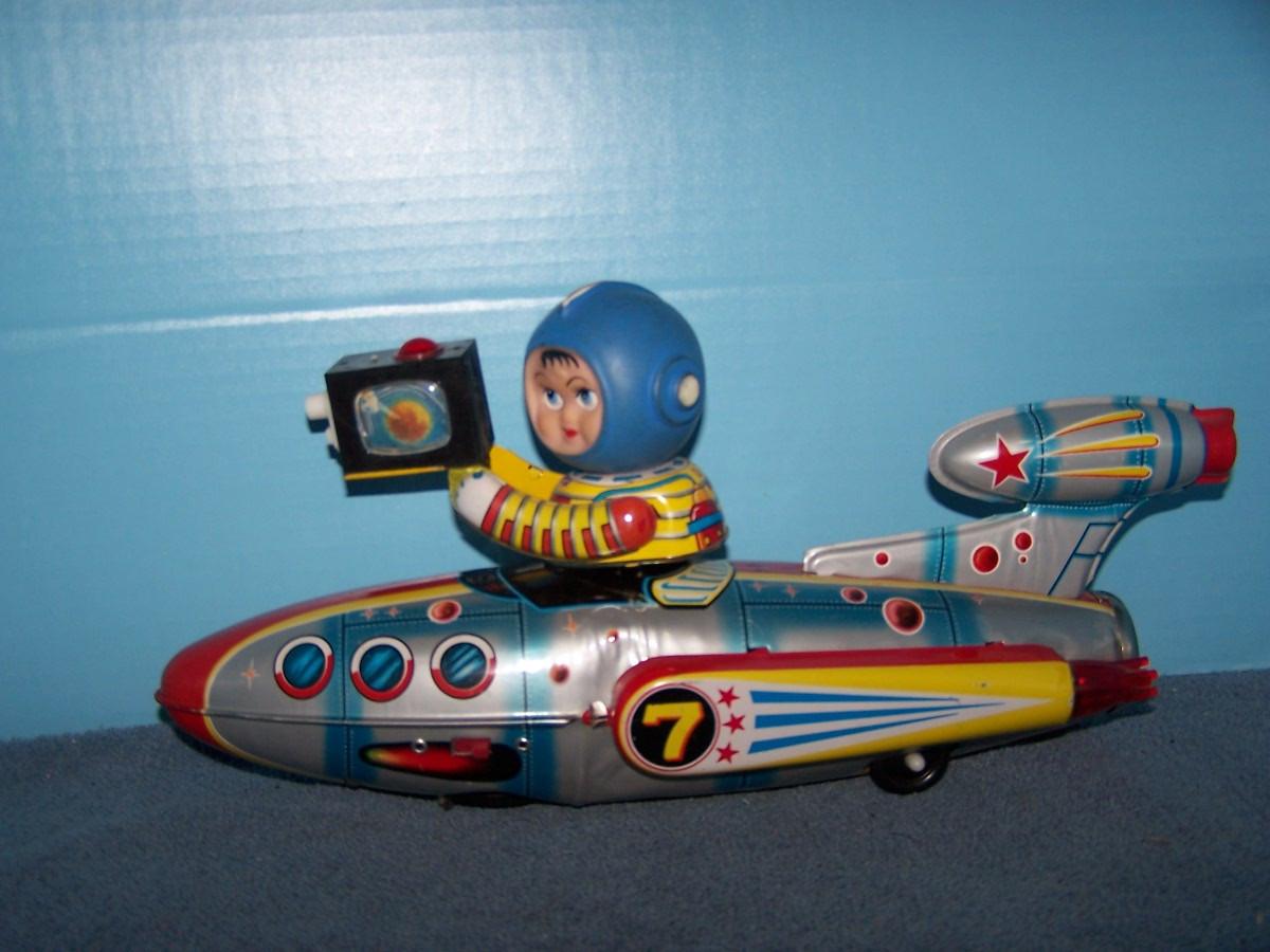 THIS IS A WONDERFUL COLLECTABLE TIN LITHO TELEVIBOAT SPACE ROCKET TOY!!! IT IS MARKED... 14'' LONG.. IT WORKS!!!! D CELL BATTERIES... LIGHT WEAR...