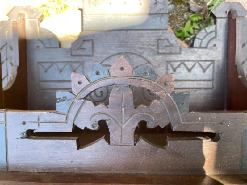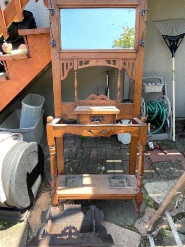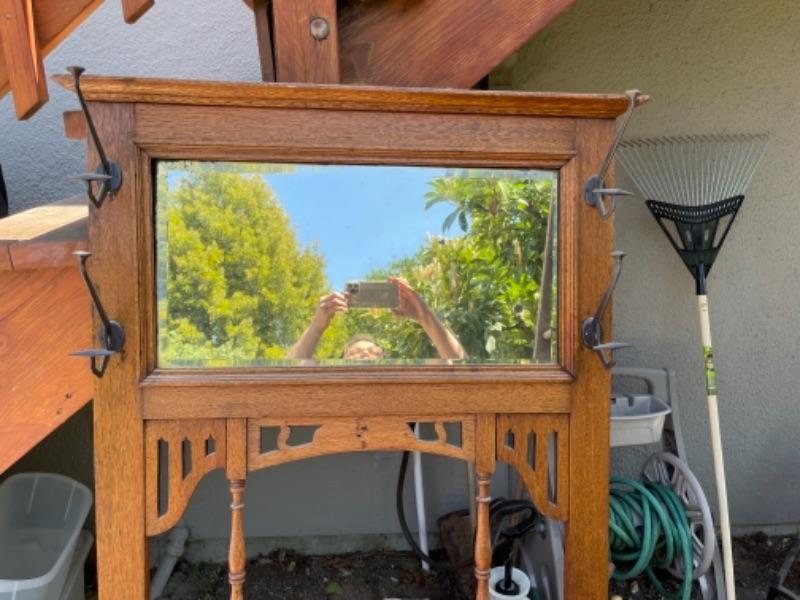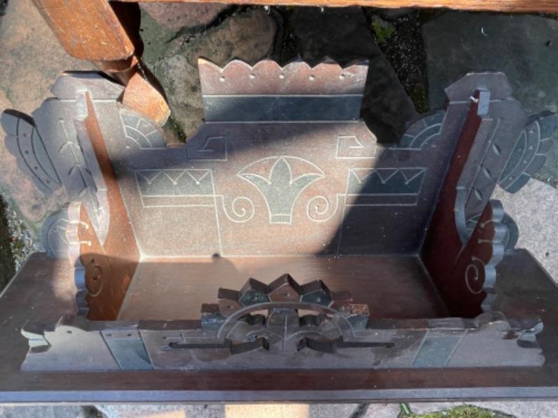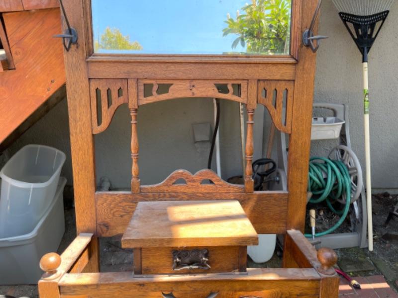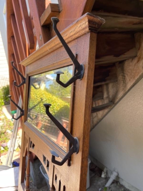 Lot 169G. Vintage oak hall tree (30”W x 13”D x 69”T) and Eastlake shelf--$125