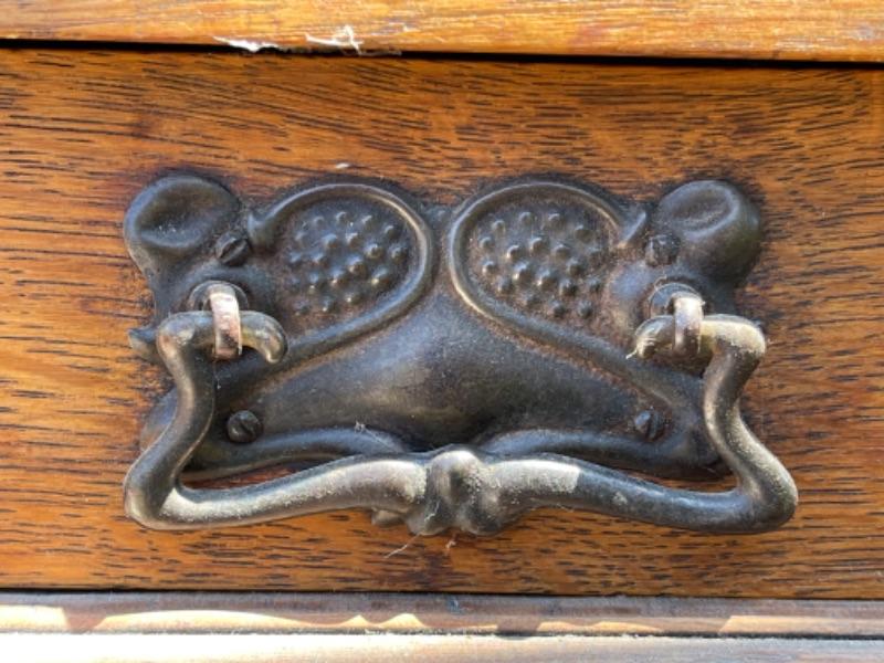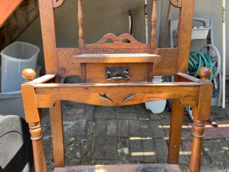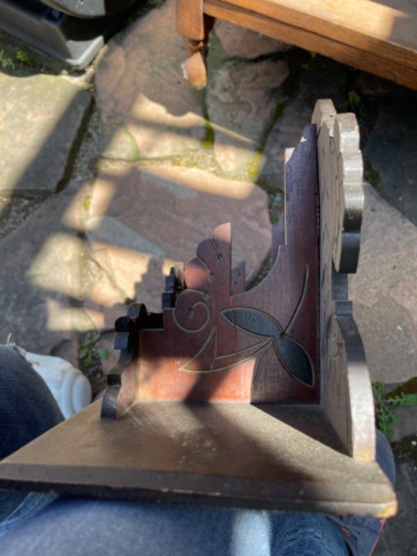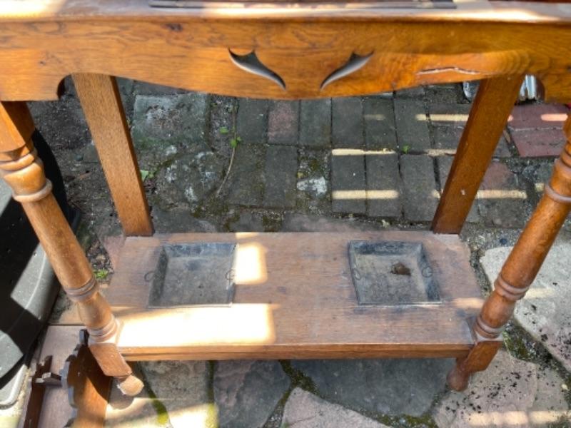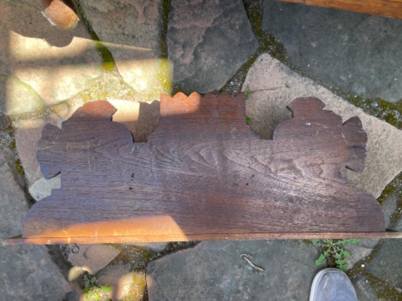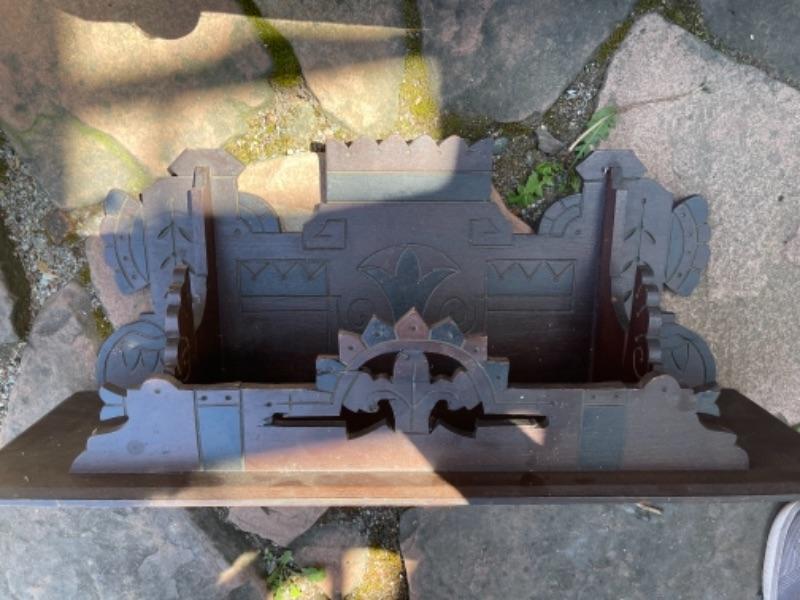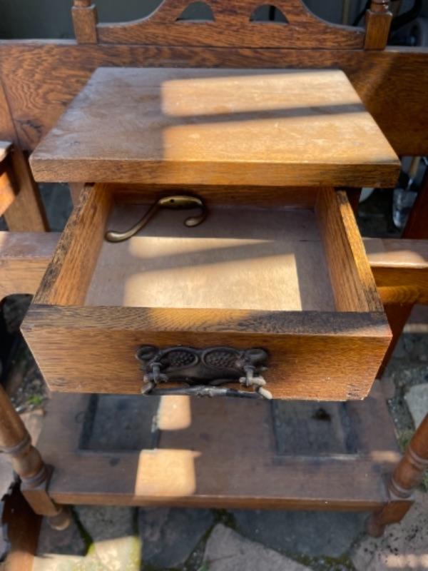 Lot 169G. Vintage oak hall tree (30”W x 13”D x 69”T) and Eastlake shelf--$125