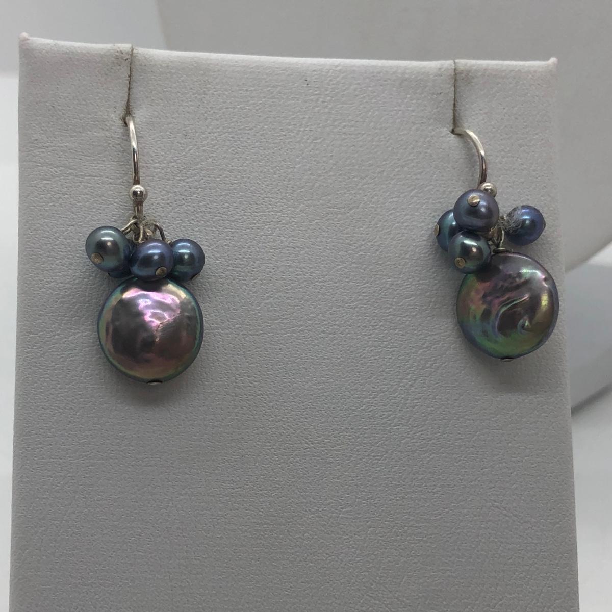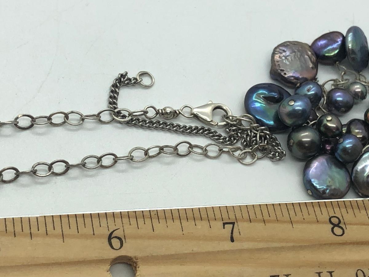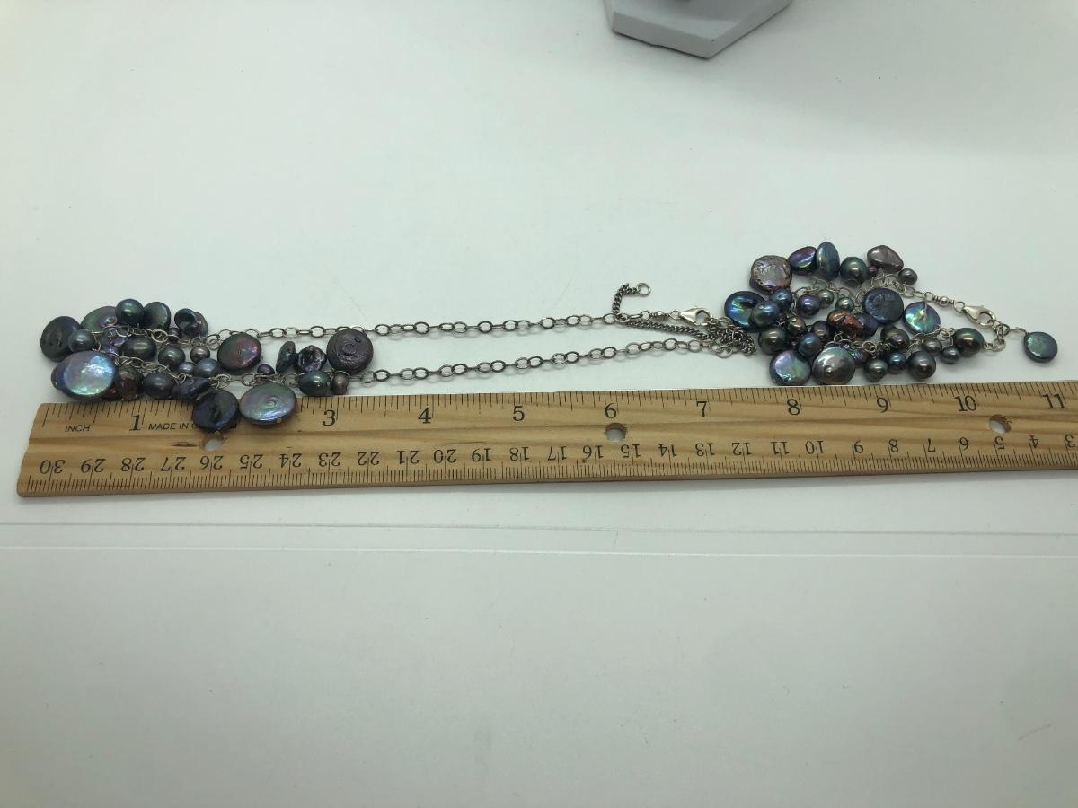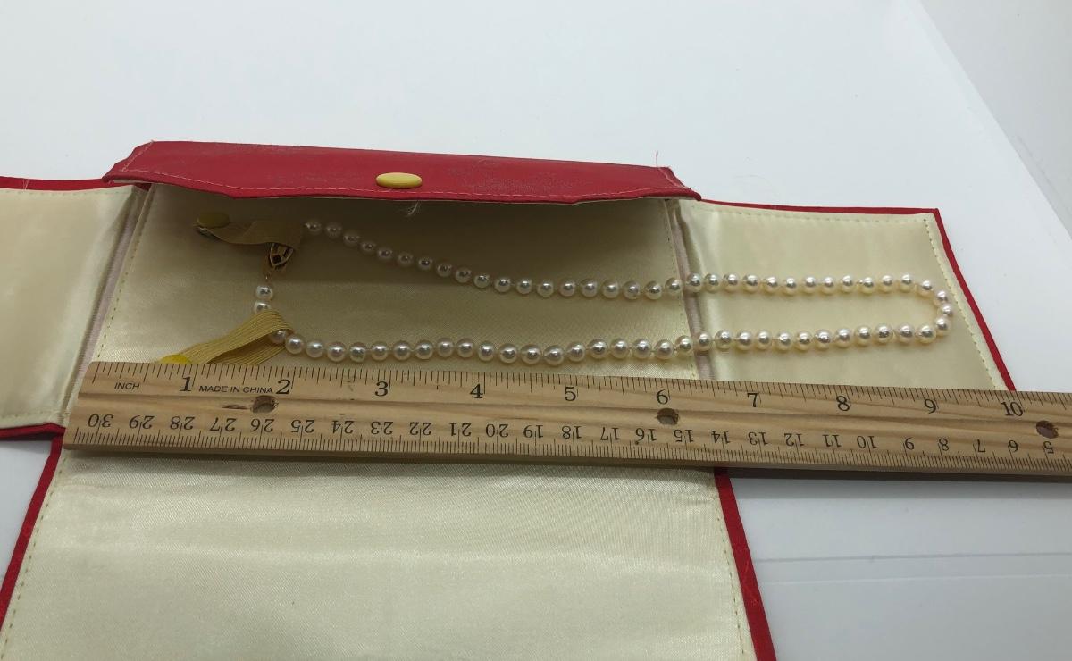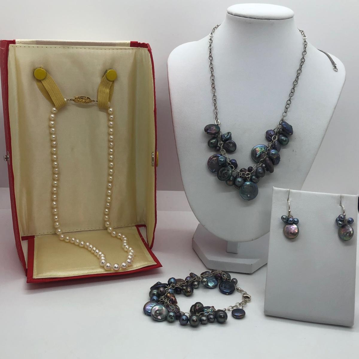 Black pearl set includes matching bracelet, necklace, and pierced earrings. Other necklace is in a red cloth envelope, as pictured.