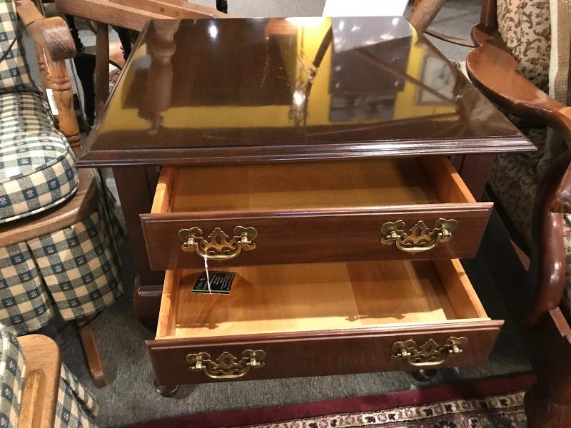 Nice mahogany end table by Ethan Allen. Features two drawers with Chippendale style brass pulls. Shaped skirt and Queen Anne legs. Top has some finish loss in the center, which is easily covered by a lamp. 24" x 24" x 23" H