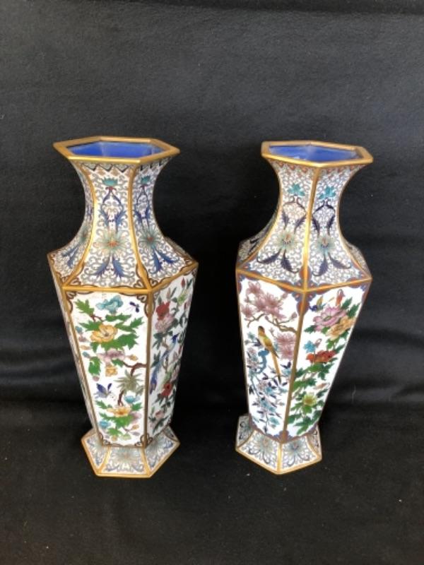 Lot 16P. Cloisonné tall vases, from China, 1 Pair 6 sided white background, 15 1/2” T x 6” W“” $345