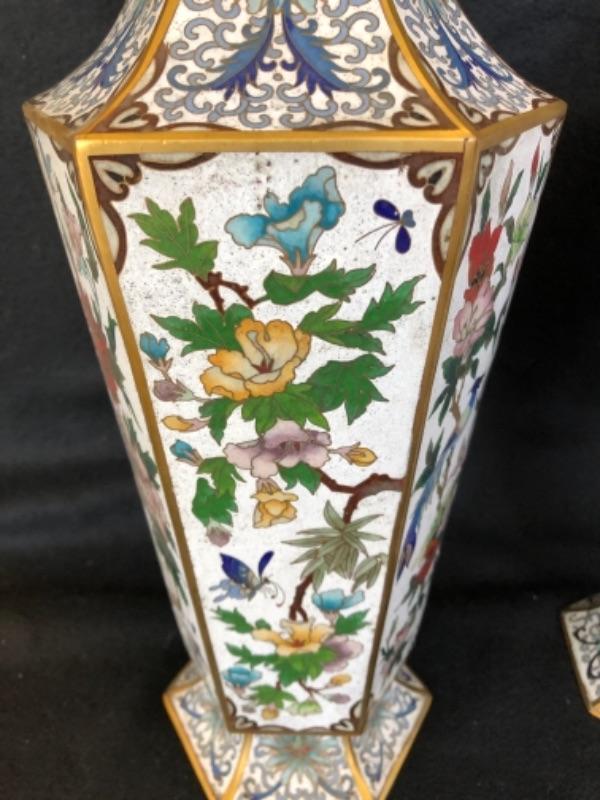 Lot 16P. Cloisonné tall vases, from China,  1 Pair 6 sided white background “” $345