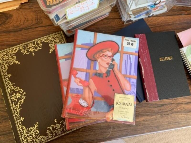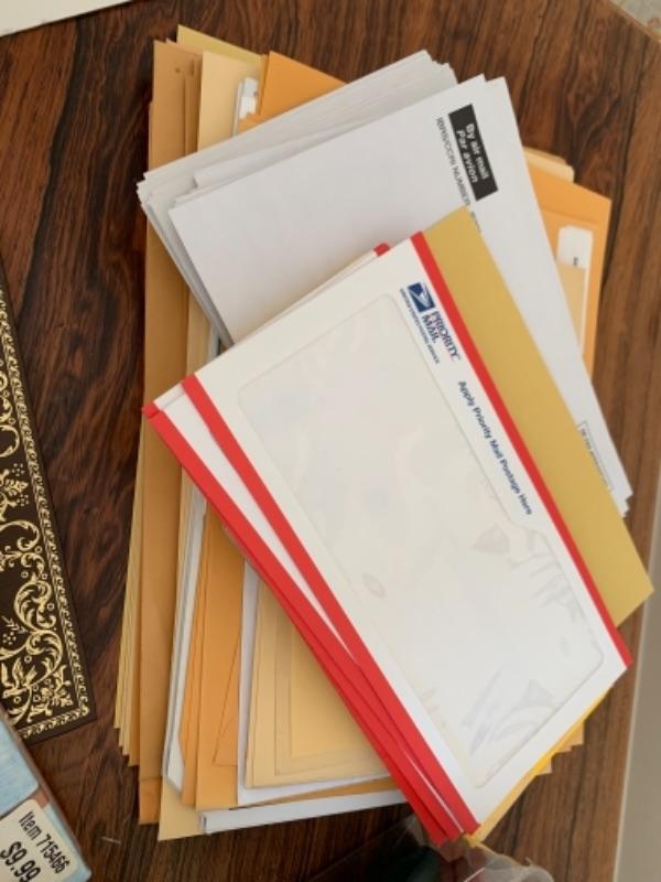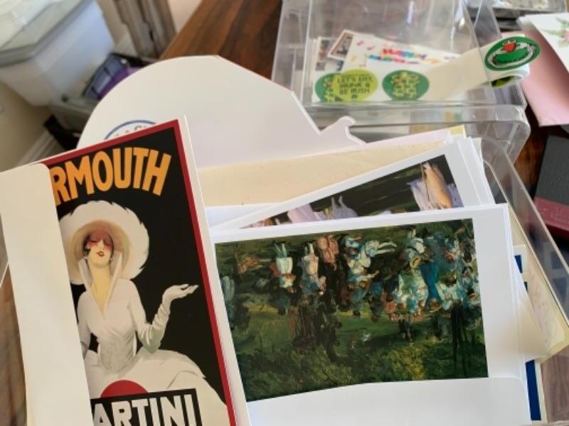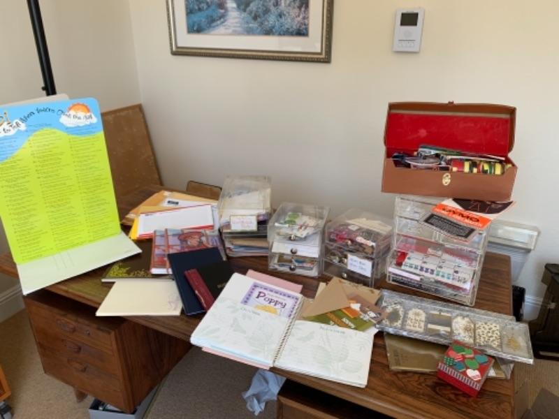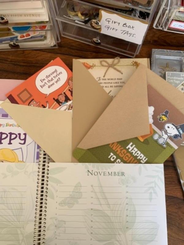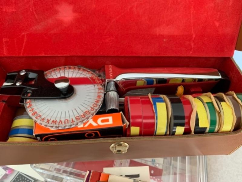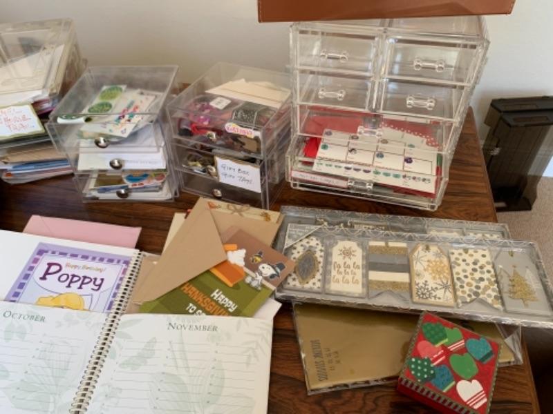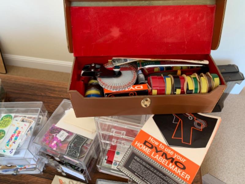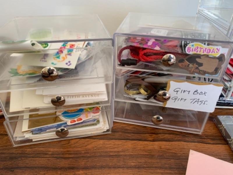 Lot 16U. Gift tags, envelopes, lucite storage boxes organizer, Dymo label maker, large gift cards,  confetti, etc.--$75