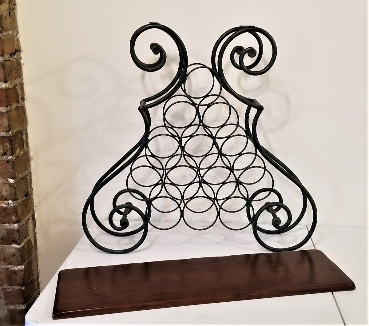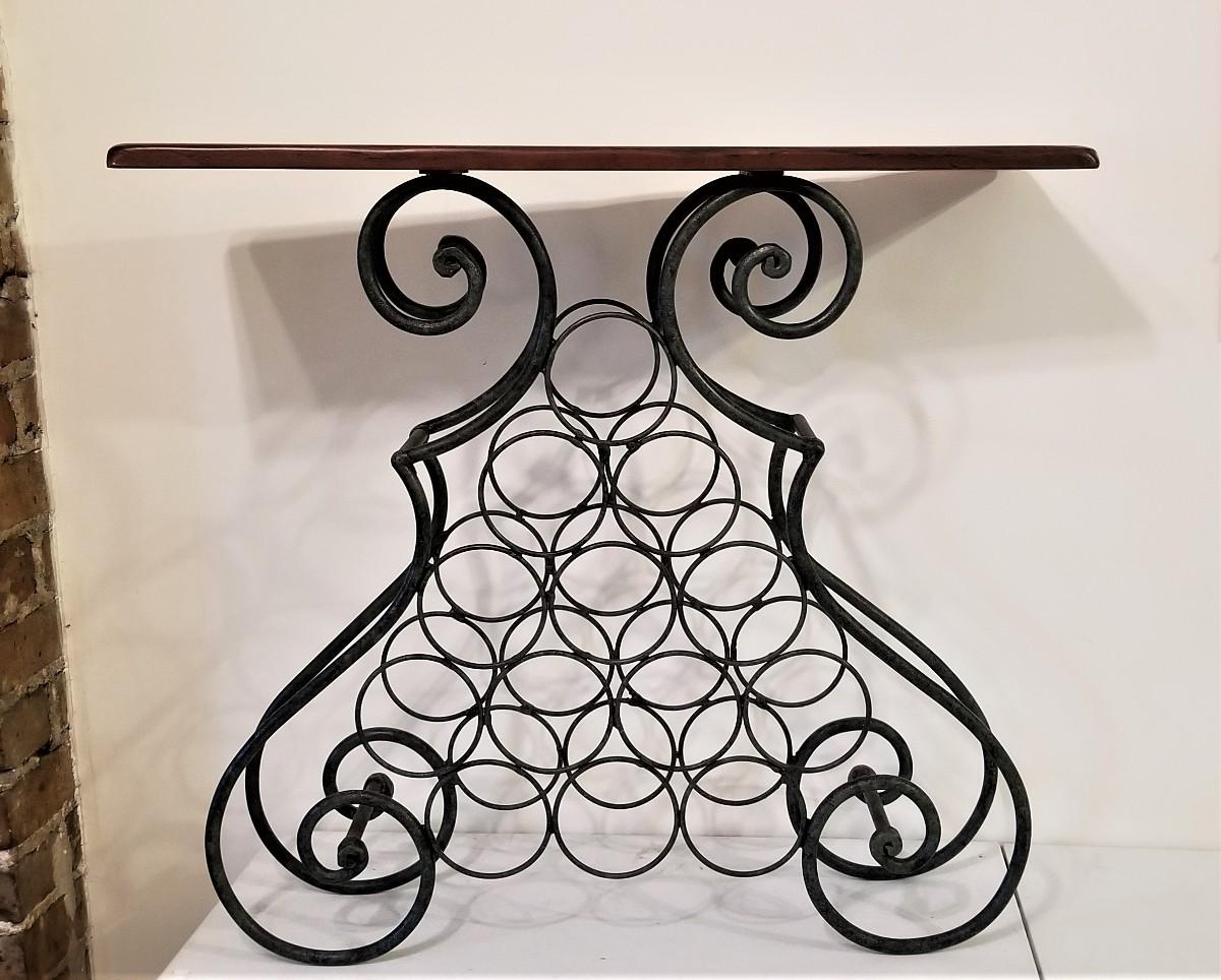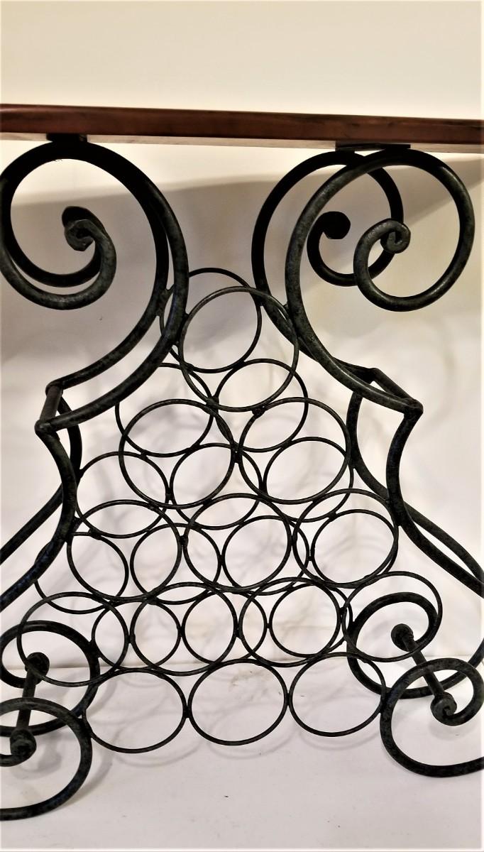 Metal table base with removeable wooden top holds 13 bottles of wine. Shelf is 30.5" Across, 9: deep, and 28" tall. Top lifts off. Good condition.