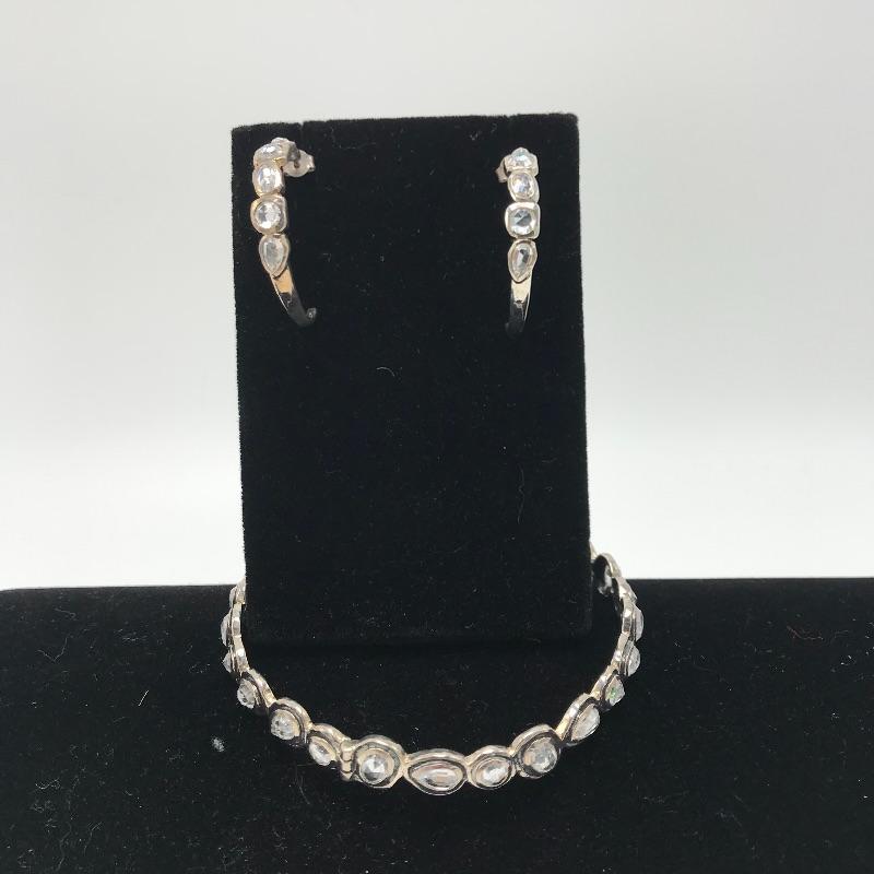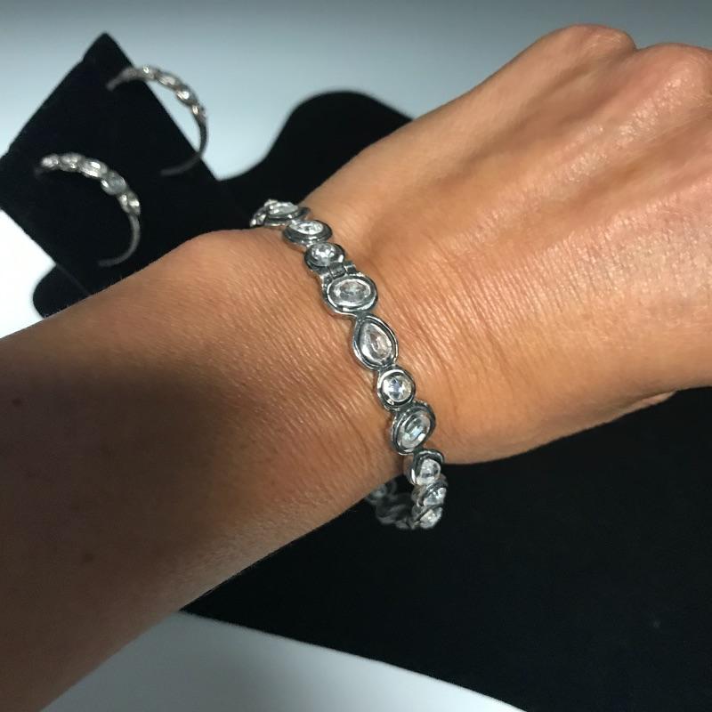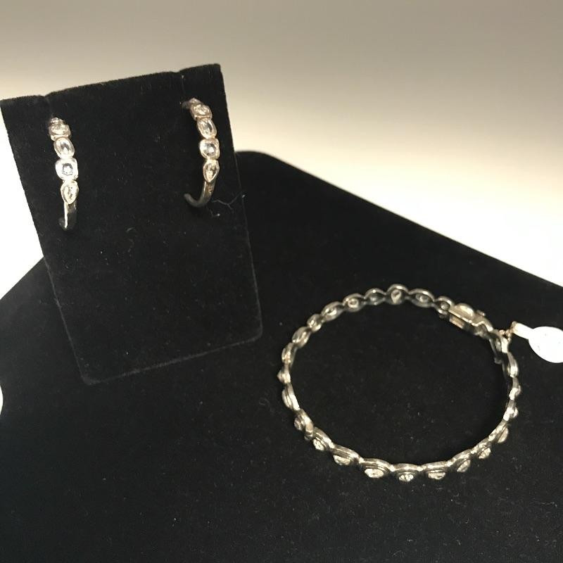 You deserve something magnificent. Beautiful sterling bracelet with custom cut cubic zirconia, box clasp and safety chain. Bracelet comes with matching sterling earrings with cubic zirconia throughout. See photos.