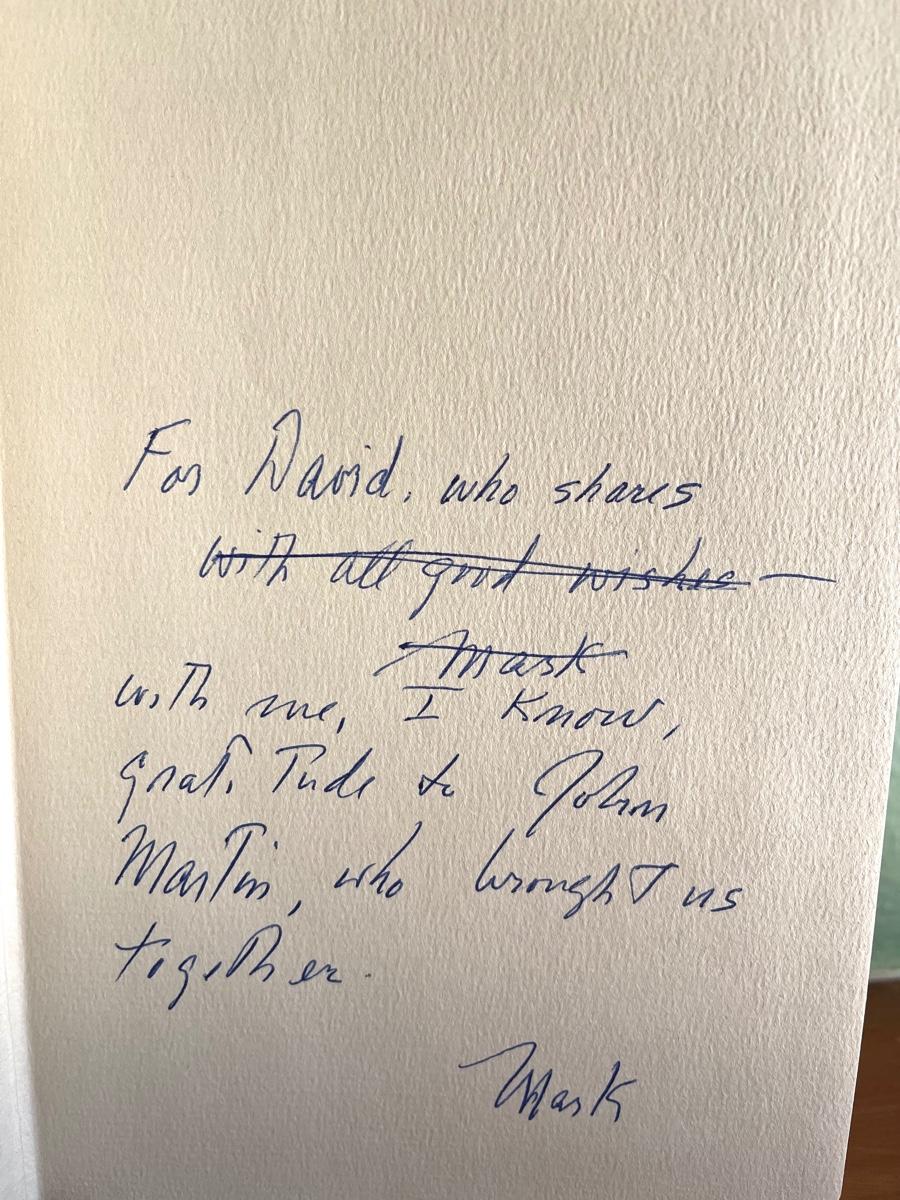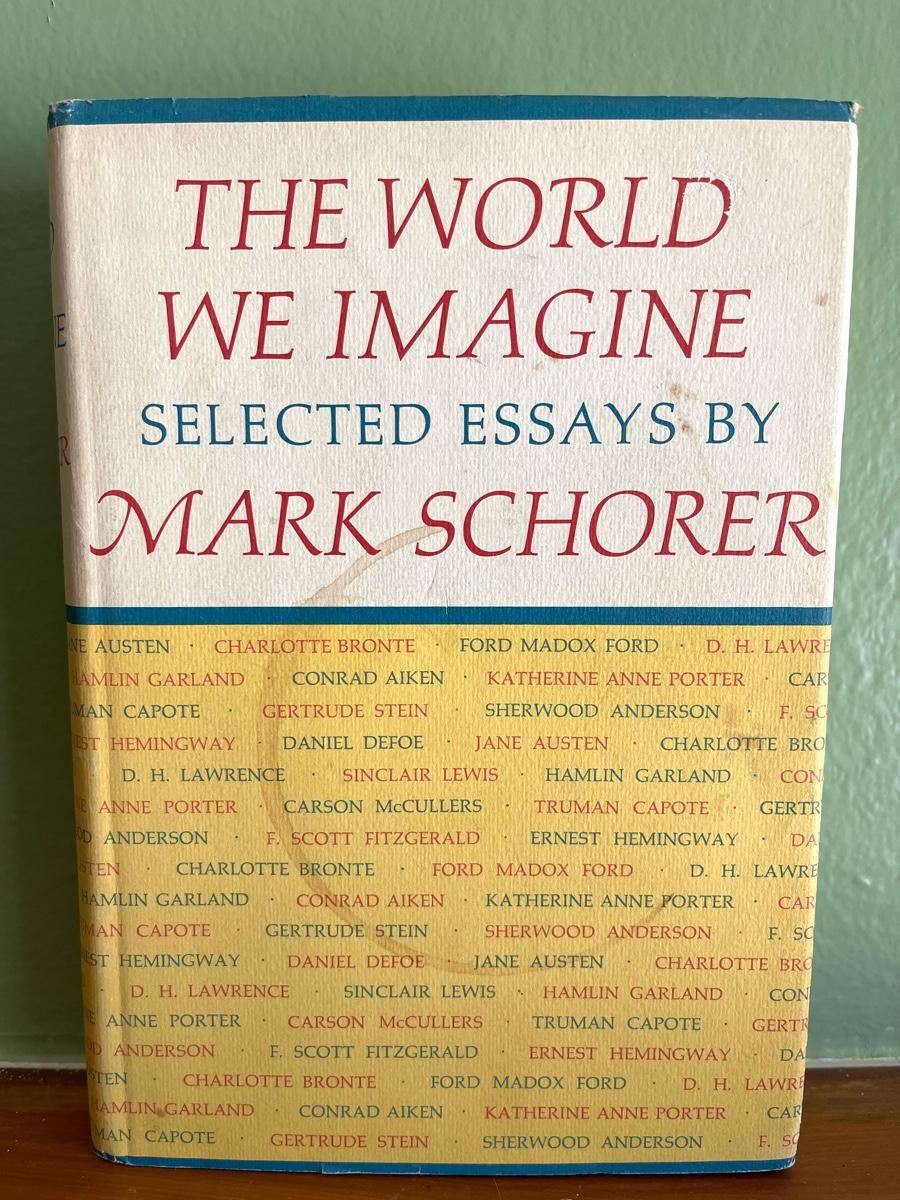 LOT 17 - The World We Imagine signed by Mark Schorer. A book of Selected Essays. It includes a personal inscription to David from Mark. The dust jacket has some marks and darkening from age. Overall inside pages are clean and neat. Slight damp scent.