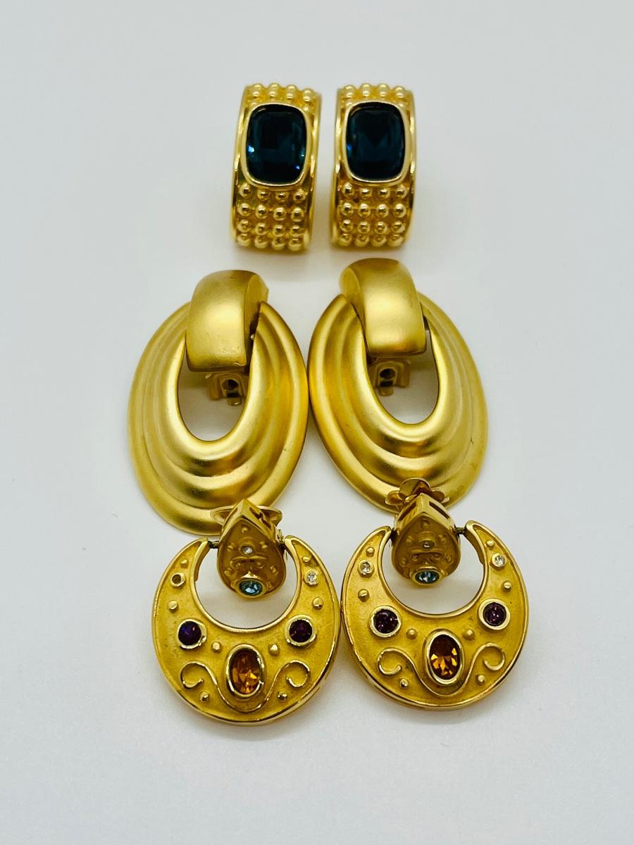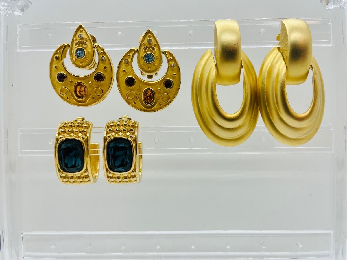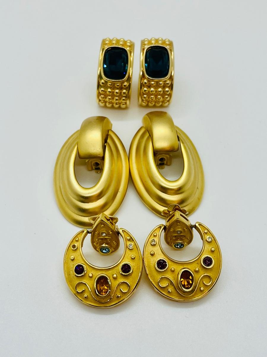 These are gorgeous in person and are chunky earrings! The gold pair that looks to have gem stones bling sparkle and look high end! One pair signed S.A.L. The pictures show condition, measurements if taken, and what is included in the lot. Due to the large amount that we photograph and the time frame, we are not always able to take measurements. All items unless noted, are pre-owned and have been used, and are untested. Thank you