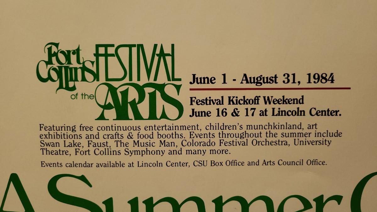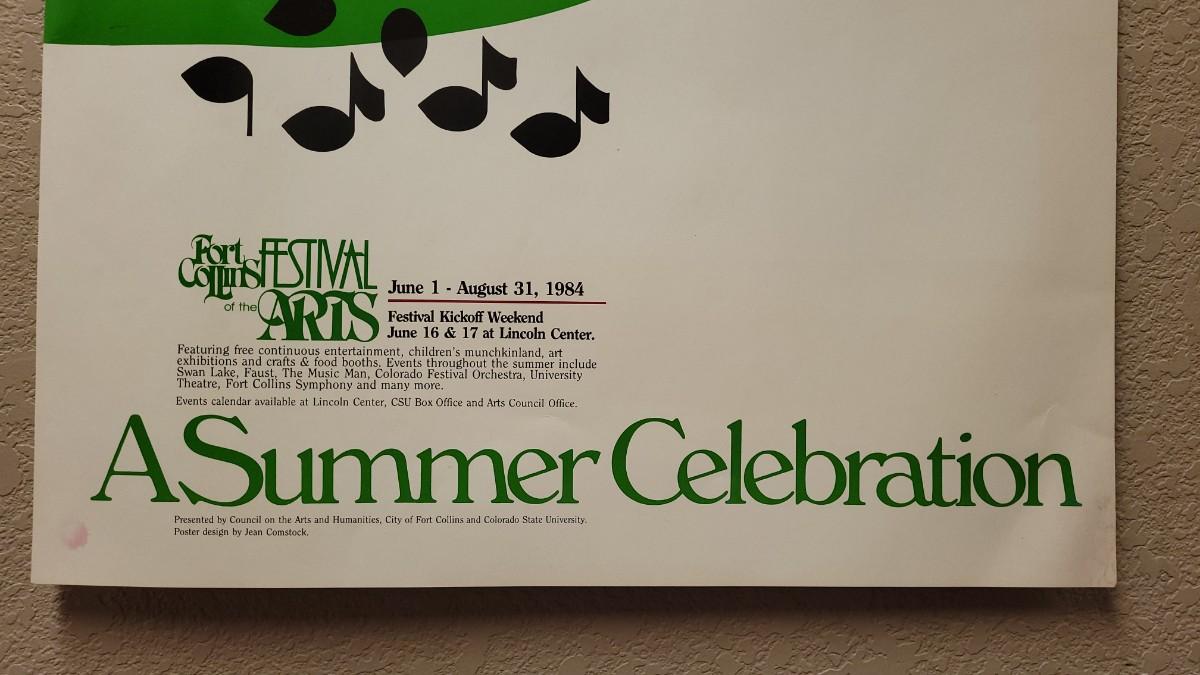 This lot features a fun original promotional poster from 1984 to humanities and the city of Fort Collins and coordination with Colorado state University. By Jean Comstock. 19" x 27".