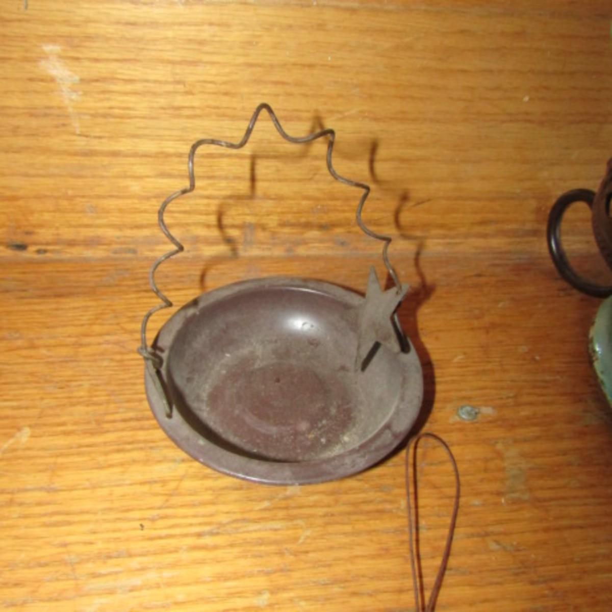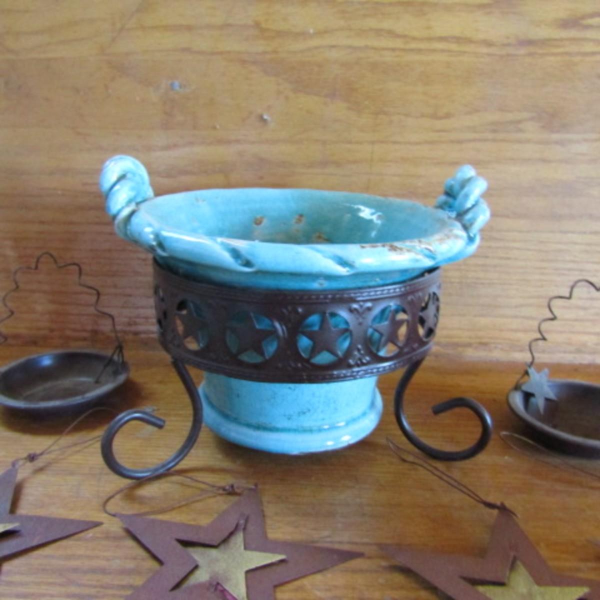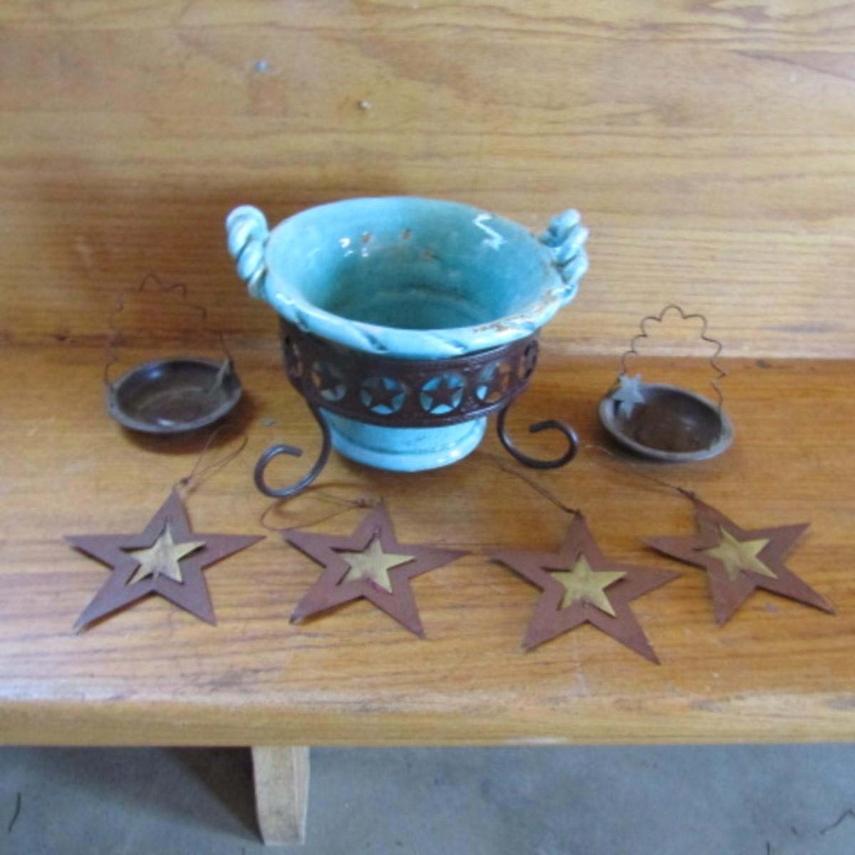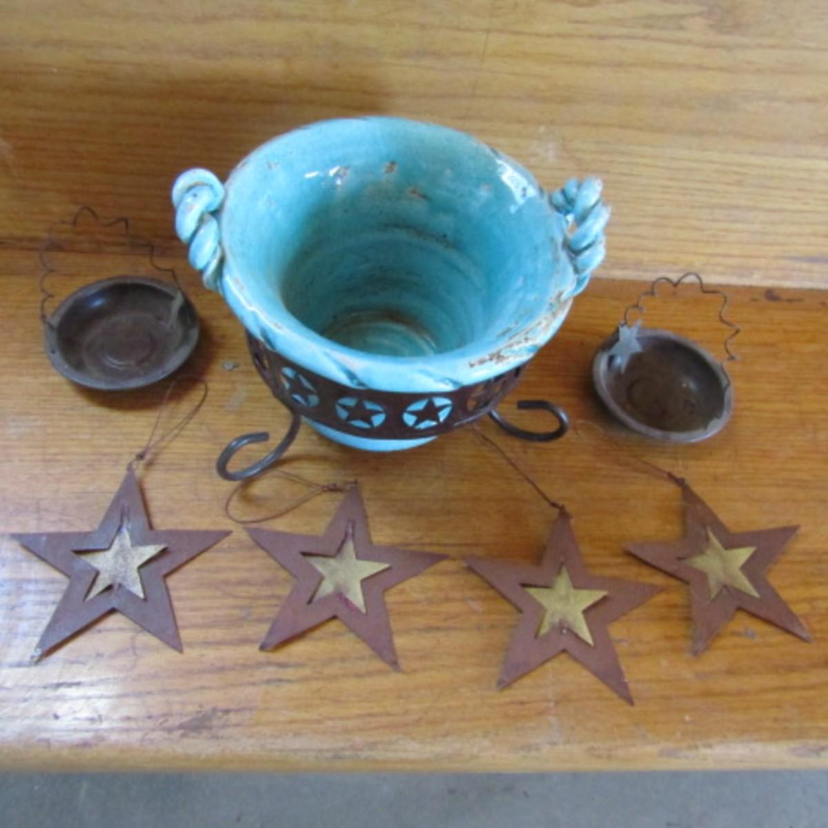 DOUBLE HANDLE CLAY POT IN A METAL HOLDER, 2 METAL BOWLS WITH HANDLES, 4 STAR ORNAMENTS
