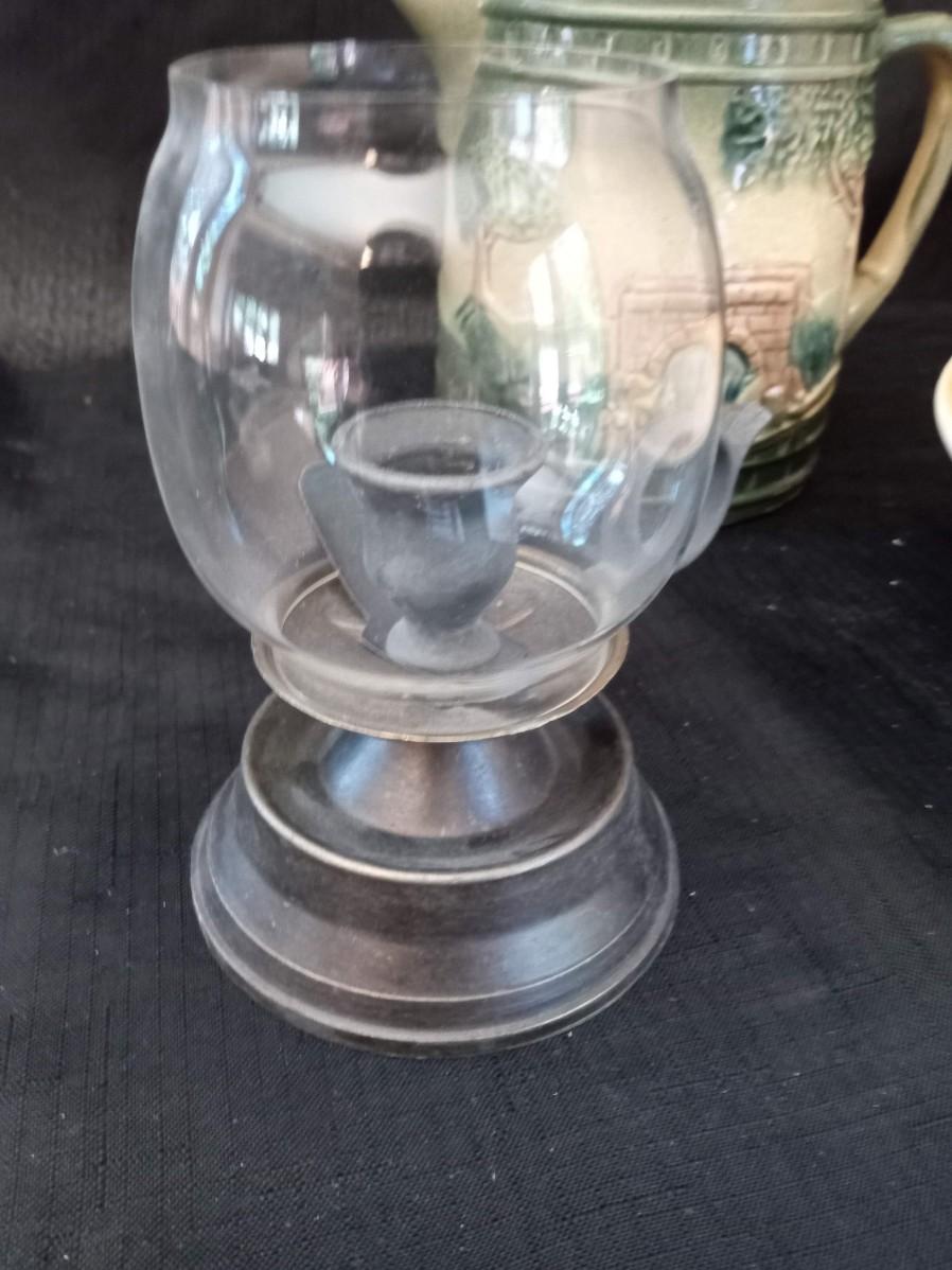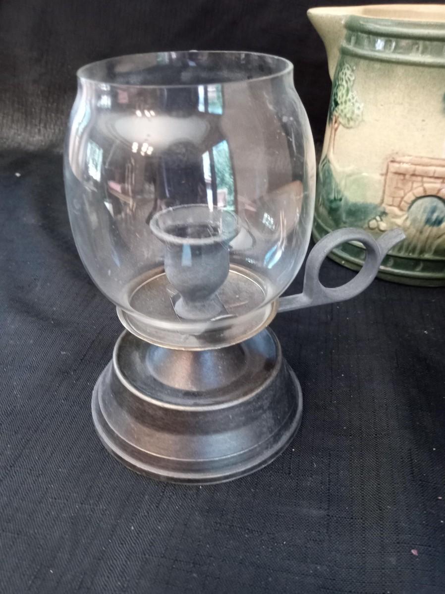 LOT 17  ANTIQUE CHILD'S BOWL, CREAMER AND A CANDLE LANTERN WITH HURRICANE