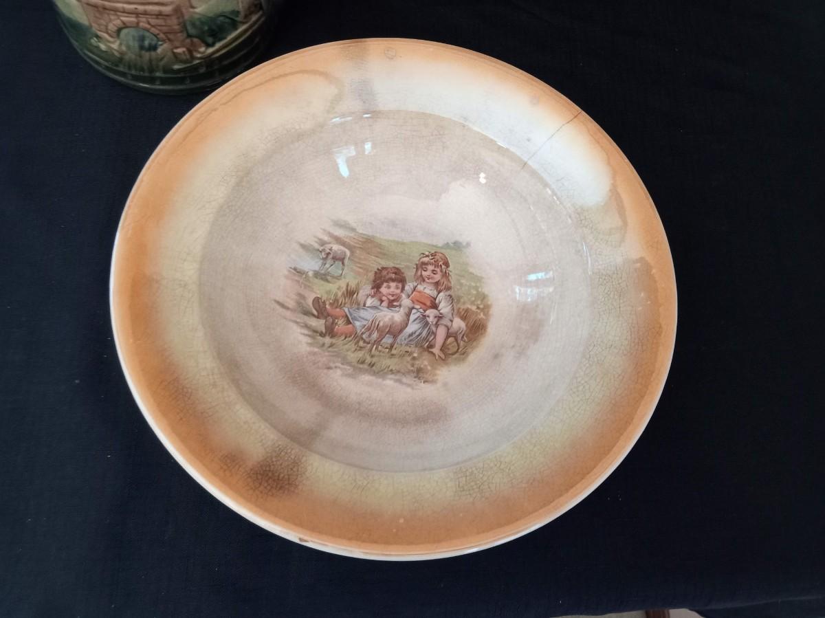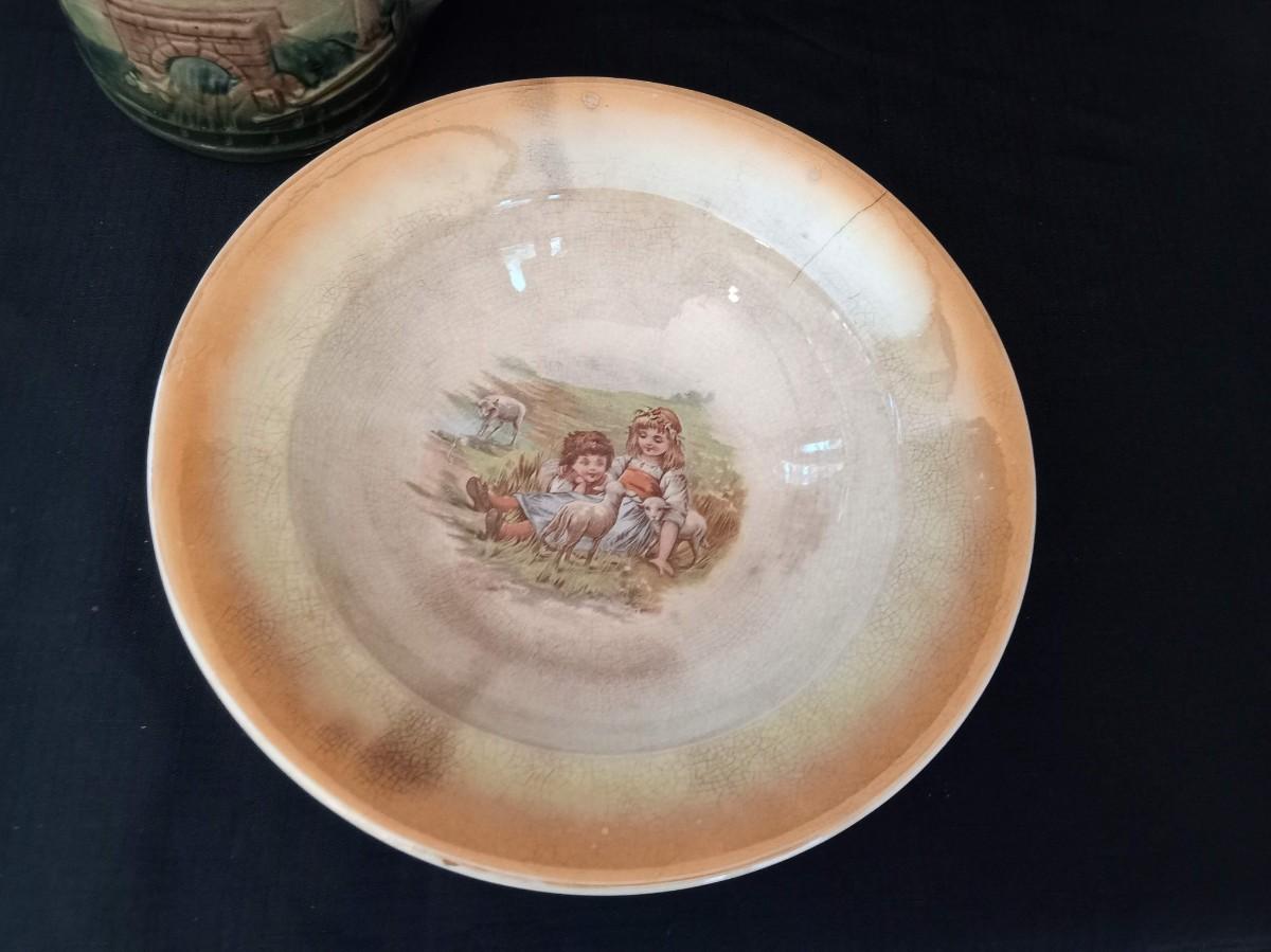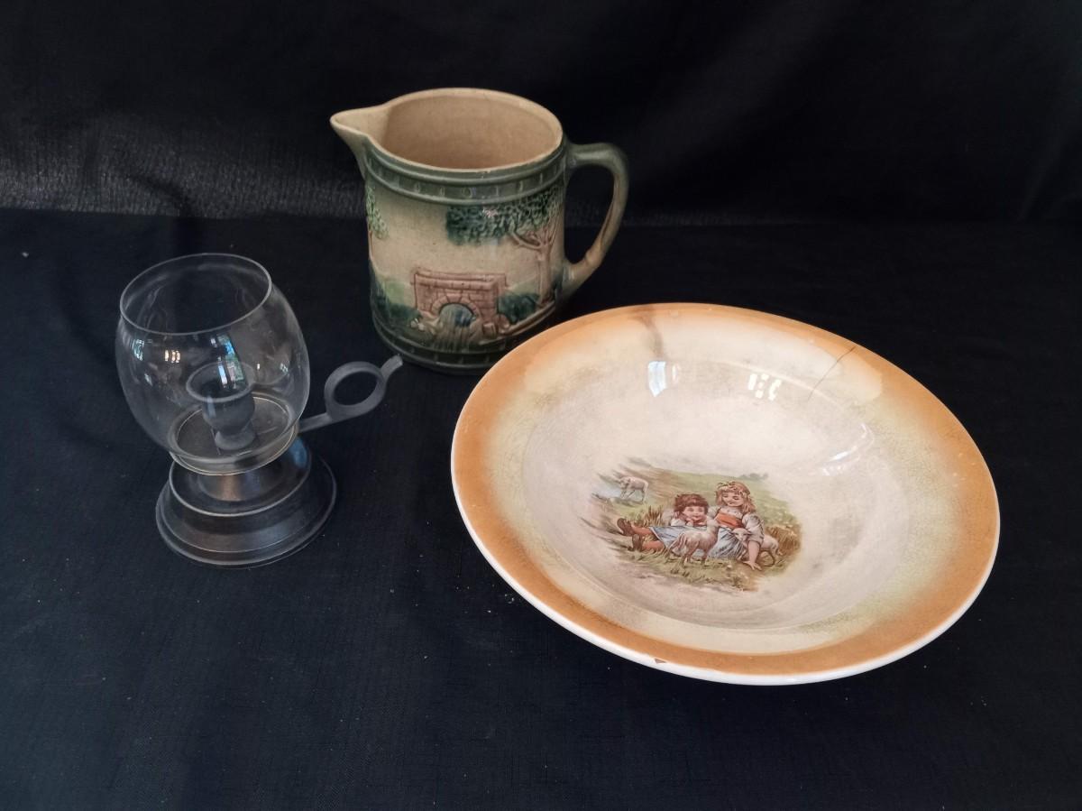 LOT 17 ANTIQUE CHILD'S BOWL, CREAMER AND A CANDLE LANTERN WITH HURRICANE