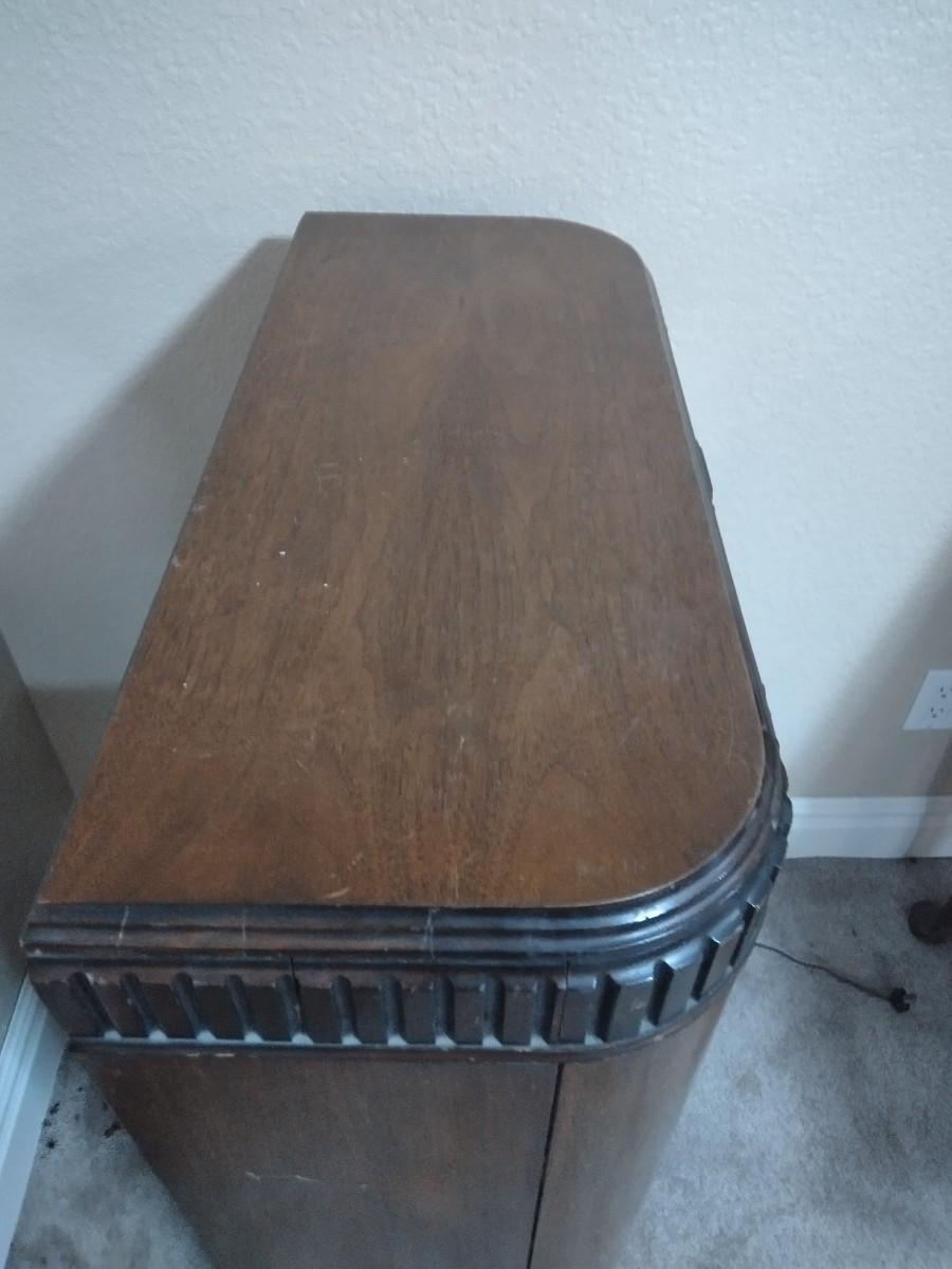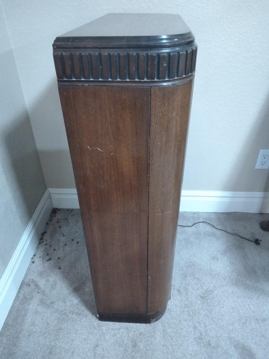 ANTIQUE PHILCO TUBE RADIO IN CABINET. THIS UNIT DOES POWER ON AND MAKE NOISE. 40" X 25" X 11"