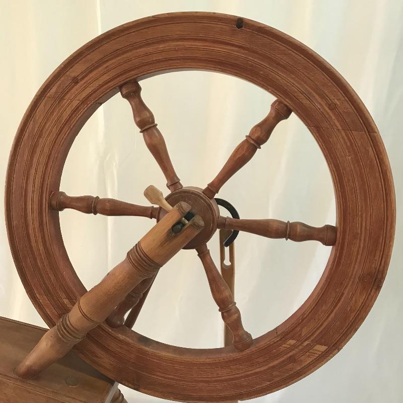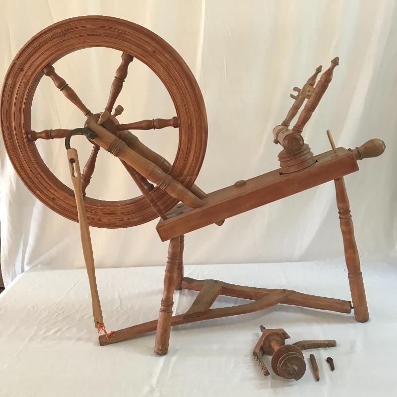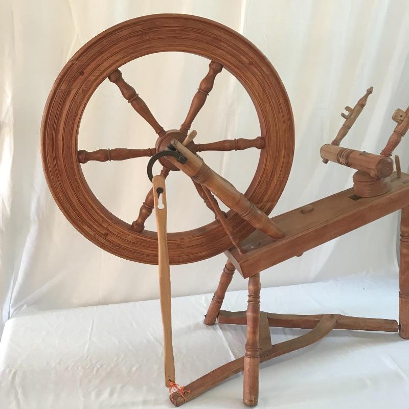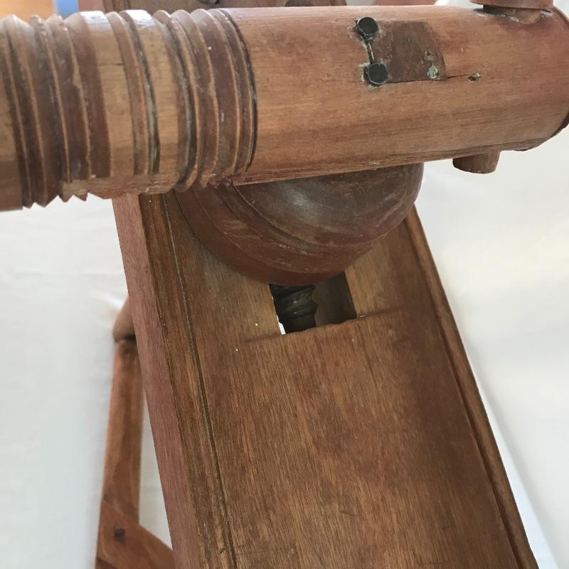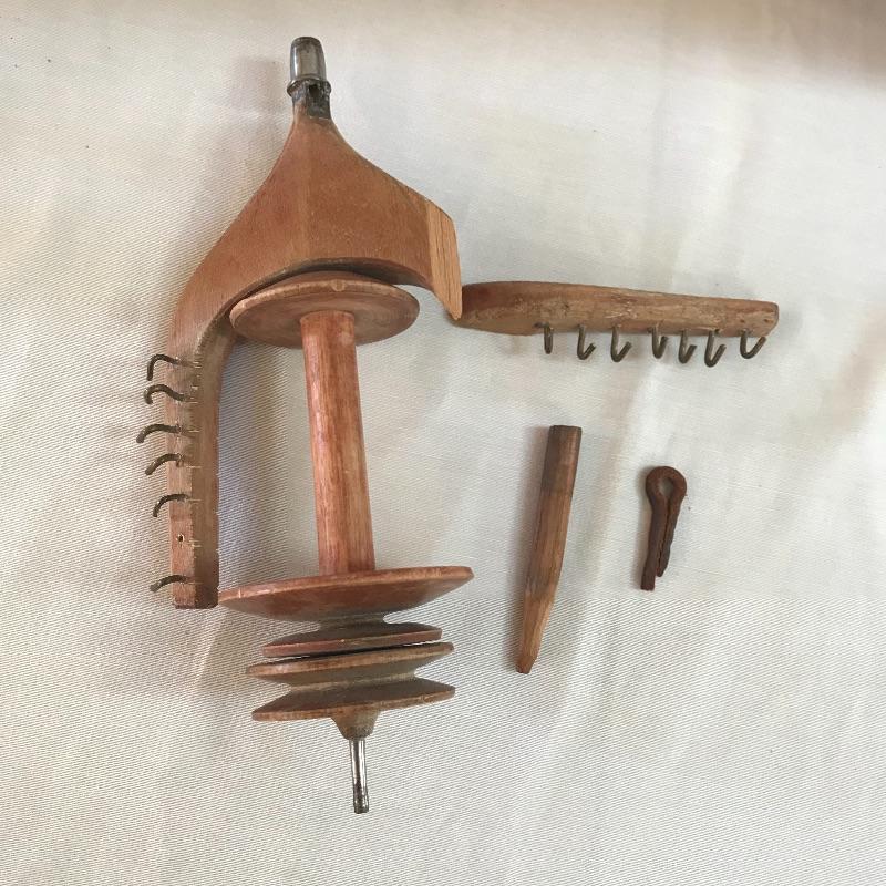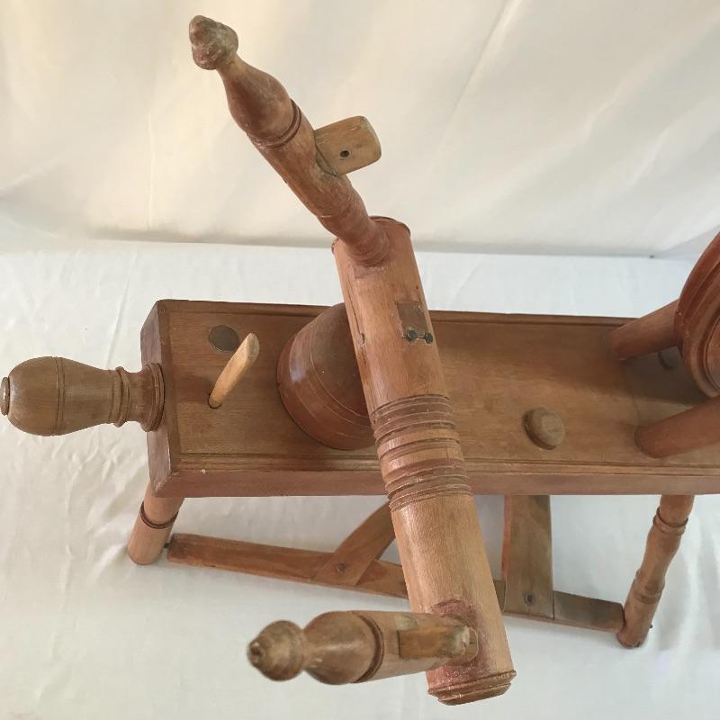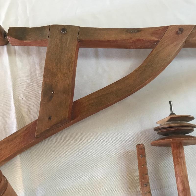 Jaw dropping tool from long ago! Spinning wheel made of solid wood with a few metal parts like the axel and hooks. It’s in great shape, given its age. Some noticeable wear is noted in photos. Piece is roughly 31.75” tall and 37” long. No shipping.