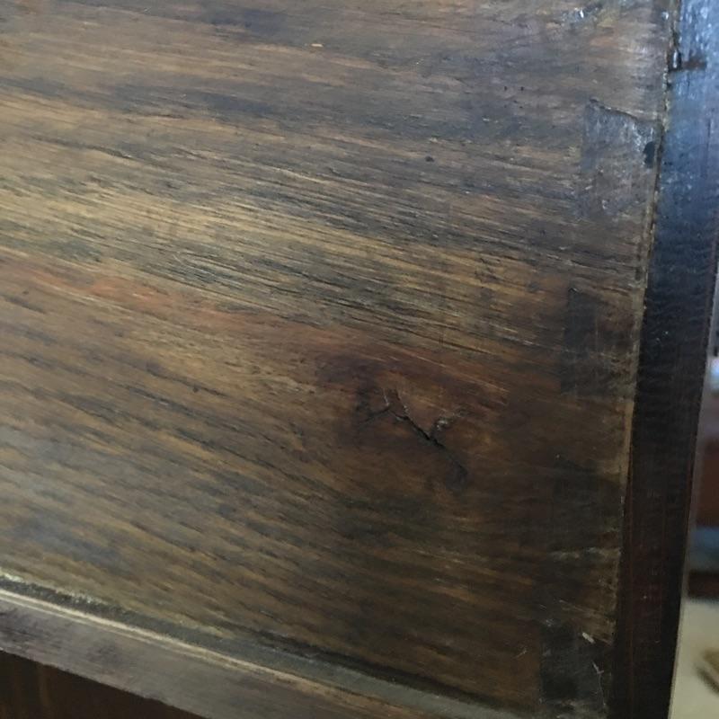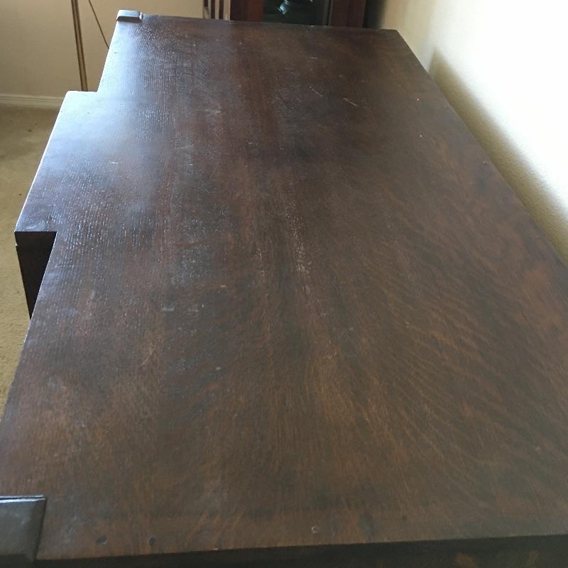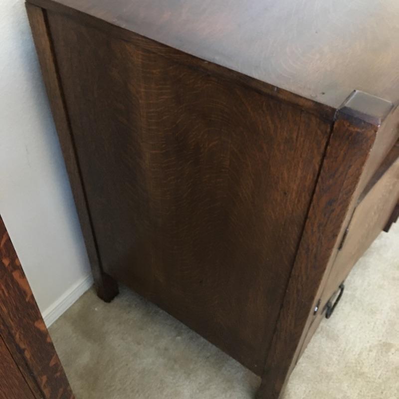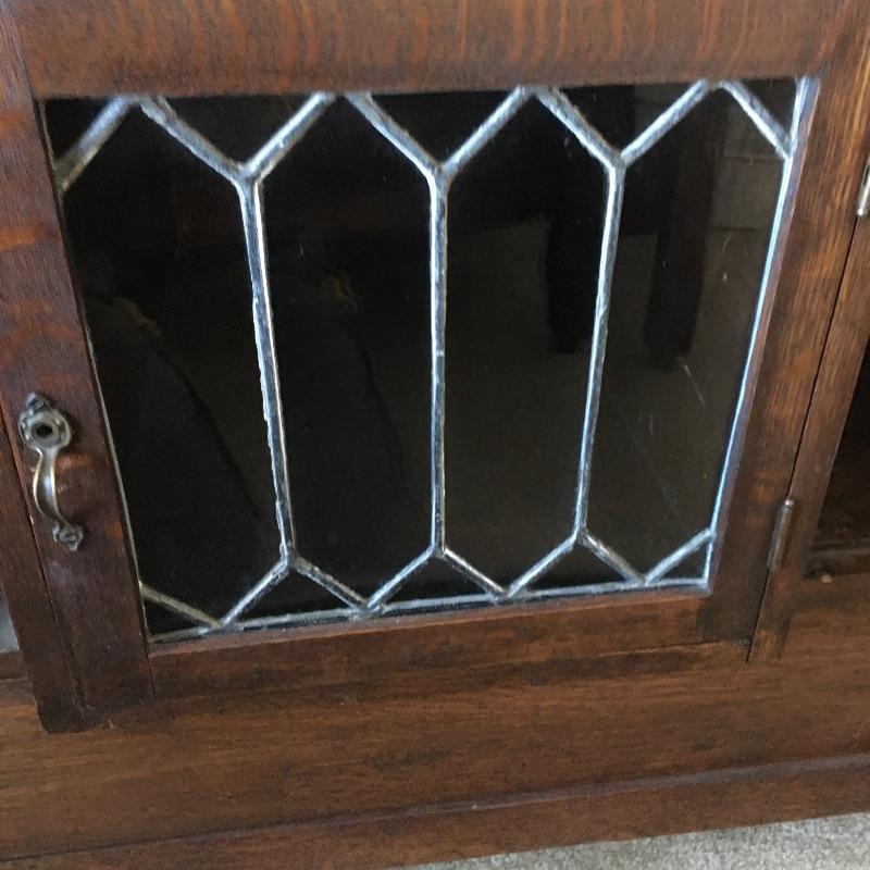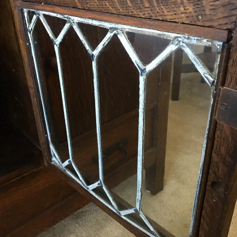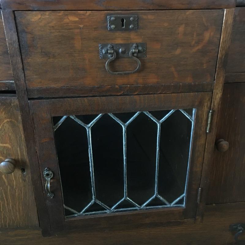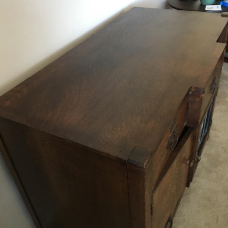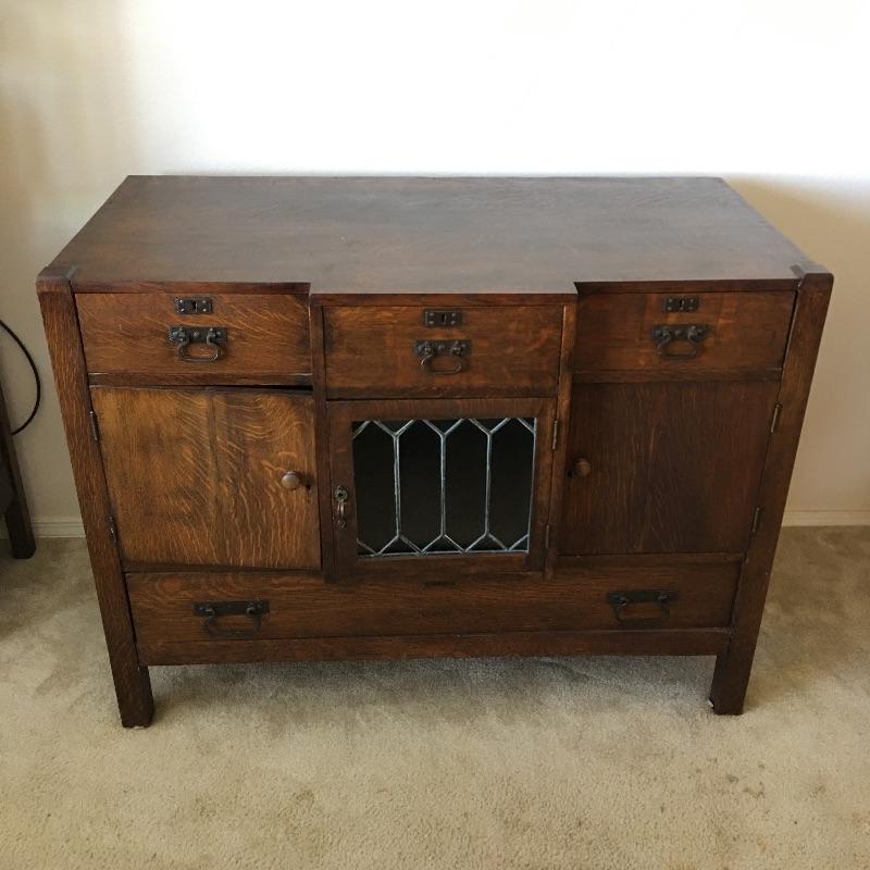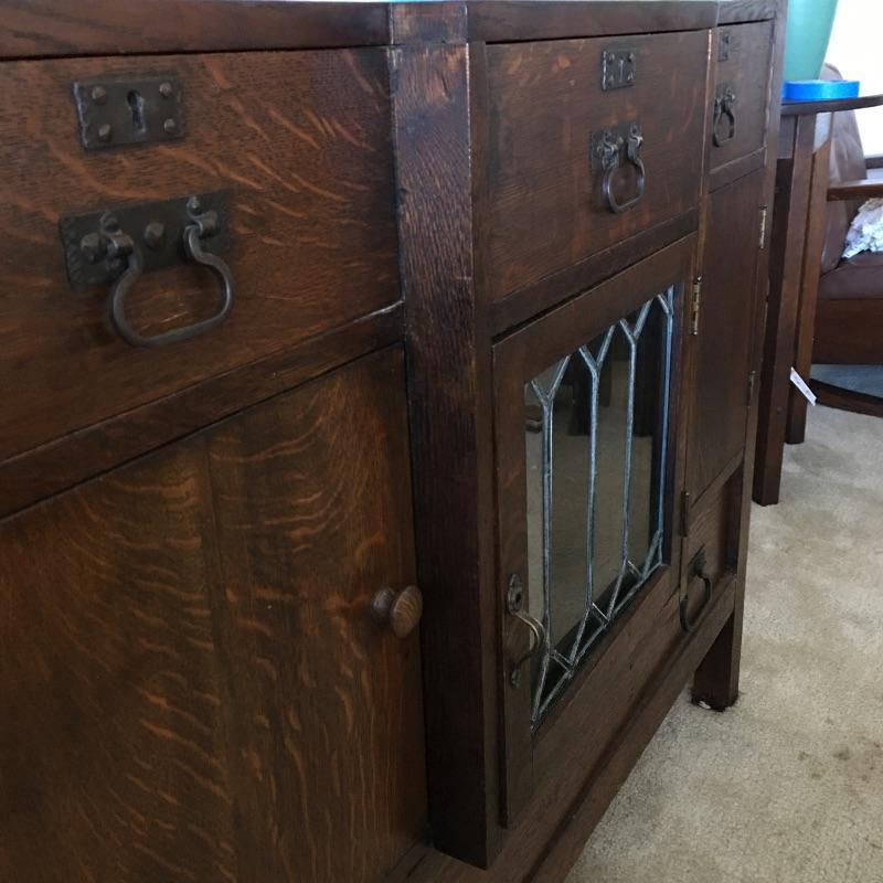 Arts & Crafts buffet. Exquisite Arts & Crafts buffet with three small dovetailed drawers on top, three cabinet doors with one being glass and a large drawer on the bottom. They say a picture is worth a thousand words and that is true with this amazing piece. Left cabinet door will not stay latched. Buffet measures 23.25” x 47” x 35.25” with a protrusion in the middle that measures 1.75” x 15.75” x 21”.
