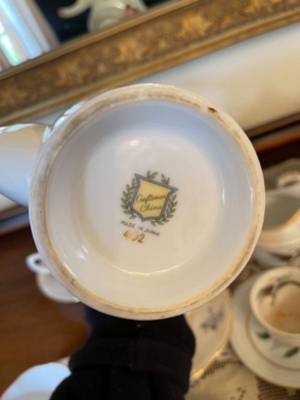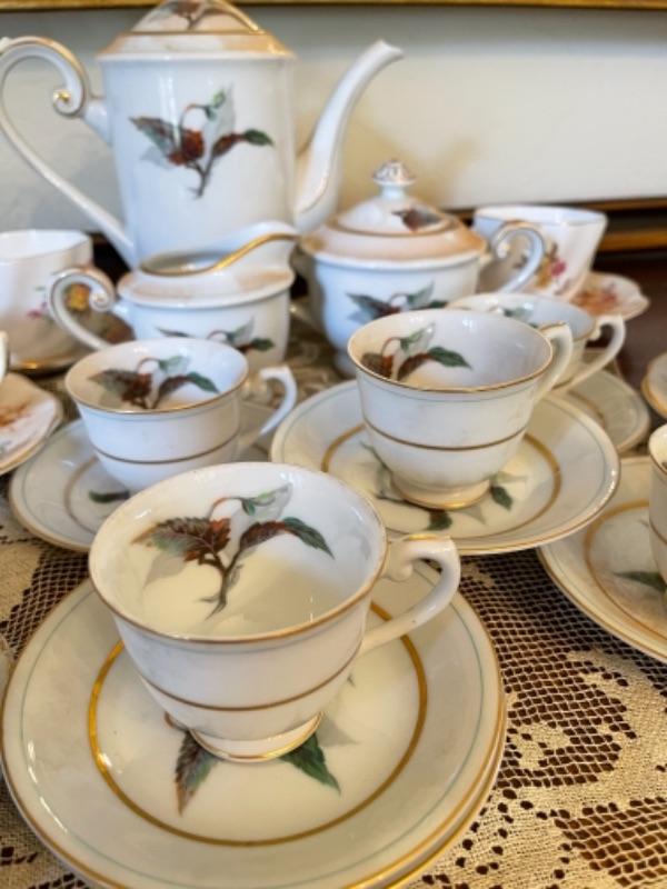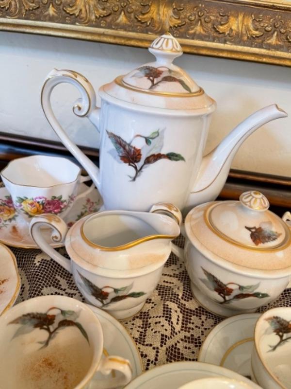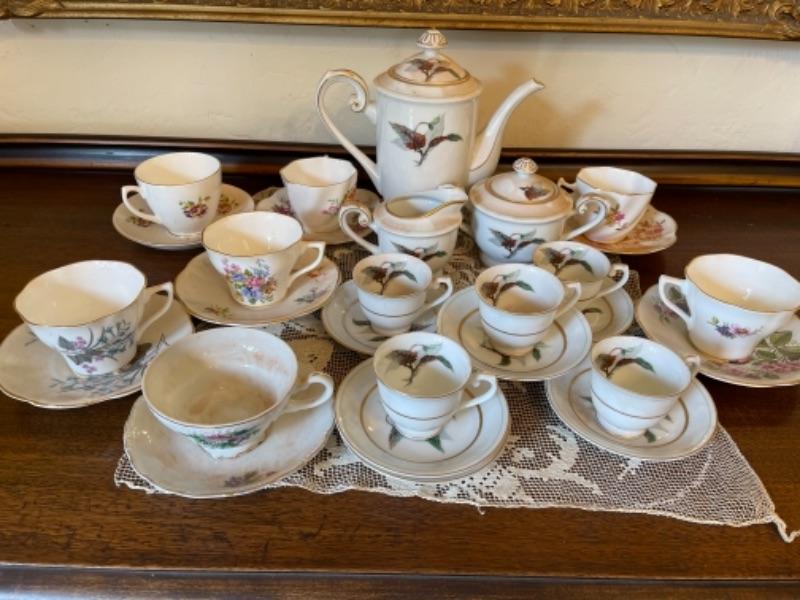 Lot 17. Assortment of English cups and saucers, along with demitasse set (Japan)--$25