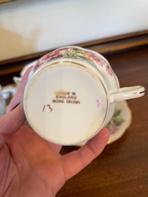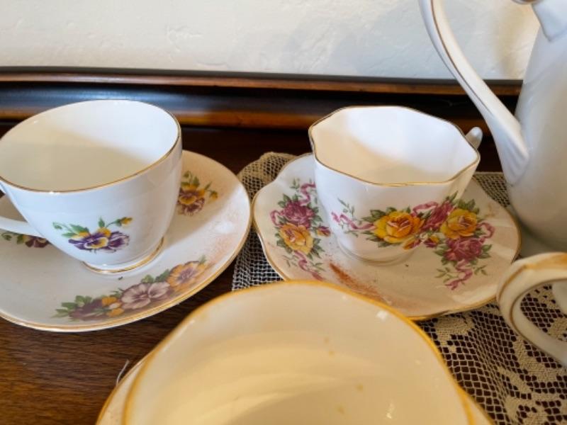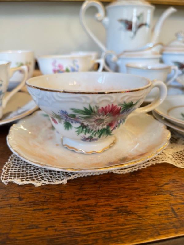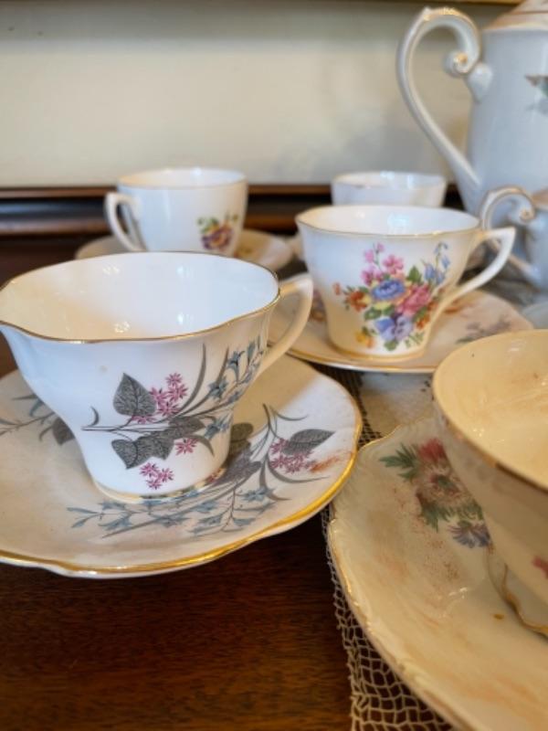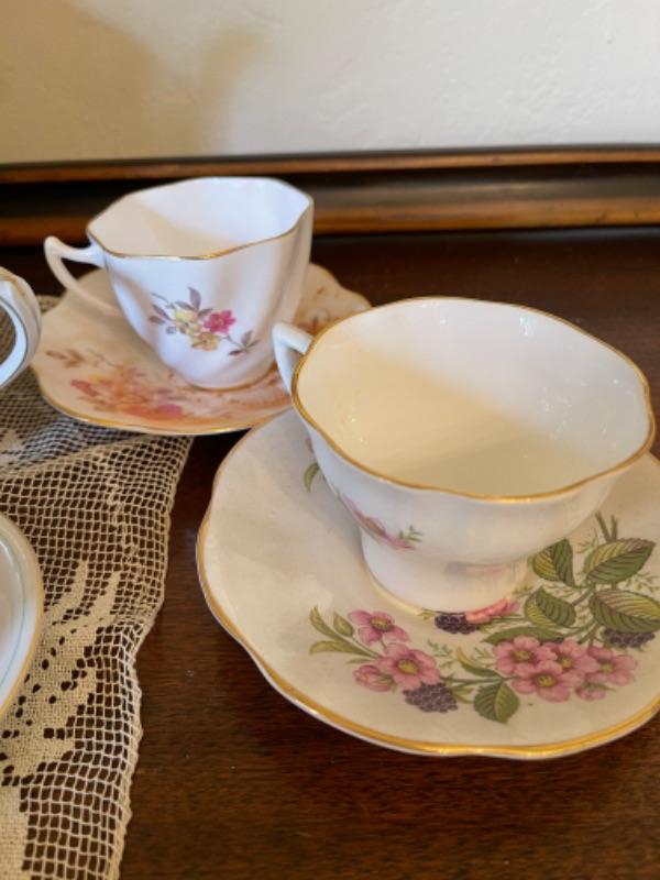 Lot 17. Assortment of English cups and saucers, along with demitasse set (Japan)--Was $45 - - Now $25